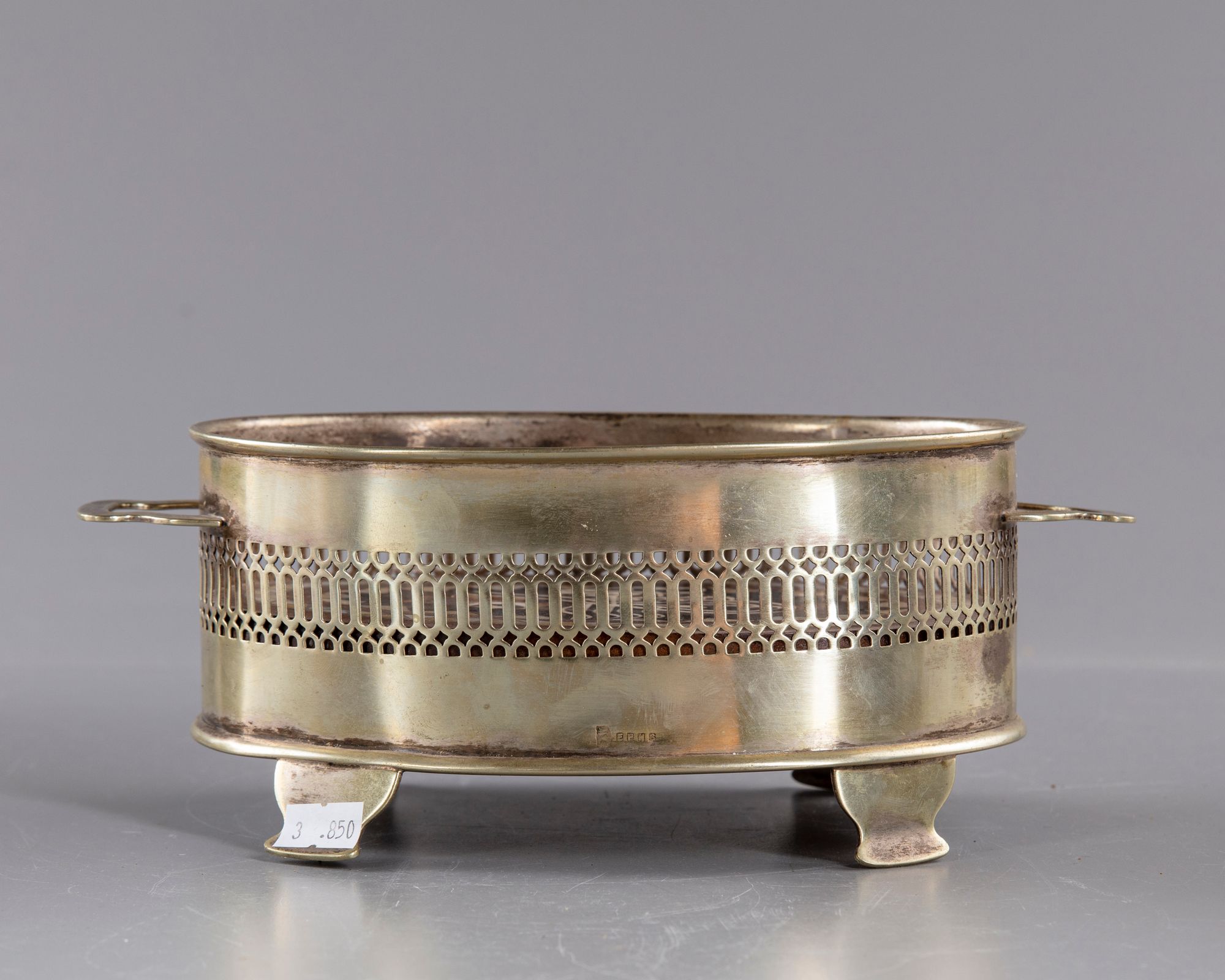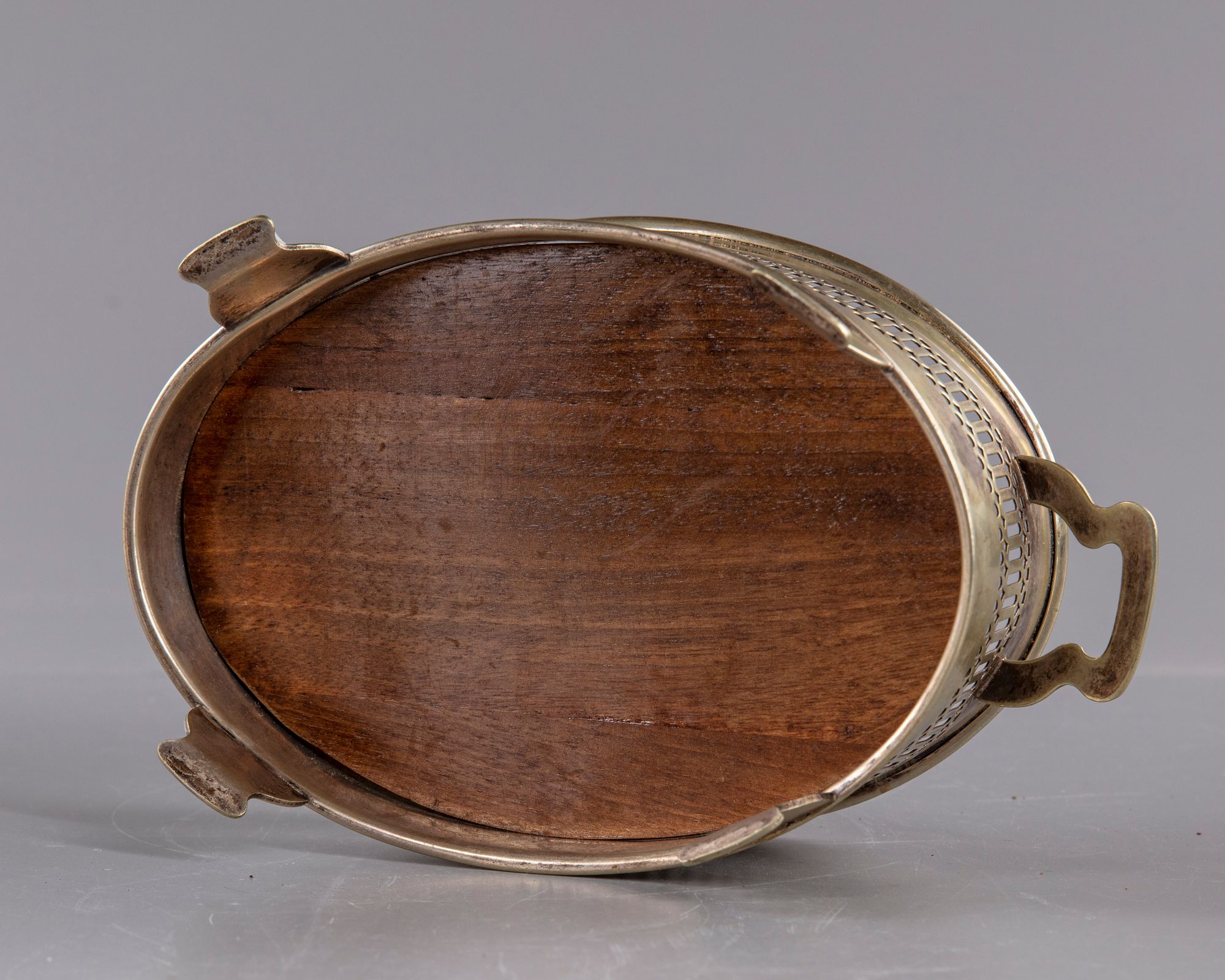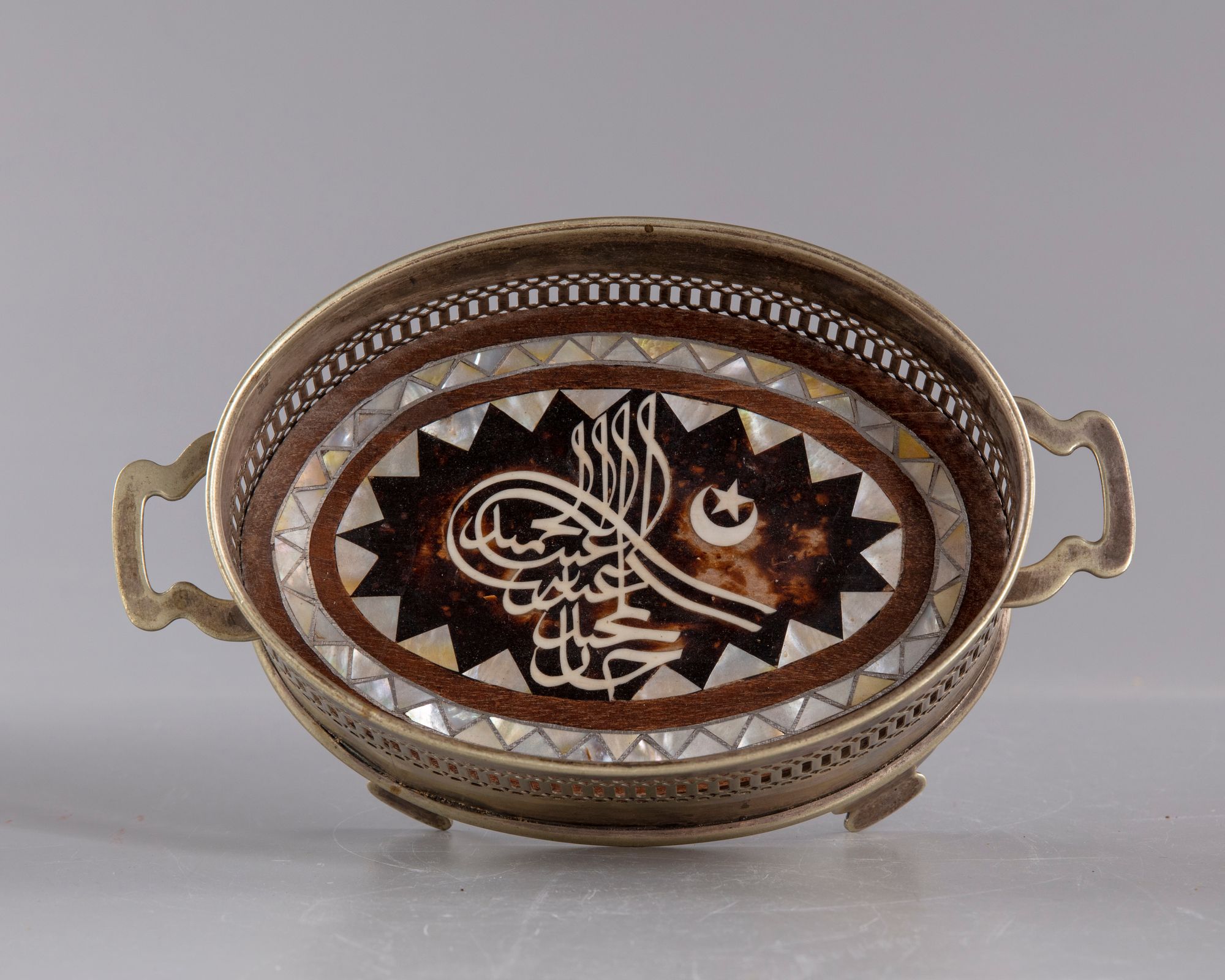 A small Ottoman silver tray with inlays of mother of pearl and turtle shell fragments, stylised with the Tughra of Sultan Abdelhamid.