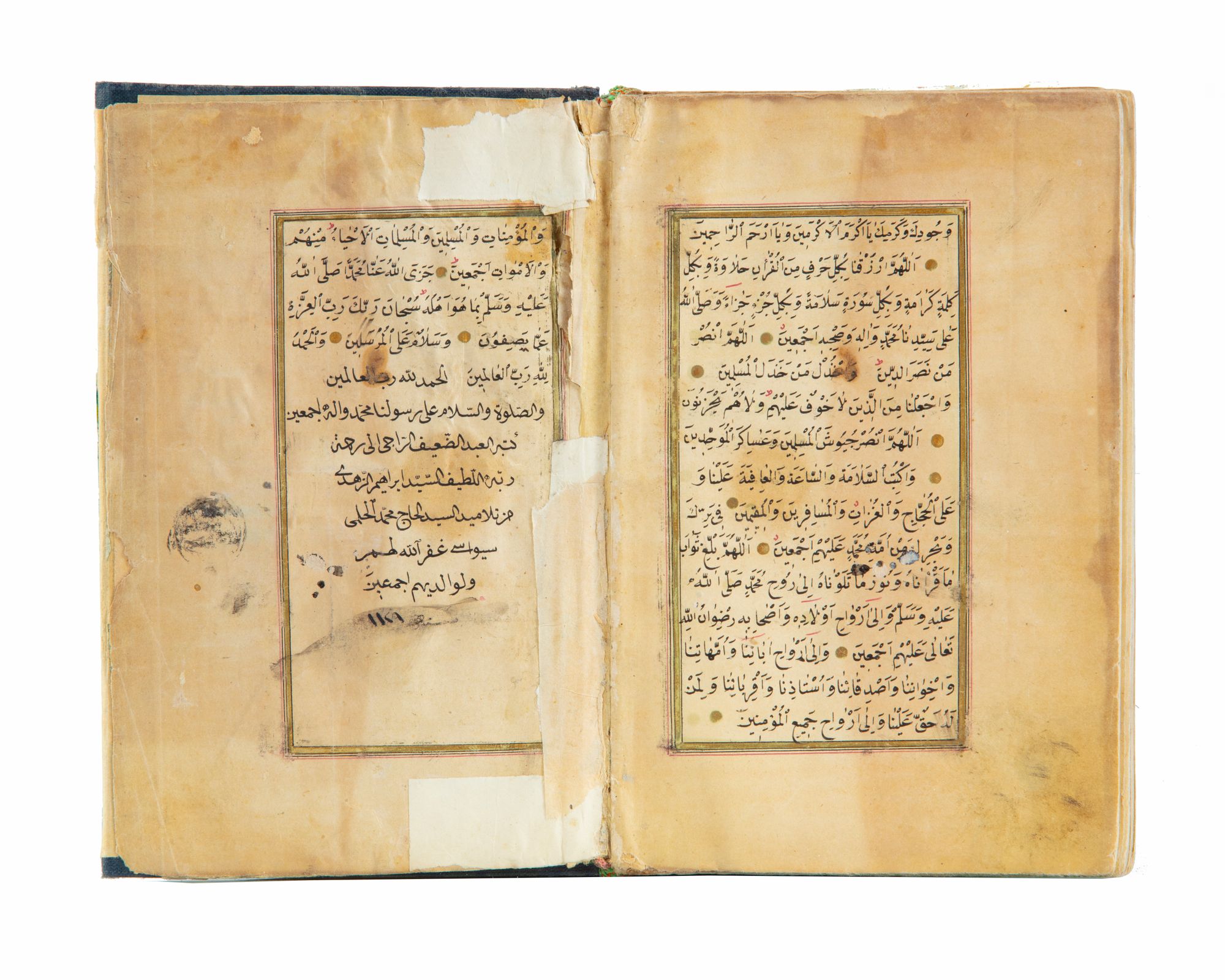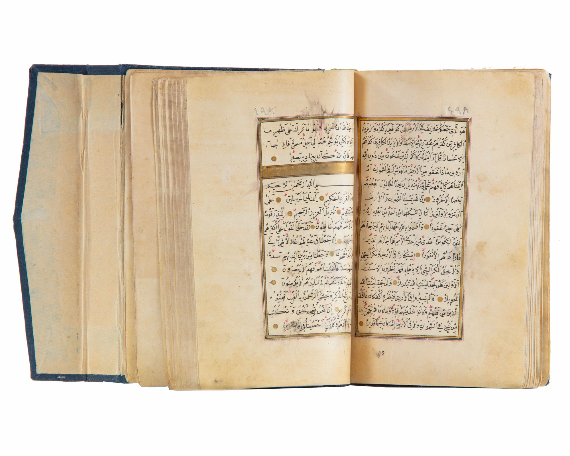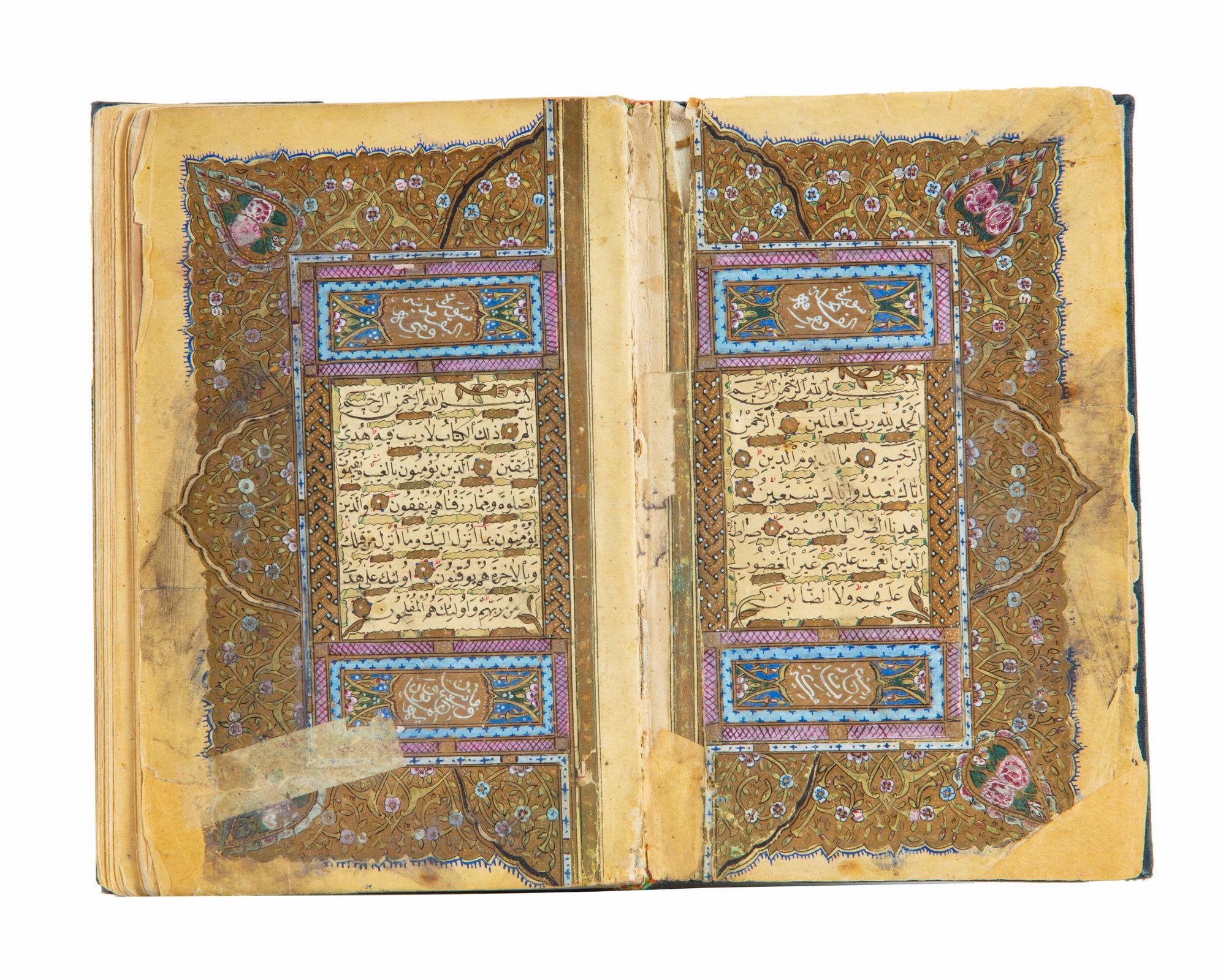 An Arabic manuscript on paper with 332 leaves plus two fly-leaves,15 lines to each page in bold black naskh script within a gilt and polychrome borders. A complete Quran, surah headings in white thuluth within gilt and polychrome cartouches, two opening biofolia with striking blue and gilt decorated borders. Gold verse markers, later green cover. 12 by 17 cm.