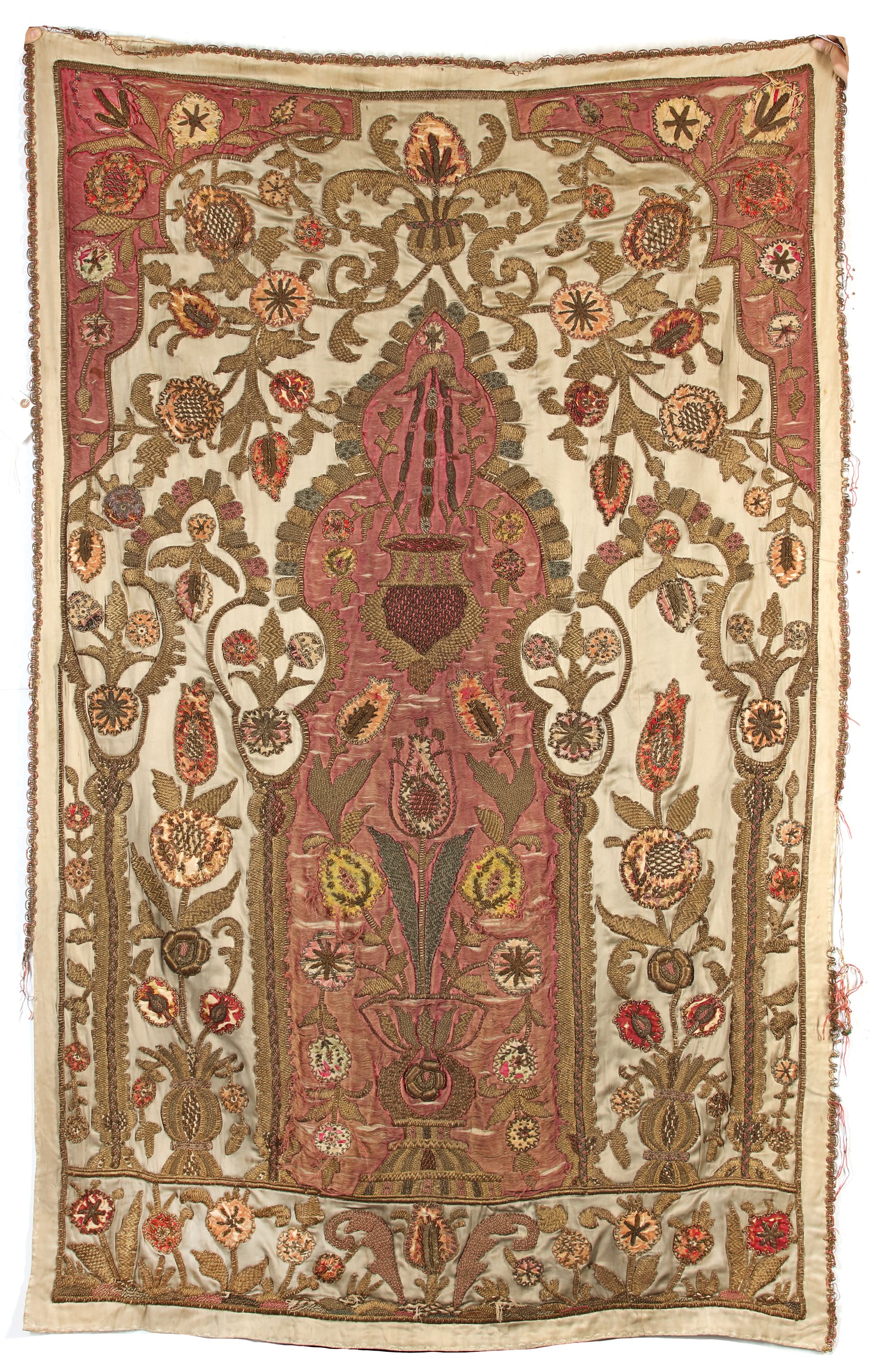An Ottoman hanging panel embroidered on a linen ground in olychrome with two large vases issuing say flowers and leaves forming a Mihrab on an ivory linen ground.