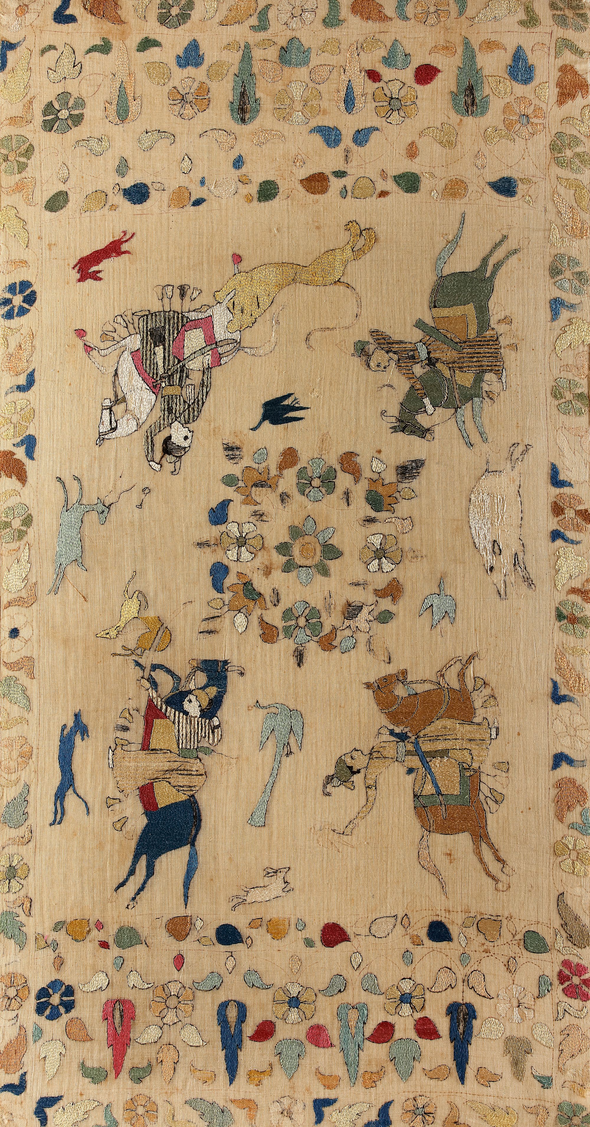 Of rectangular form, embroidered in colorful silk metal threads over an ivory colored ground with four horsemen in a hunting scene, surrounded by a border with repeat pattern of foliage and flower scrolls.