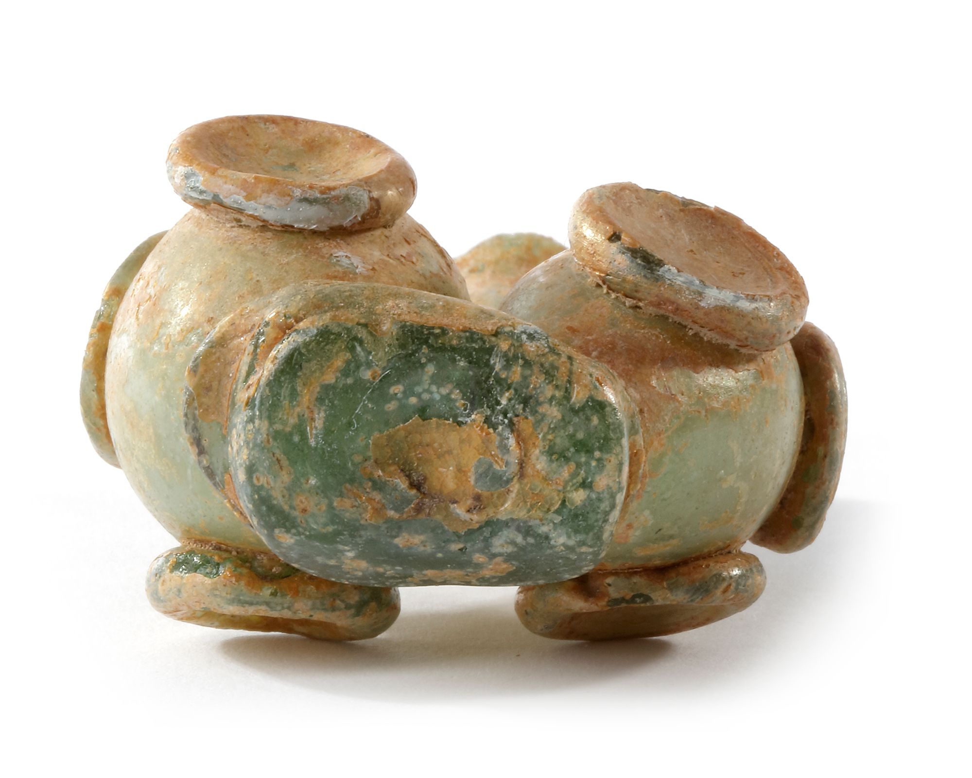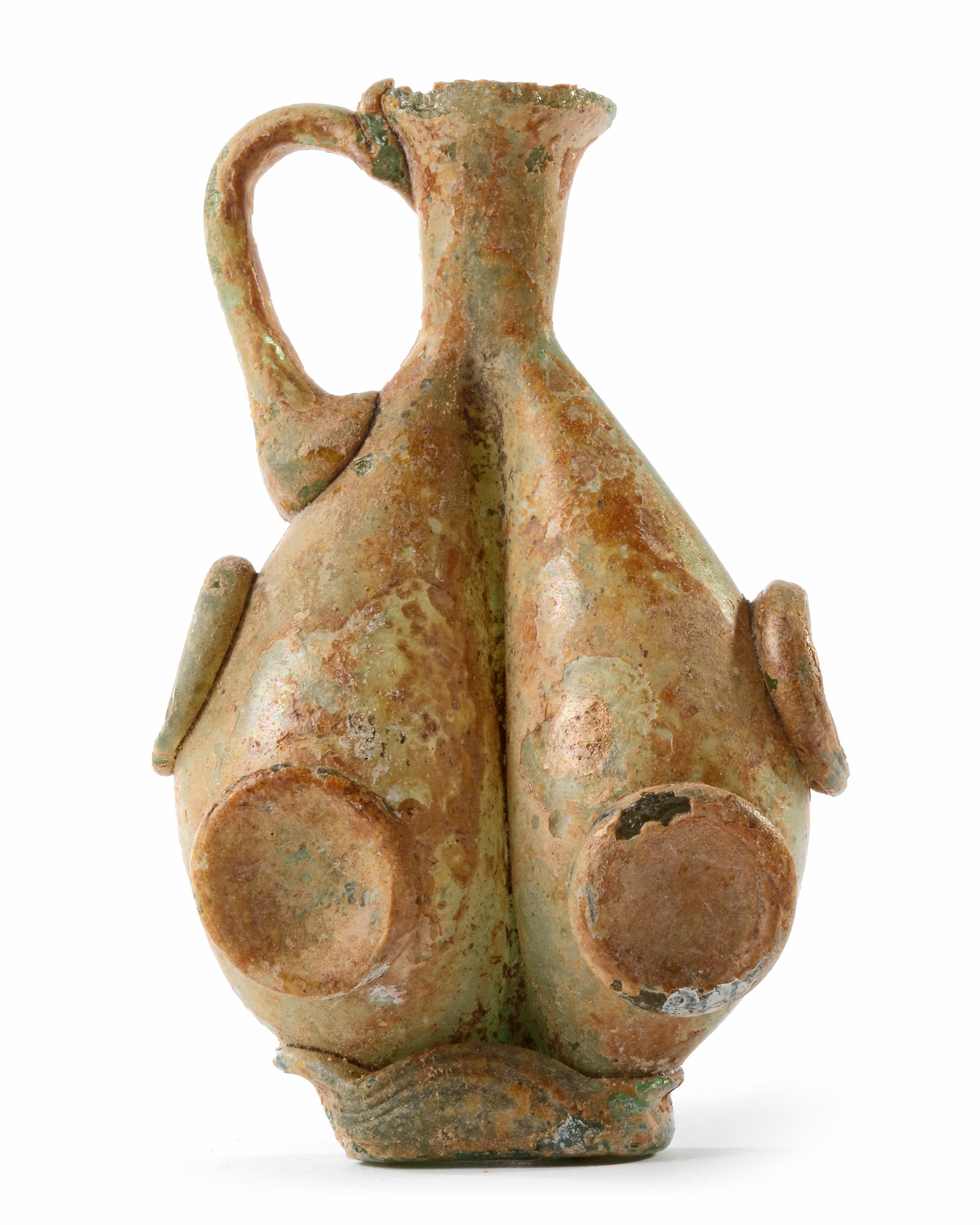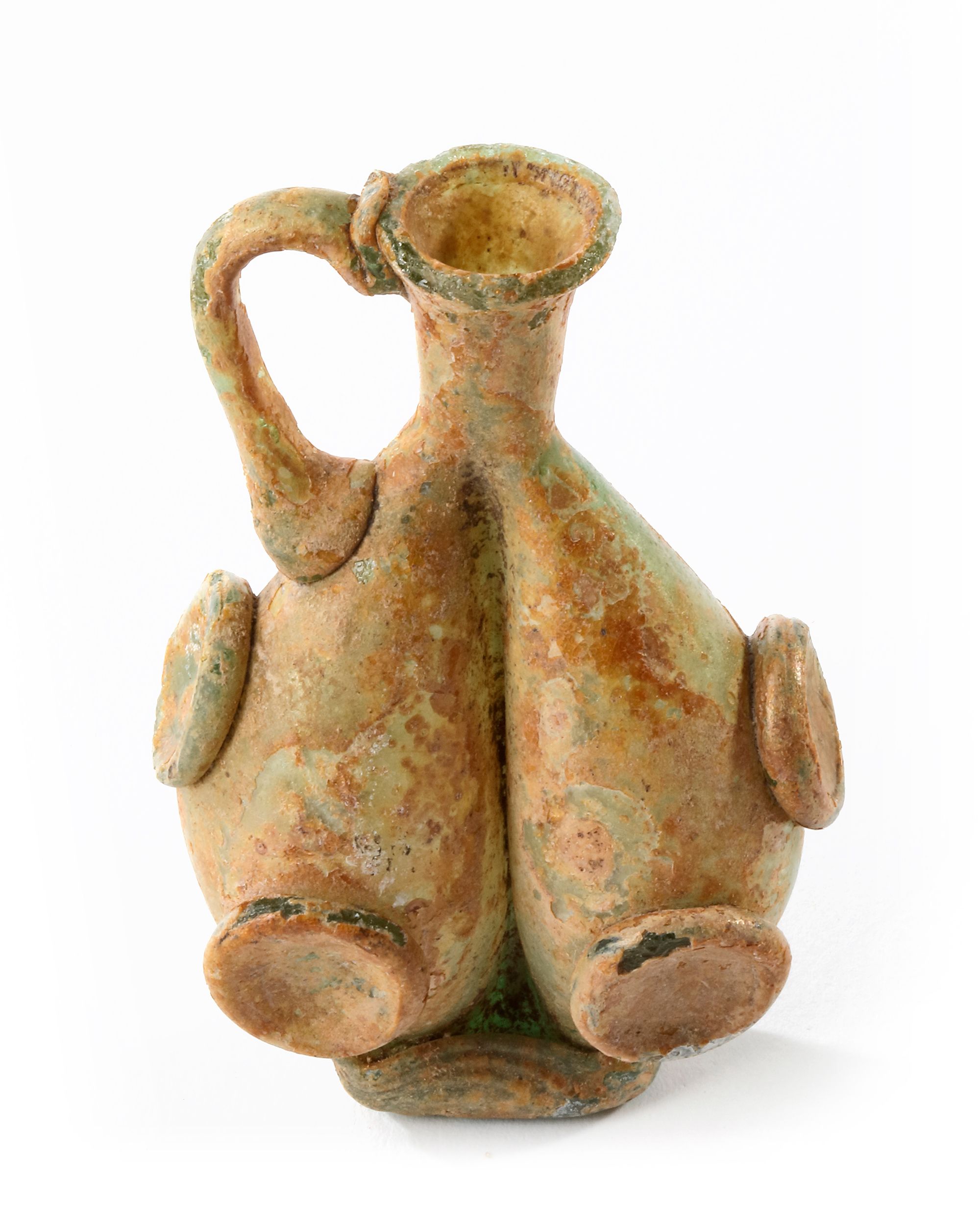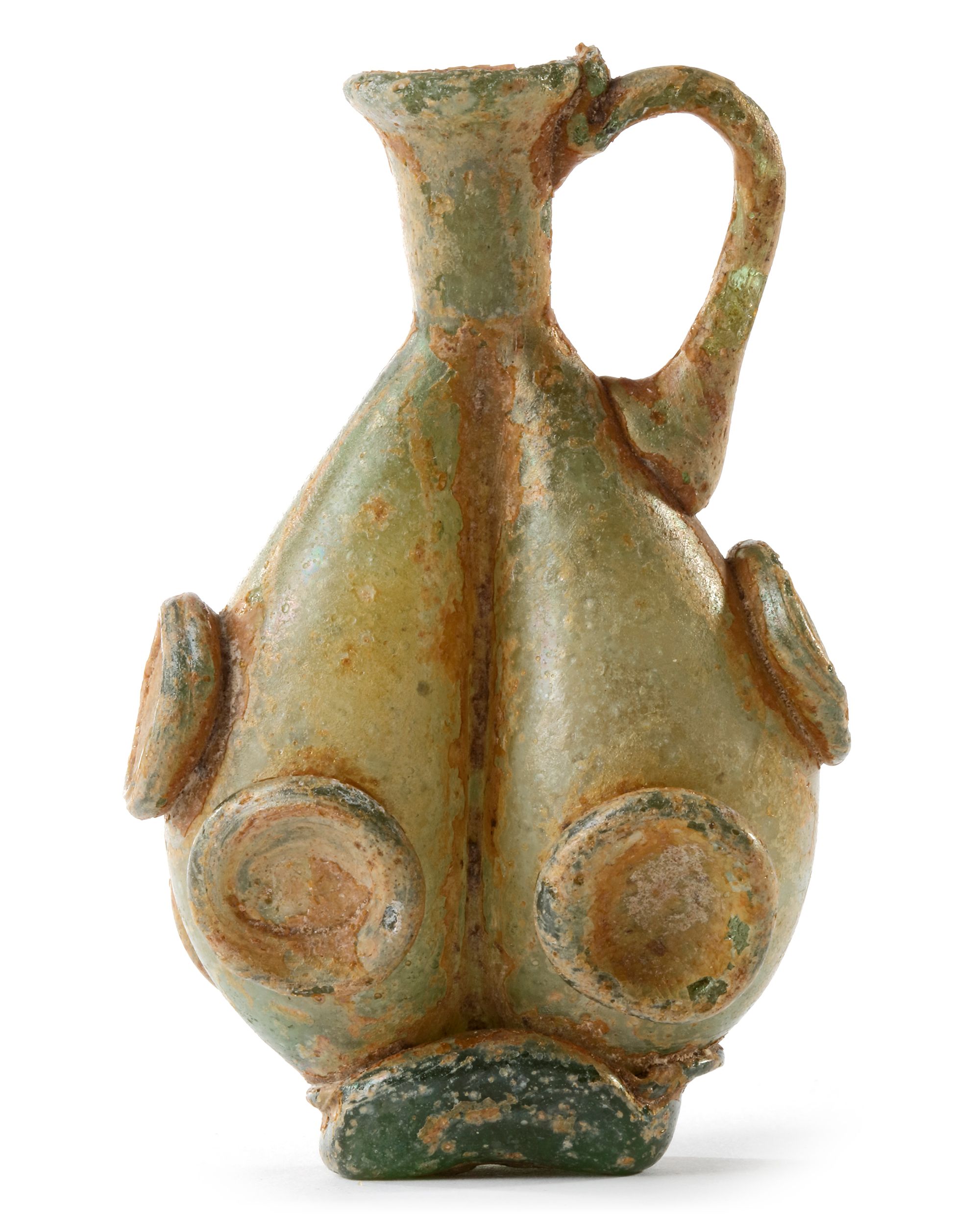 Into two parts with yellow-green tinge, and applied roundels. Intact. Height: 9 cm.