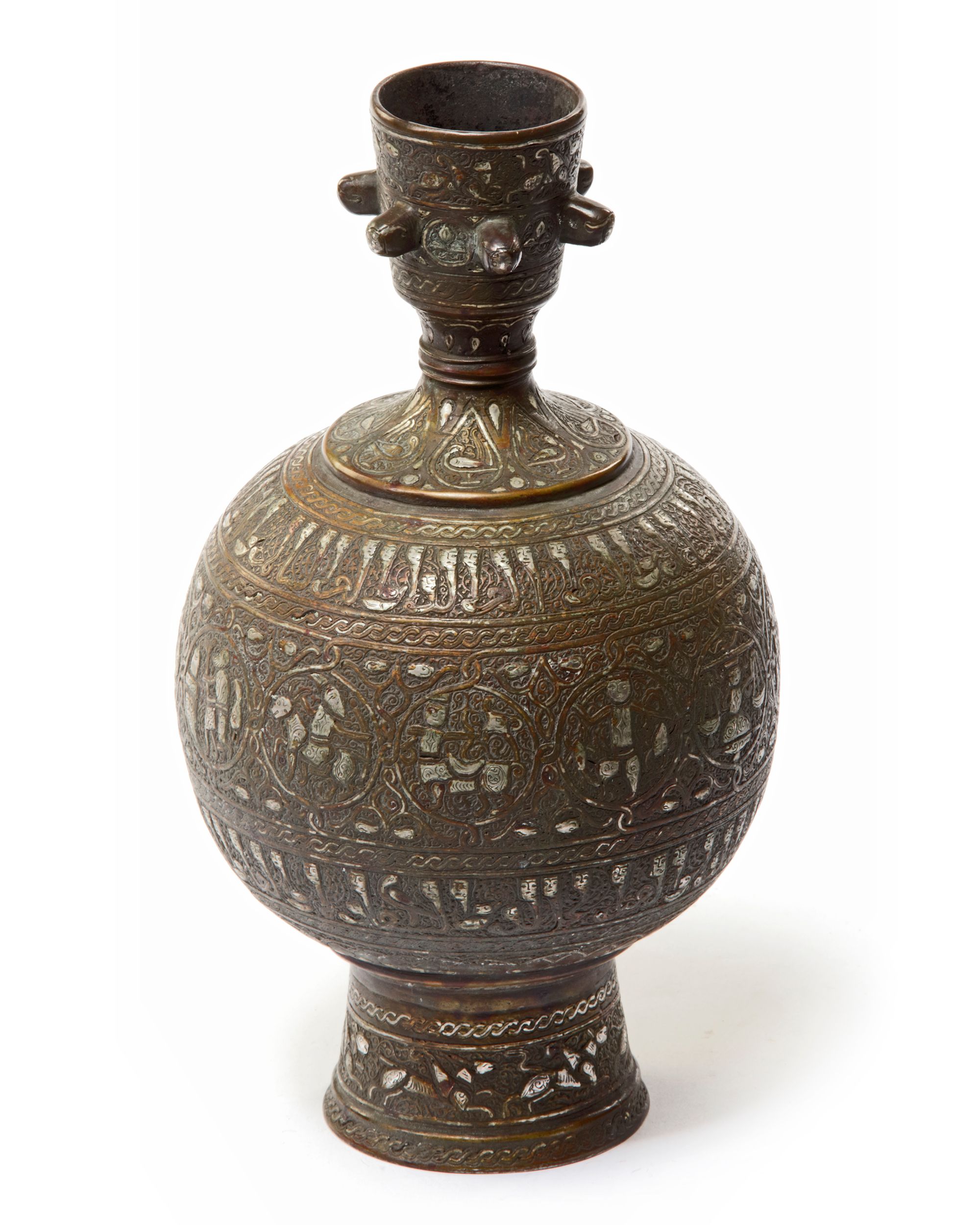 Standing on a high foot with rounded body, waisted neck and flaring mouth, inlaid in silver with roundels enclosing horsemen and seated figures, two band of Kufic script.