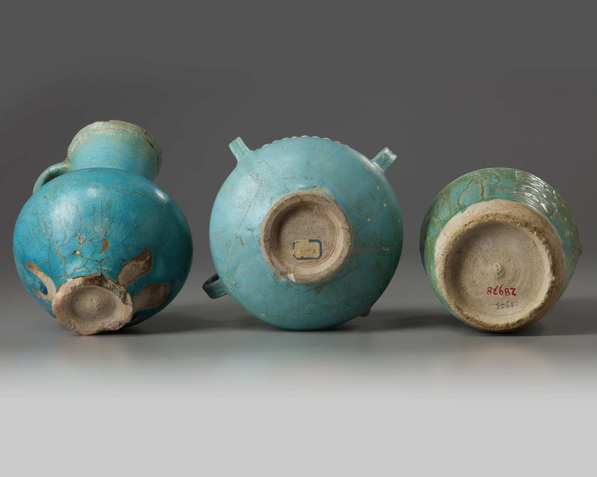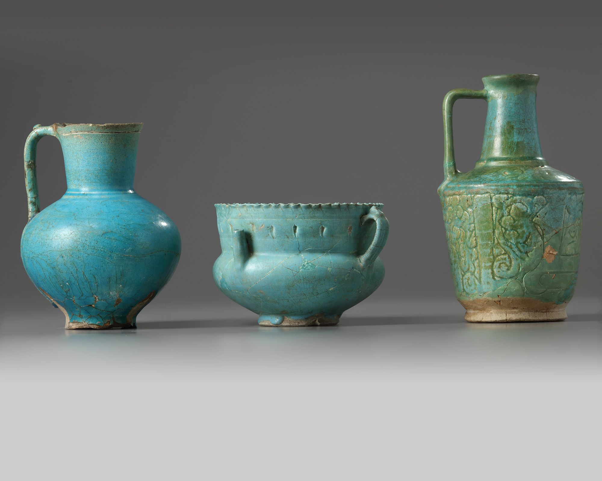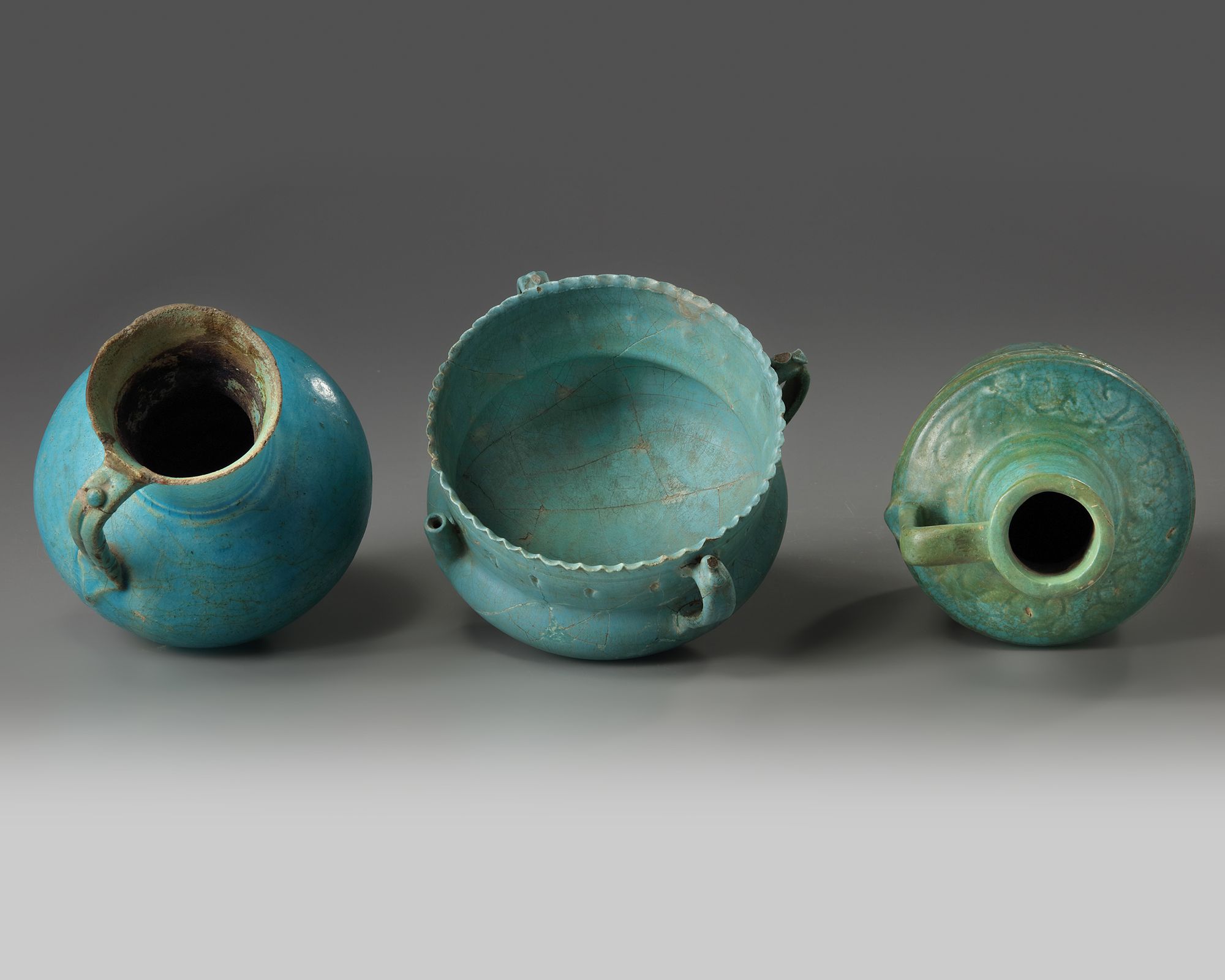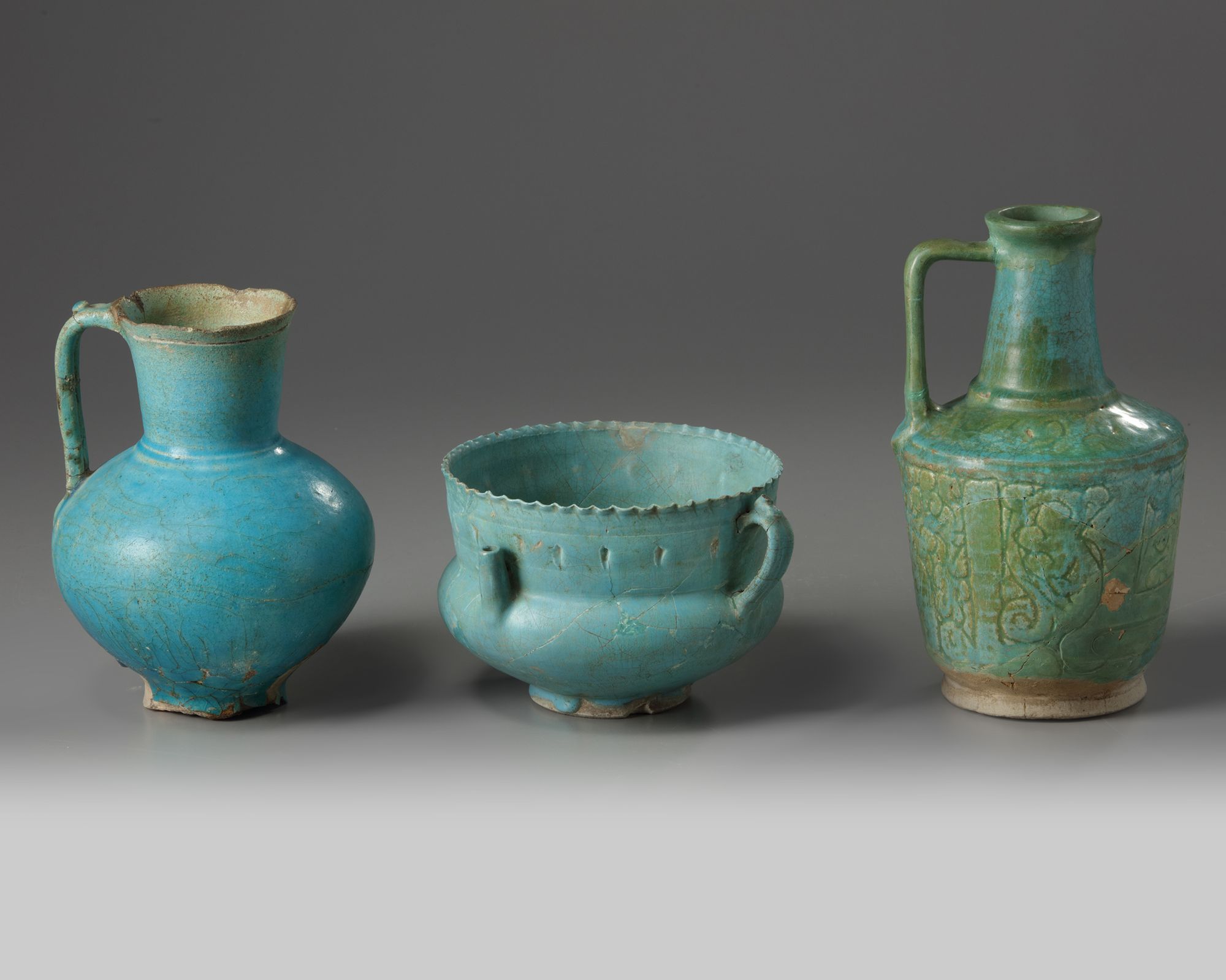 Of baluster form, with short trumpet unglazed foot and tall neck, with a straight handle, connecting the neck with a broad rounded body ,covered all in a turquoise glaze,19.5cm. -The jug with a cylindrical body and a broad shoulder with a straight handle, connecting the body with a long tapering neck, 22.5cm. -A bowl, standing on a small flaring unglazed foot with a rounded body, cylindrical neck and a carved rim with three straight handles connecting the rim with the body and a short straight spout, covered in a turquoise glaze.