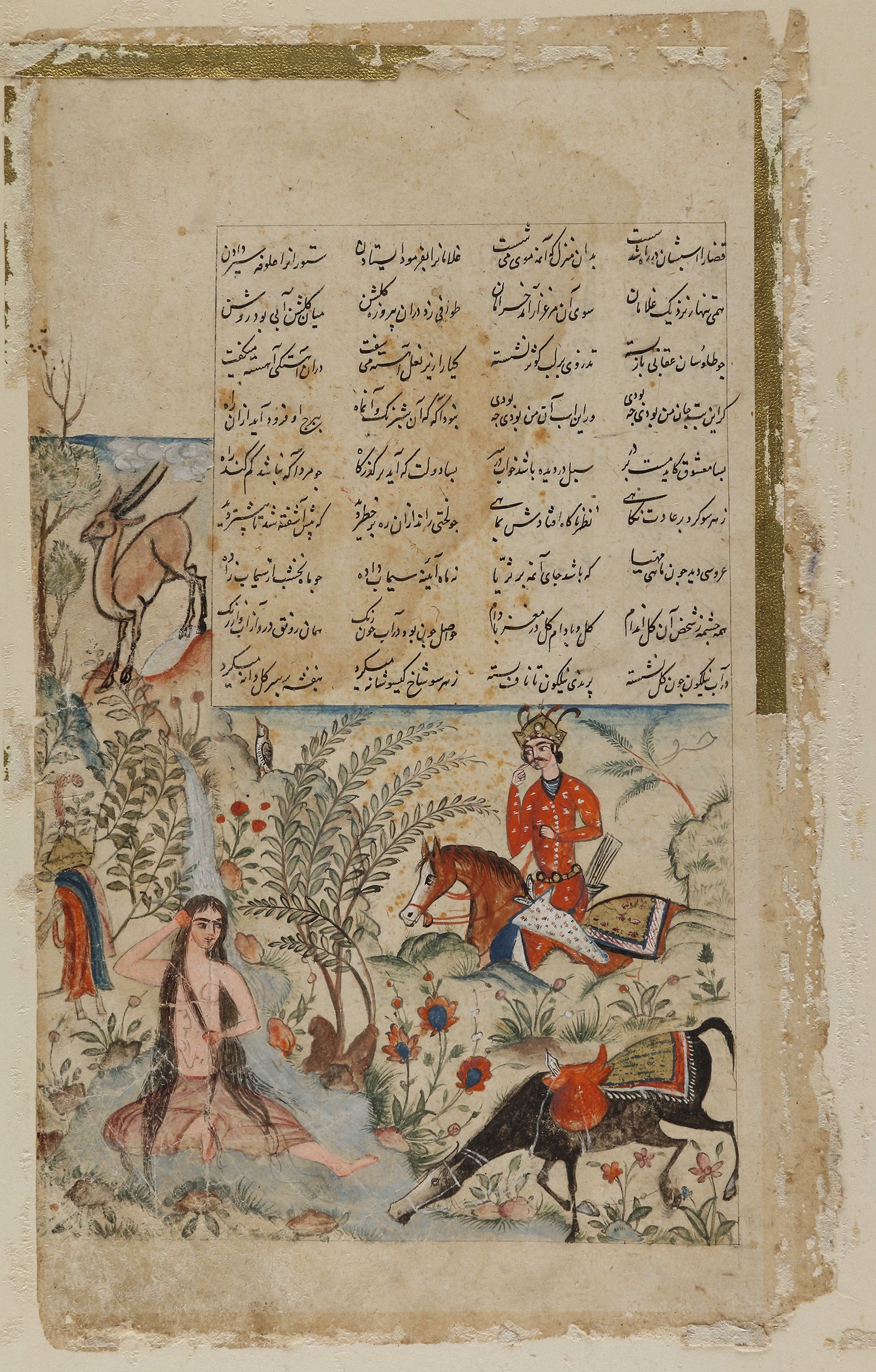 PERSIAN MINIATURE A prince meets a naked woman combing her hair. With calligraphy Watercolour (laid down on paper)