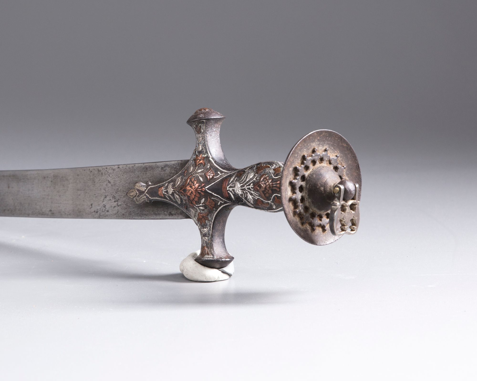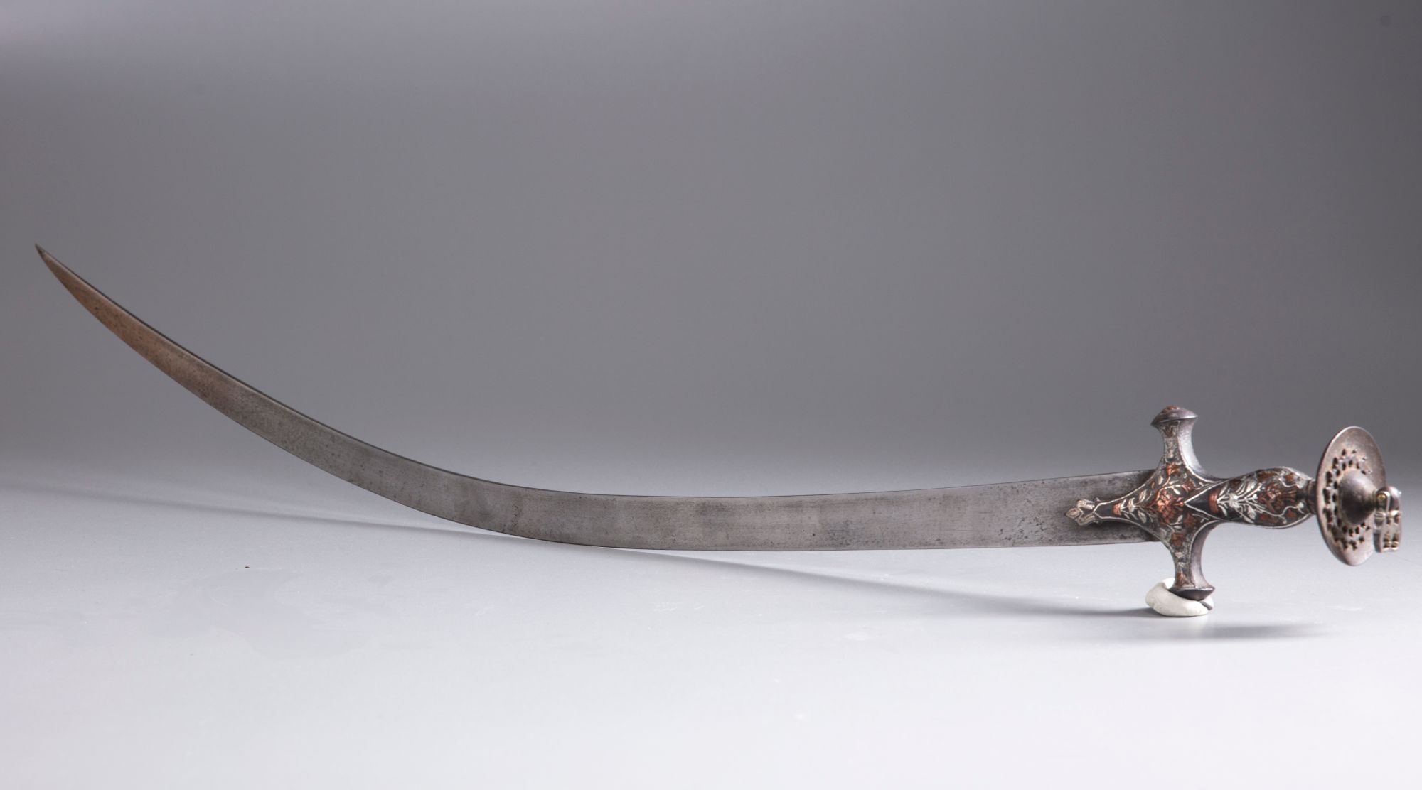 An islamic sword, curved single-edged blade with thick forte.The cast brass hilt with copper and silver inlay. Length of the blade 82.00 CM.
