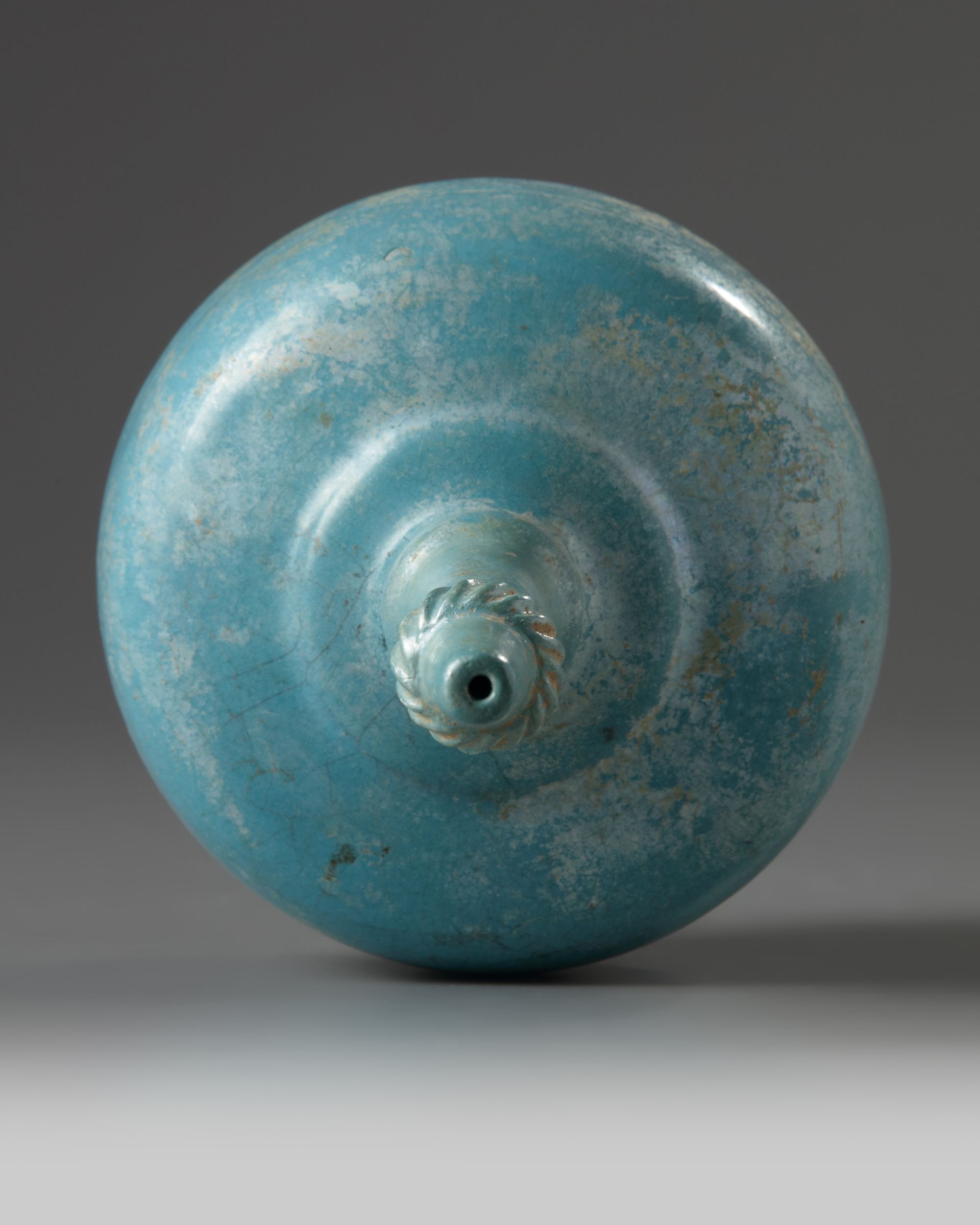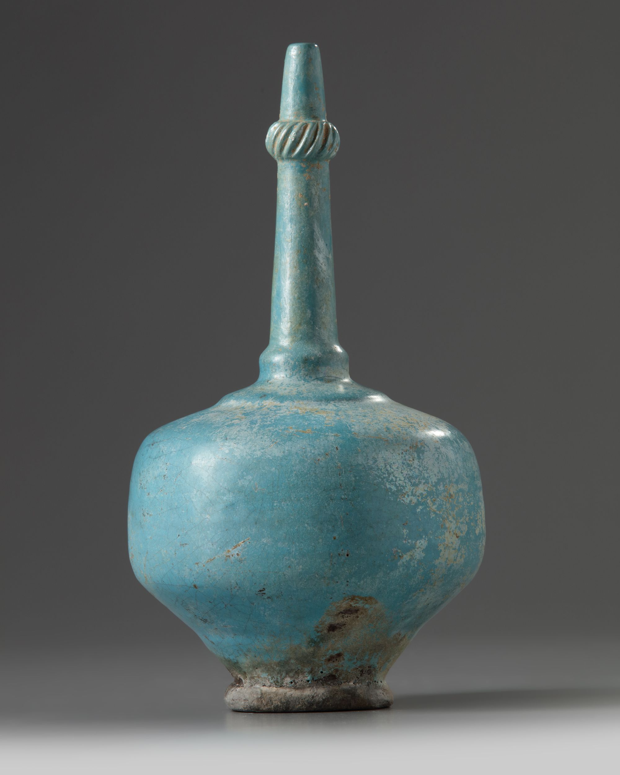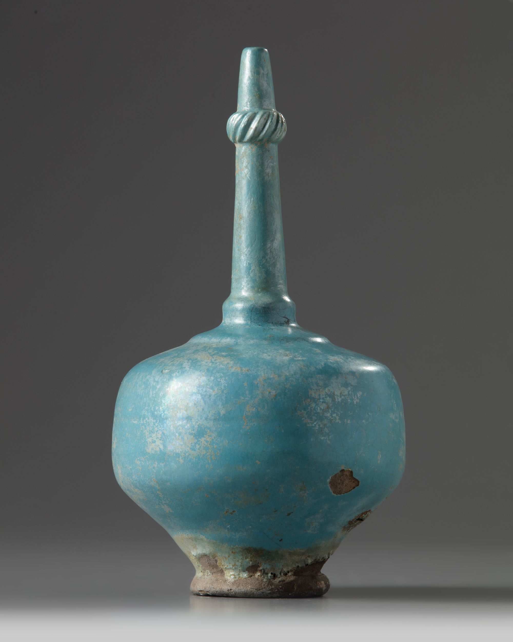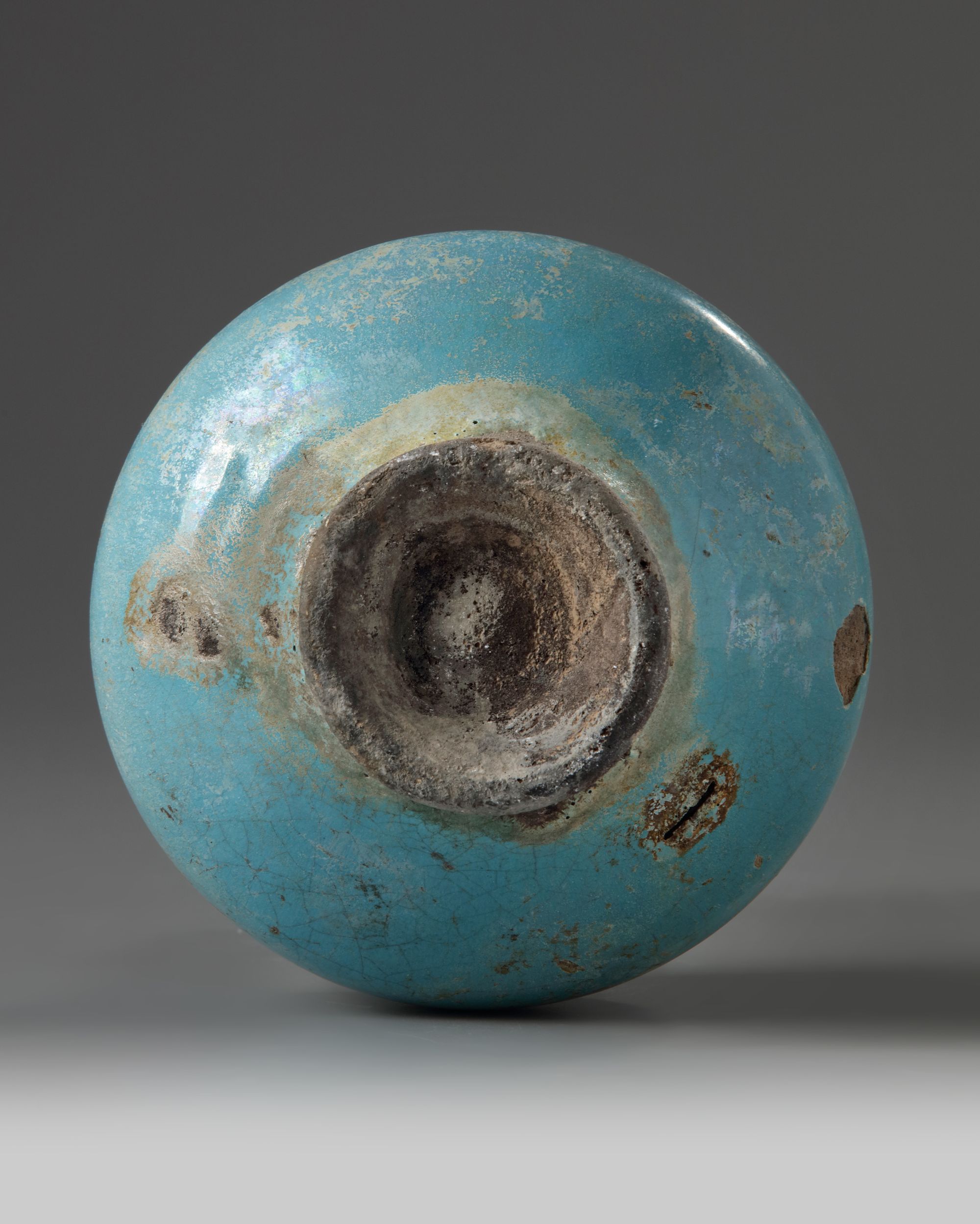 The bottle vase standing on a small unglazed base with a long neck tapering downwards to meet the broad shoulder, covered all in a turquoise glaze.
