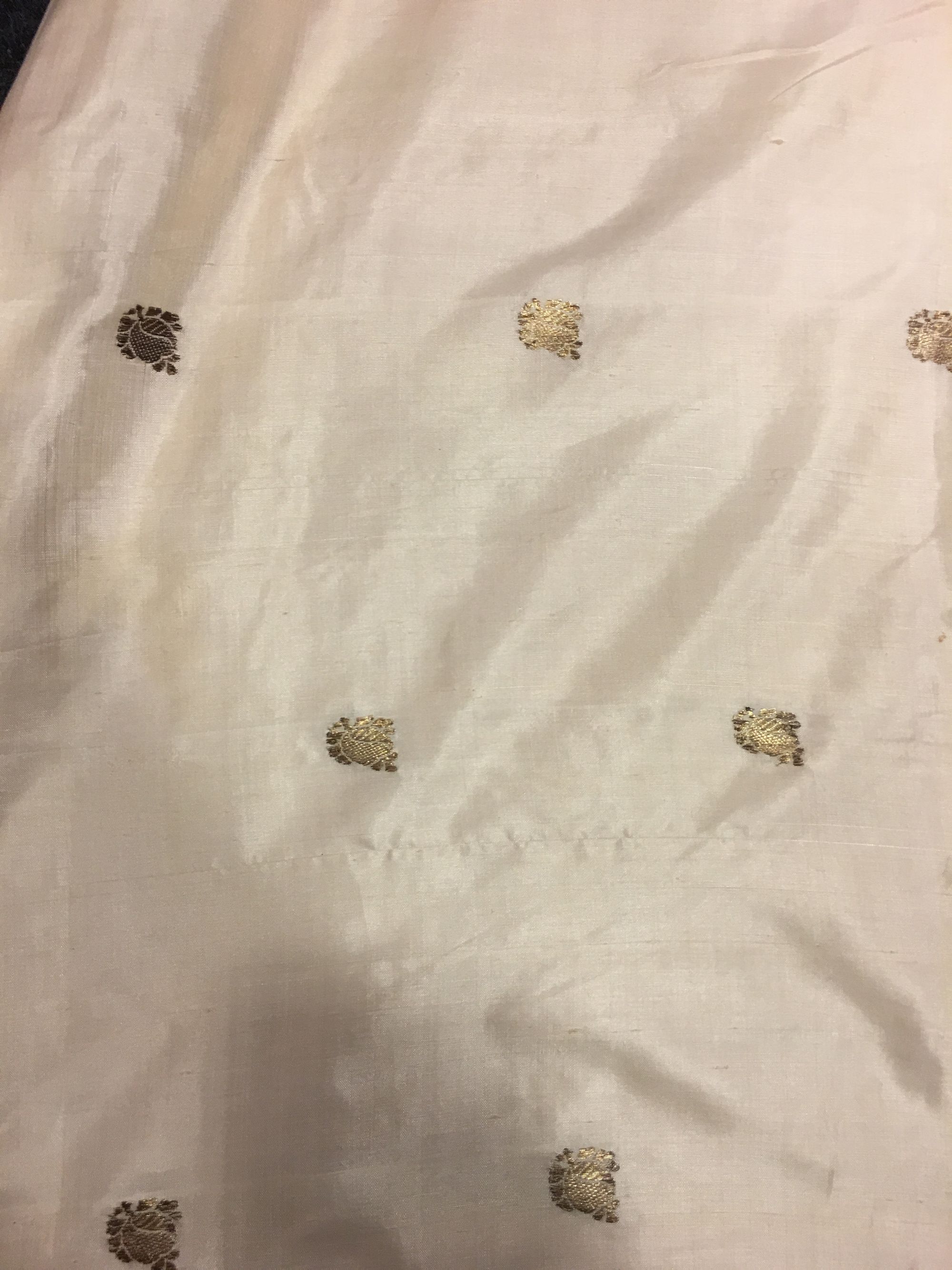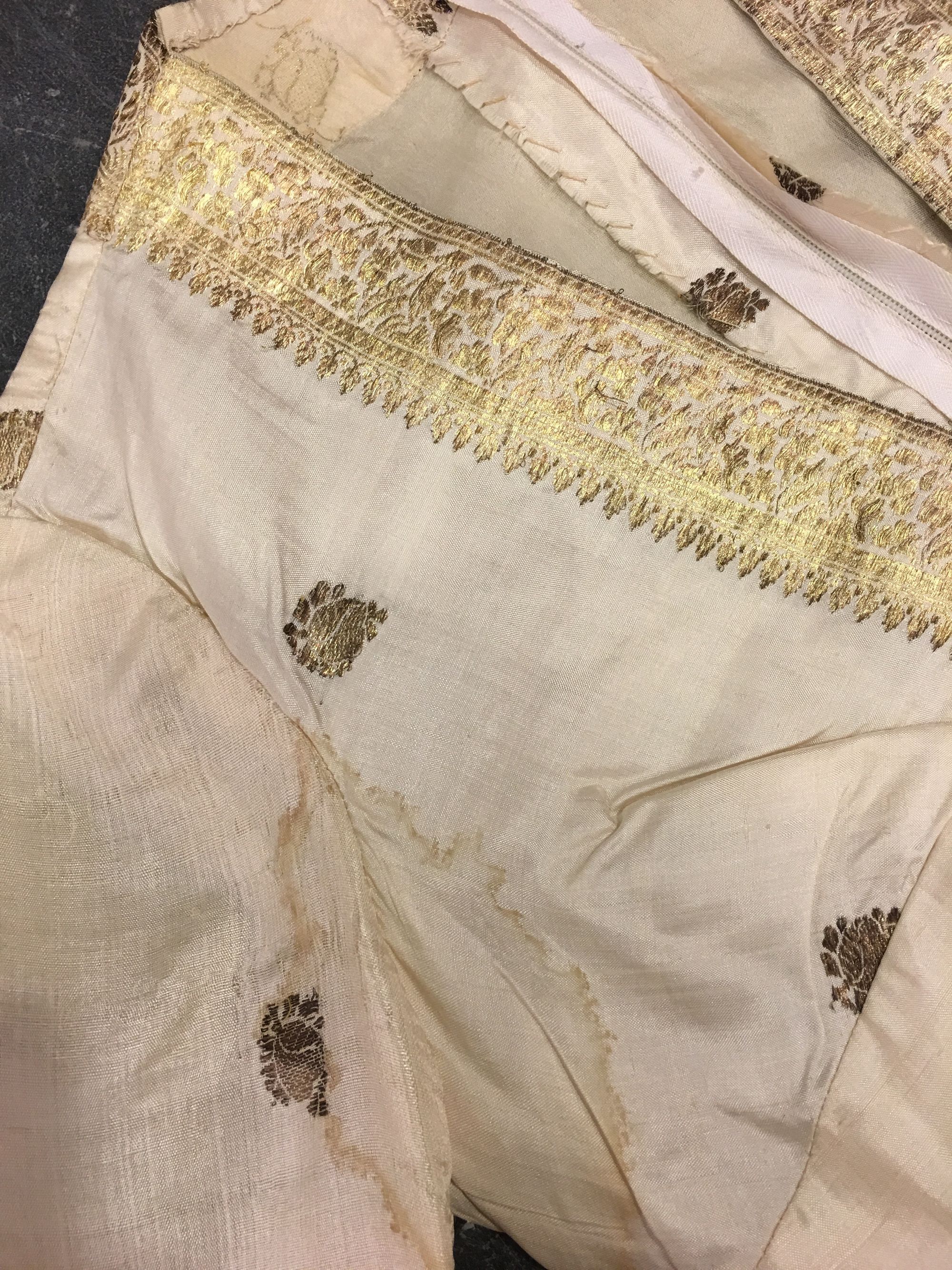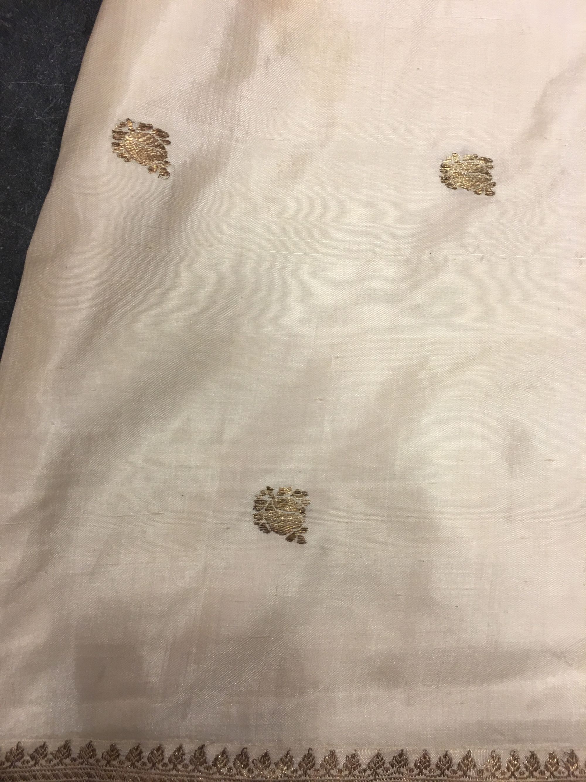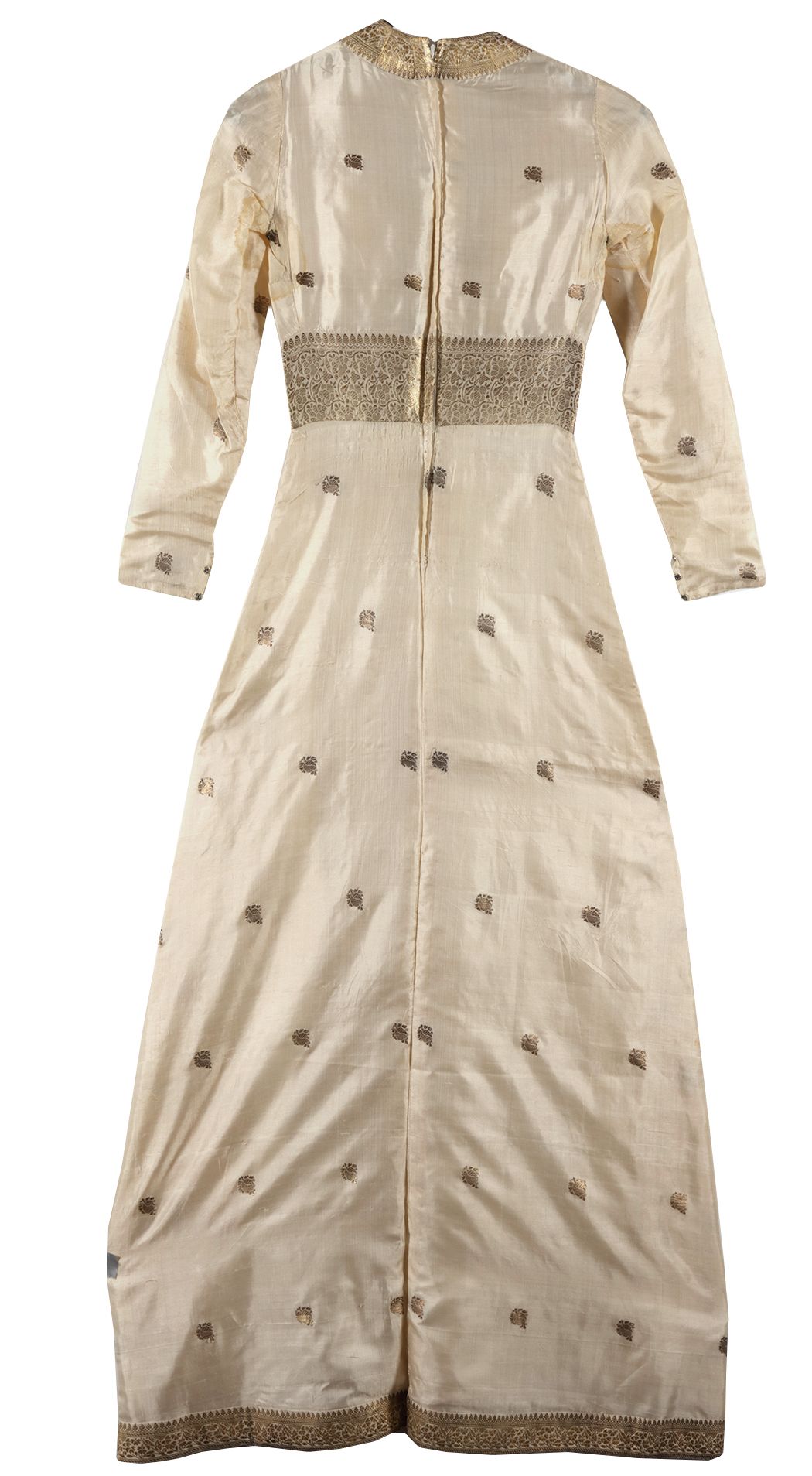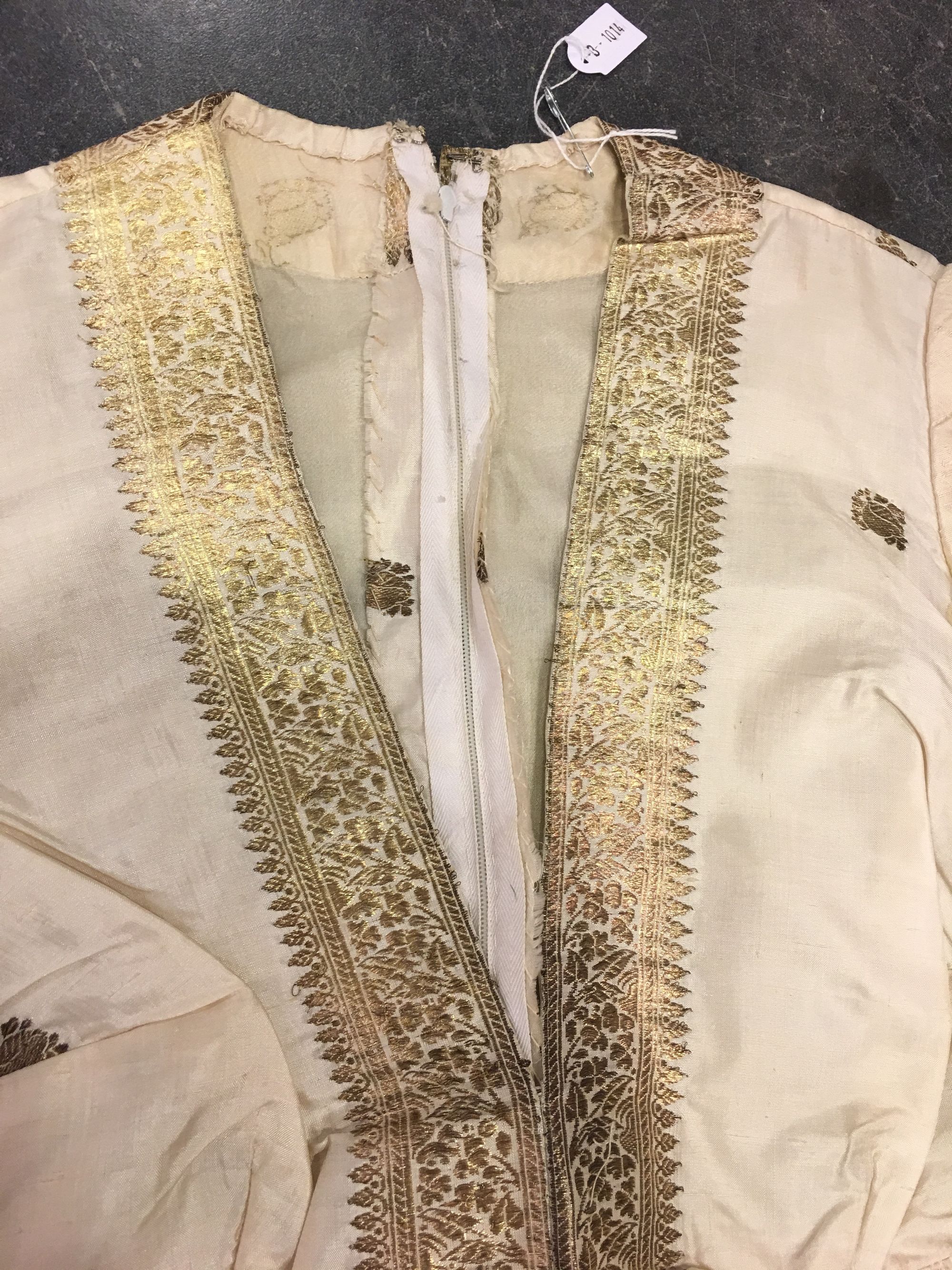An Ottoman silk ivory coloured robe, embroidered in silver threads with foliage.