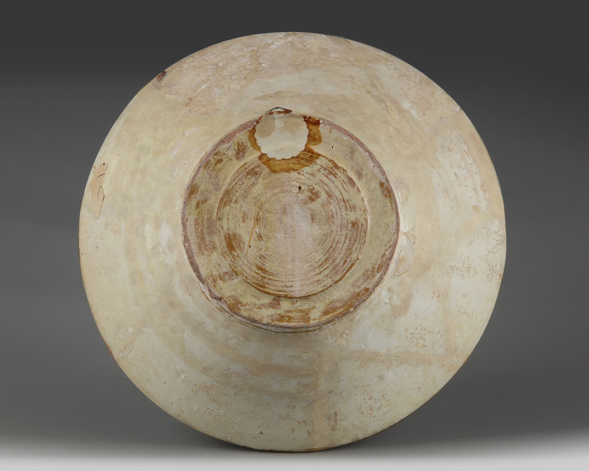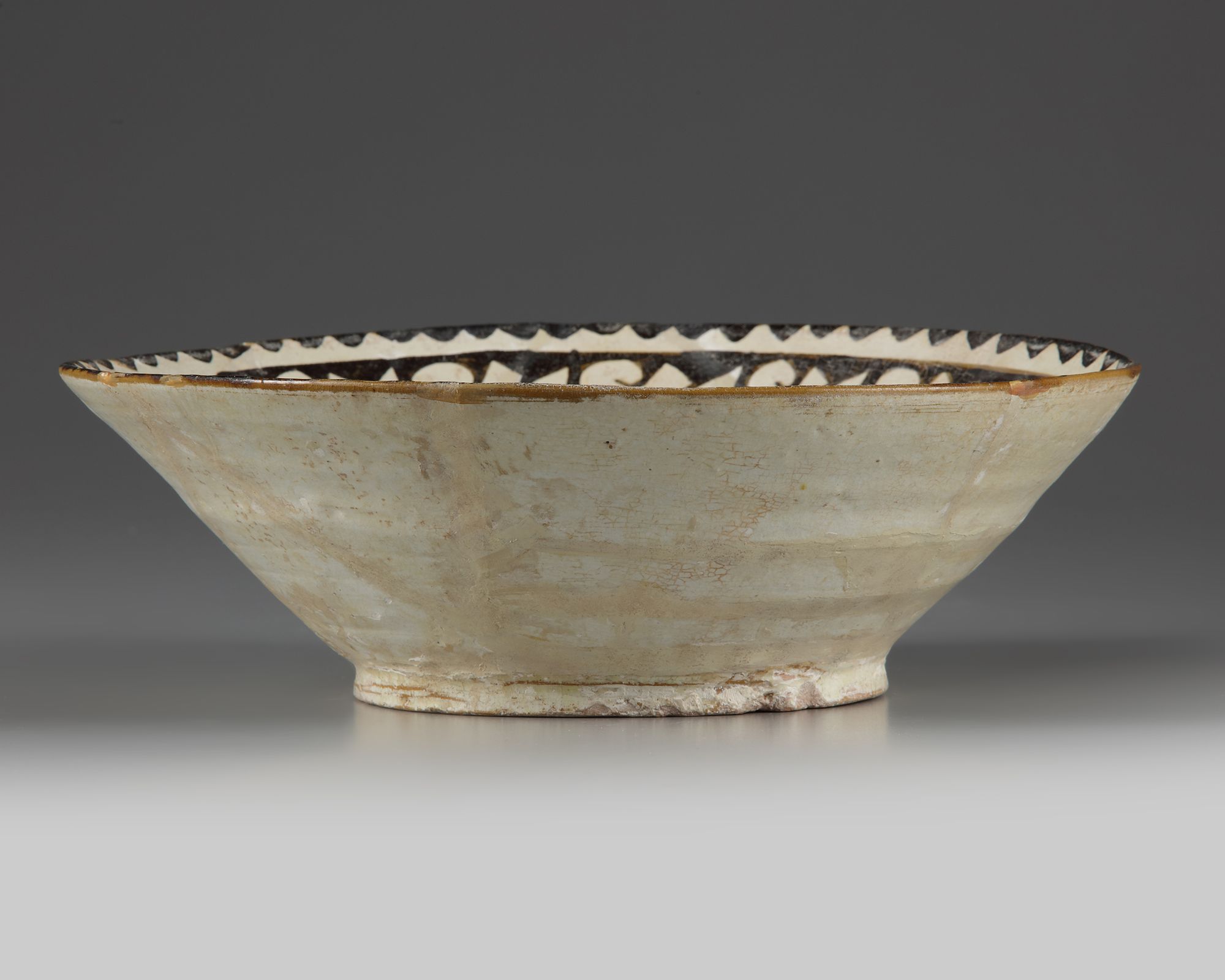 A slip-painted pottery bowl Persia, 10th century Of conical form on a short foot, decorated in manganese on a cream ground with a central roundel containing a foliate motif, the side with a band containing a repeat design of cartouches containing foliate motifs.