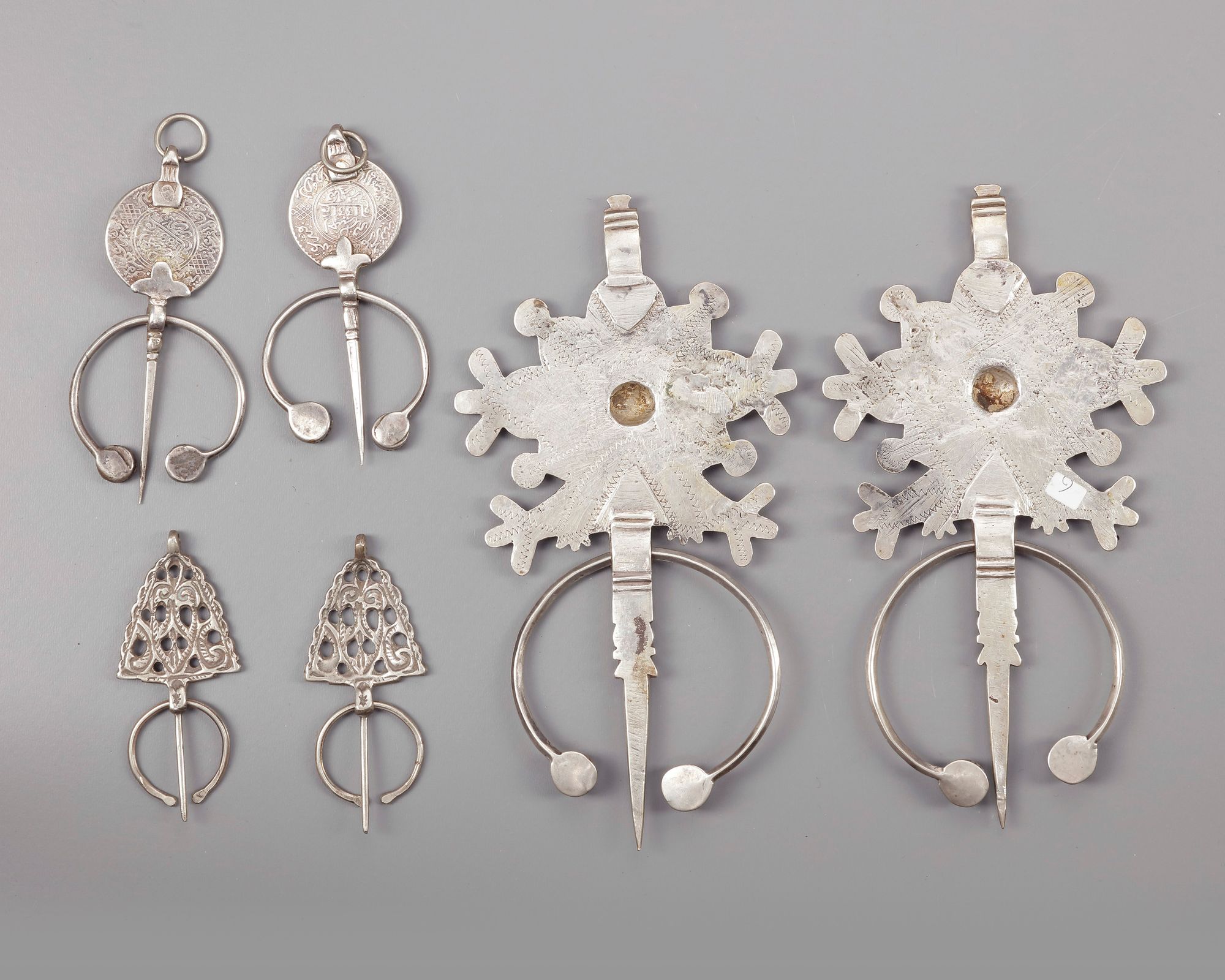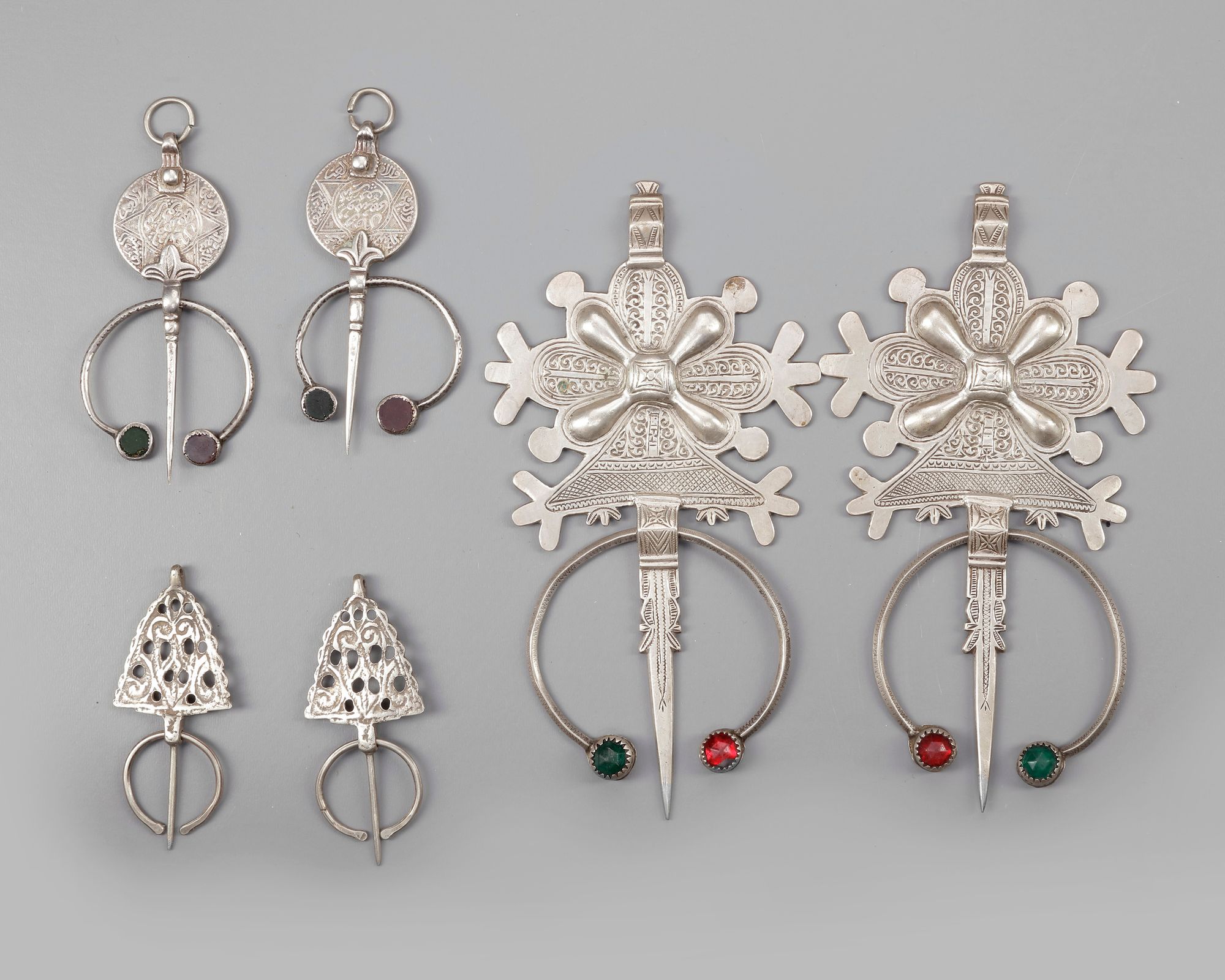 Fibulae were commonly worn by women as an everyday adornment whilst going about daily work as well as on special occasions. It is essentially a cloak fastener, comprising an ornate metal triangular, round or oval shape with detailed etchings in filigree or enamel, and a pin which serves to fasten two layers of material together. They were usually worn as a pair. These type of Fibulae are worn by Berbers, the indigenous ethnic group of North Africa.