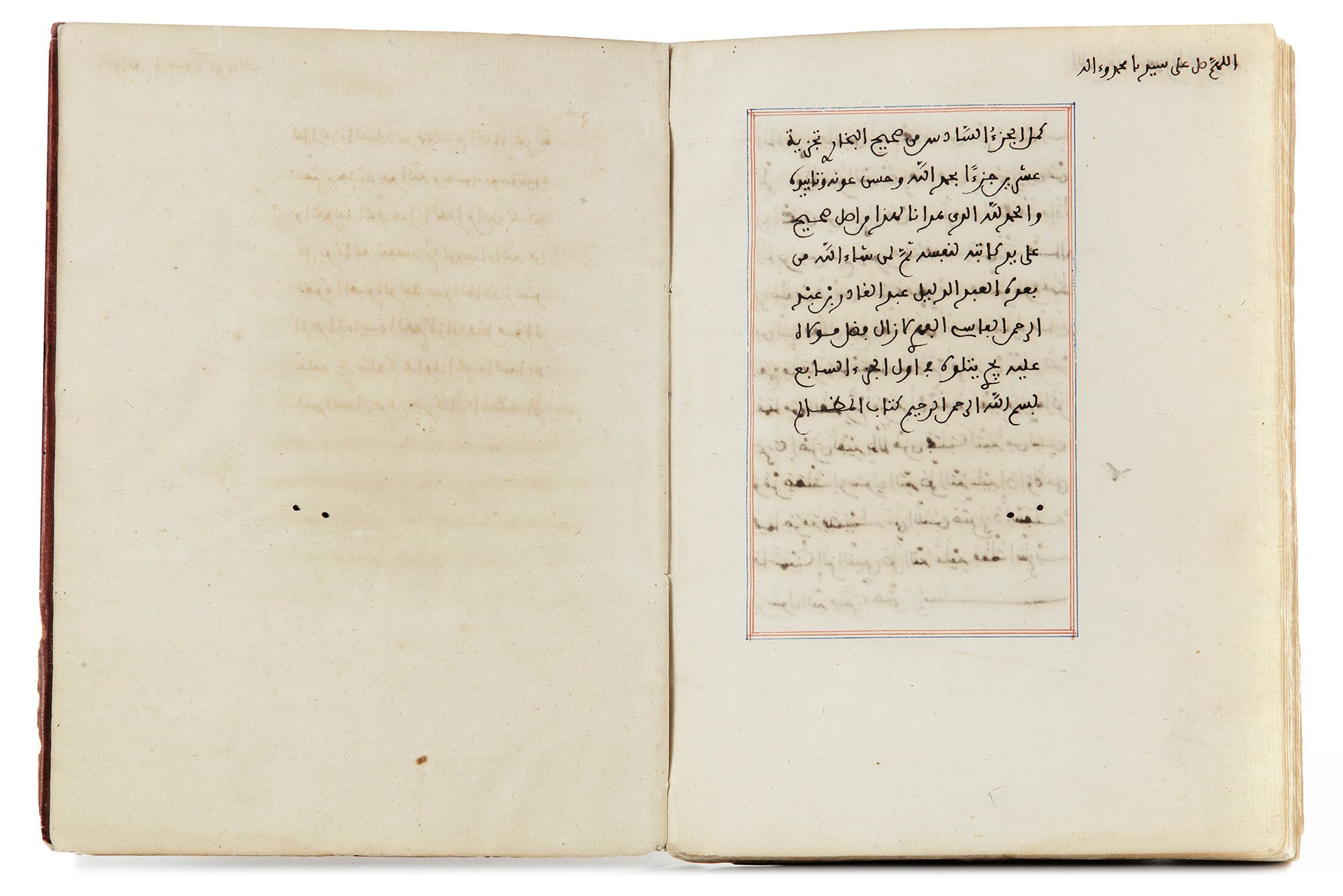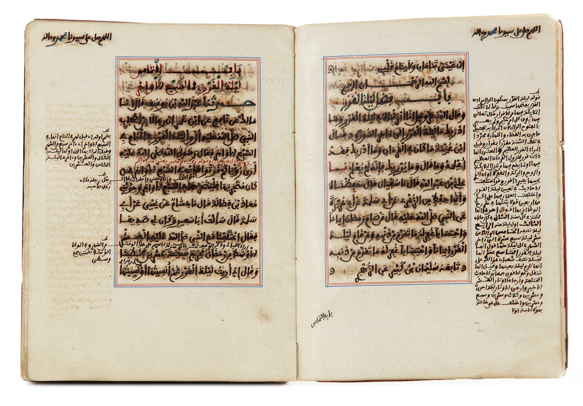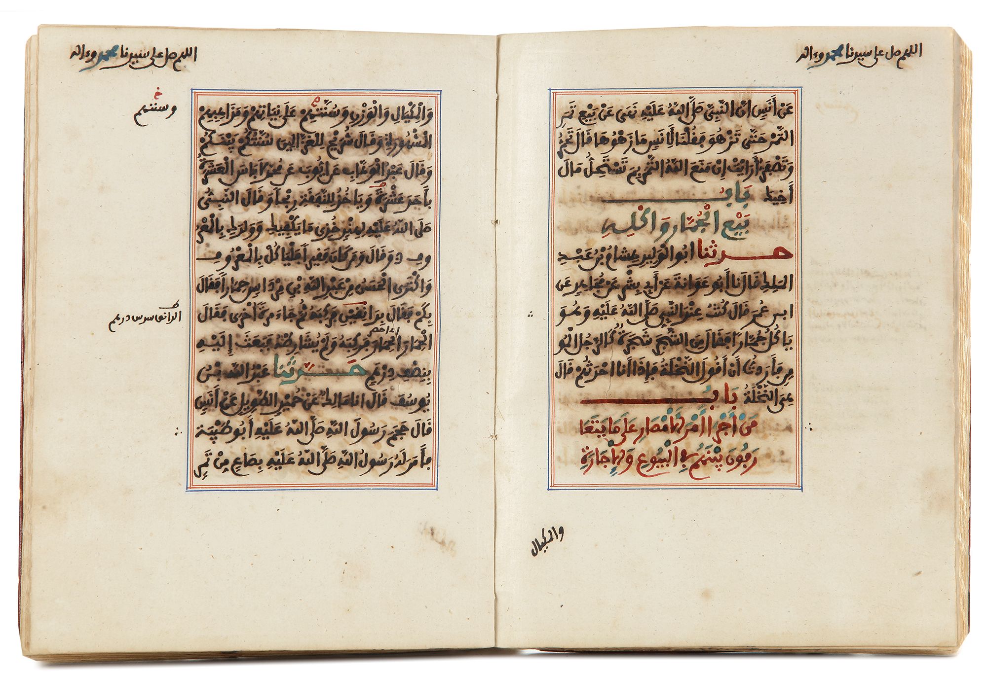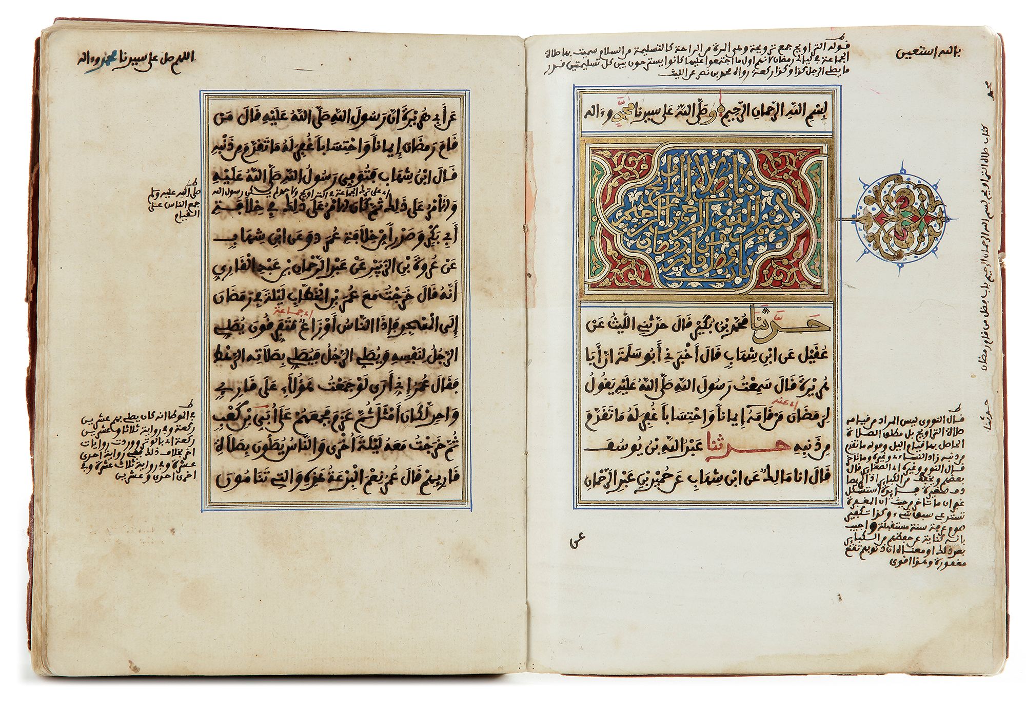 Arabic manuscript on paper, of 13 lines to each page, 161 leaves and 16 written in bold Maghribi script. Titles and catchwords in blue and red color, within a blue and red border, occasional marginal notes, one opening leaf with striking blue and gilt decorated borders. 21 by 16 cm.