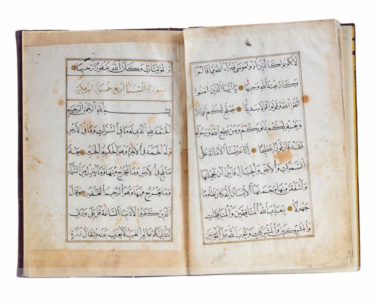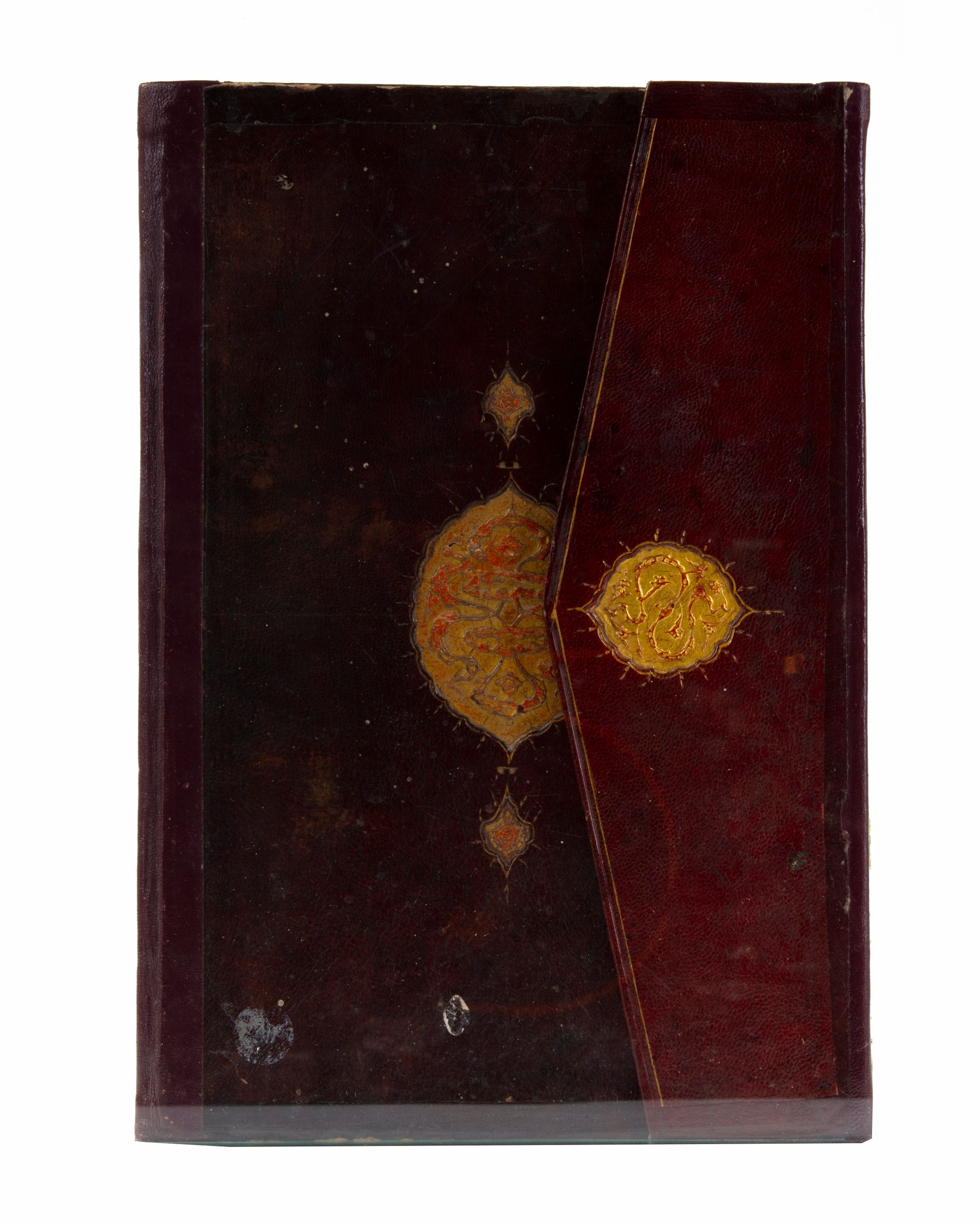 An Arabic manuscript on paper with 18 leaves and 1 fly leave, 9 lines to each page in bold black naskh script. Comprising Quran juz 22, surah headings in gold naskh. Gold verse markers surrounded in black and pointed in red and blue , Al-tajwid in red ink. All within gilt and black borders, brown morocco binding stamped with gilt medallions and a flap. 23 by 33 cm.