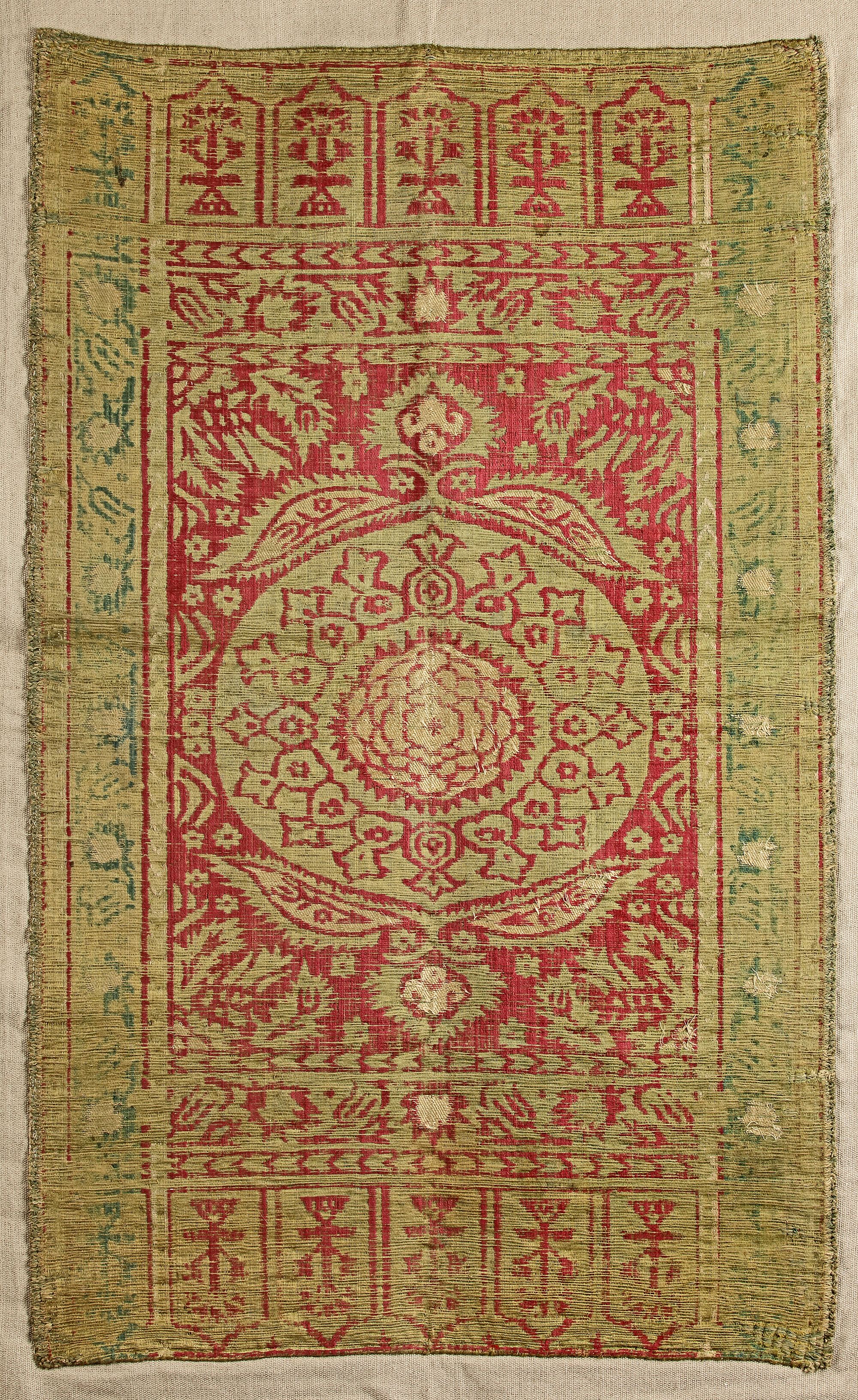 Bush panel woven in silk with traces of metallic wire, decorated with a polylobed central rondo with two fleur-de-lis, on a red background decorated with tulips at the four corners. Nice margin with eyelets and big margin with five flower crowns at both ends. Lined and mounted on chassis.
