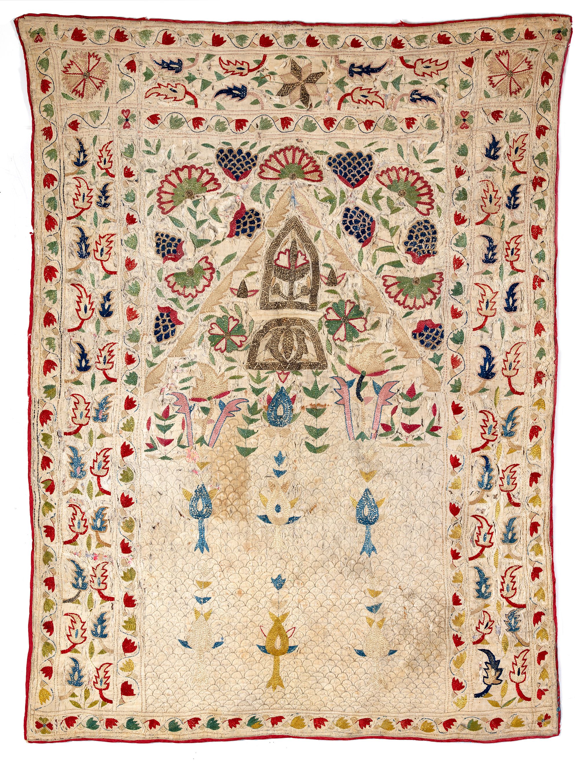 An Ottoman hanging panel embroidered in silk threads with floral motifs and foliage. 76 by 108 cm.