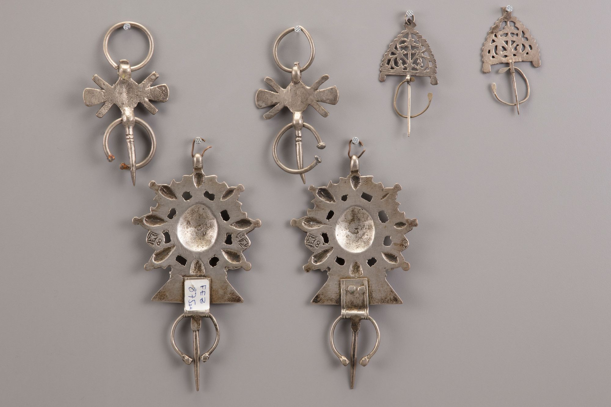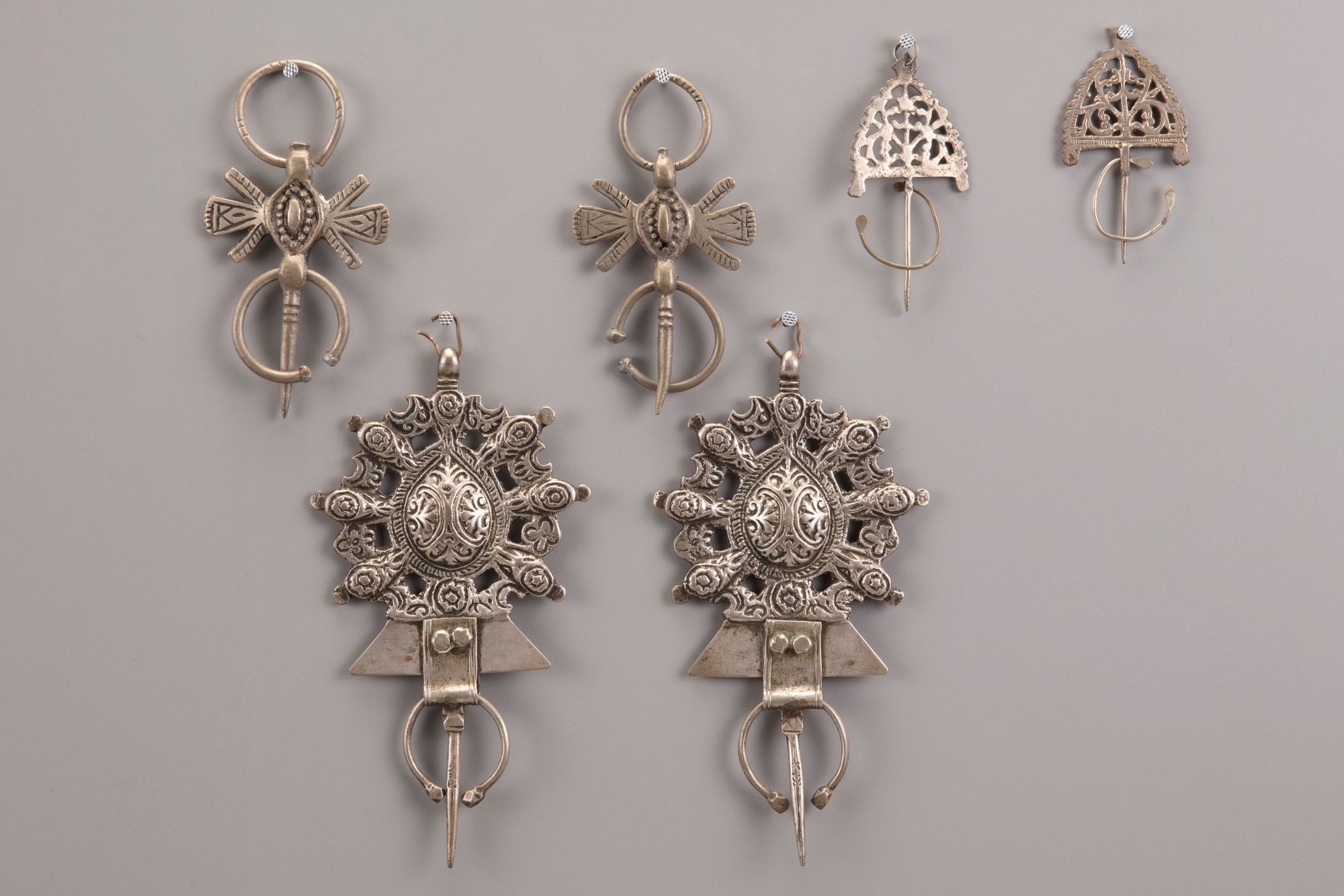 Fibulae were commonly worn by women as an everyday adornment whilst going about daily work as well as on special occasions. It is essentially a cloak fastener, comprising an ornate metal triangular, round or oval shape with detailed etchings in filigree or enamel, and a pin which serves to fasten two layers of material together. They were usually worn as a pair. These type of Fibulae are worn by Berbers, the indigenous ethnic group of North Africa.