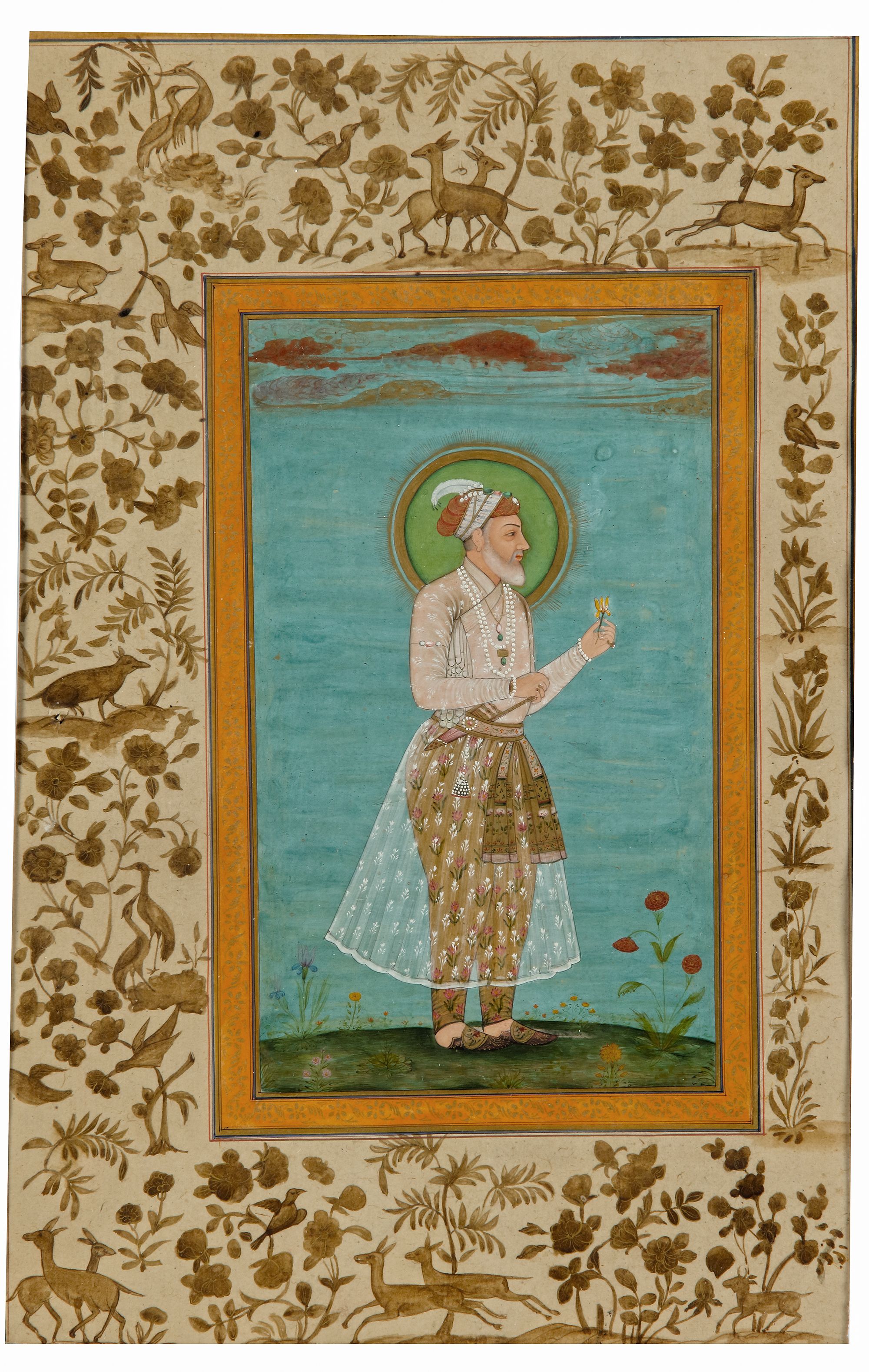 Gouache heightened with gold on paper, laid down on an album page, full length portrait of a standing haloed Aurangzeb holding a flower in one hand and a dagger in the other, adorned with fine jewels. Laid within an orange border with illuminated floral sprays. The outer border stylized with a dense design of deer and birds amongst flower sprigs. miniature: 22 by 14 cm., folio: 33.5 by 22 cm.