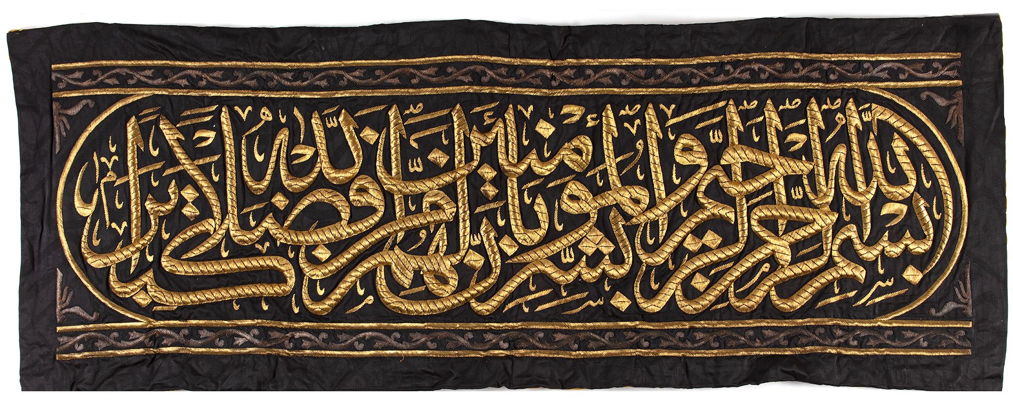The rectangular panel heavily embroidered on a slik black ground with silver and silver-gilt metal wires with a cartouche enclosing a large thuluth inscription of Quran 33 surah Al-Aḥzab v.47, with a minor border of scrolling vine.
