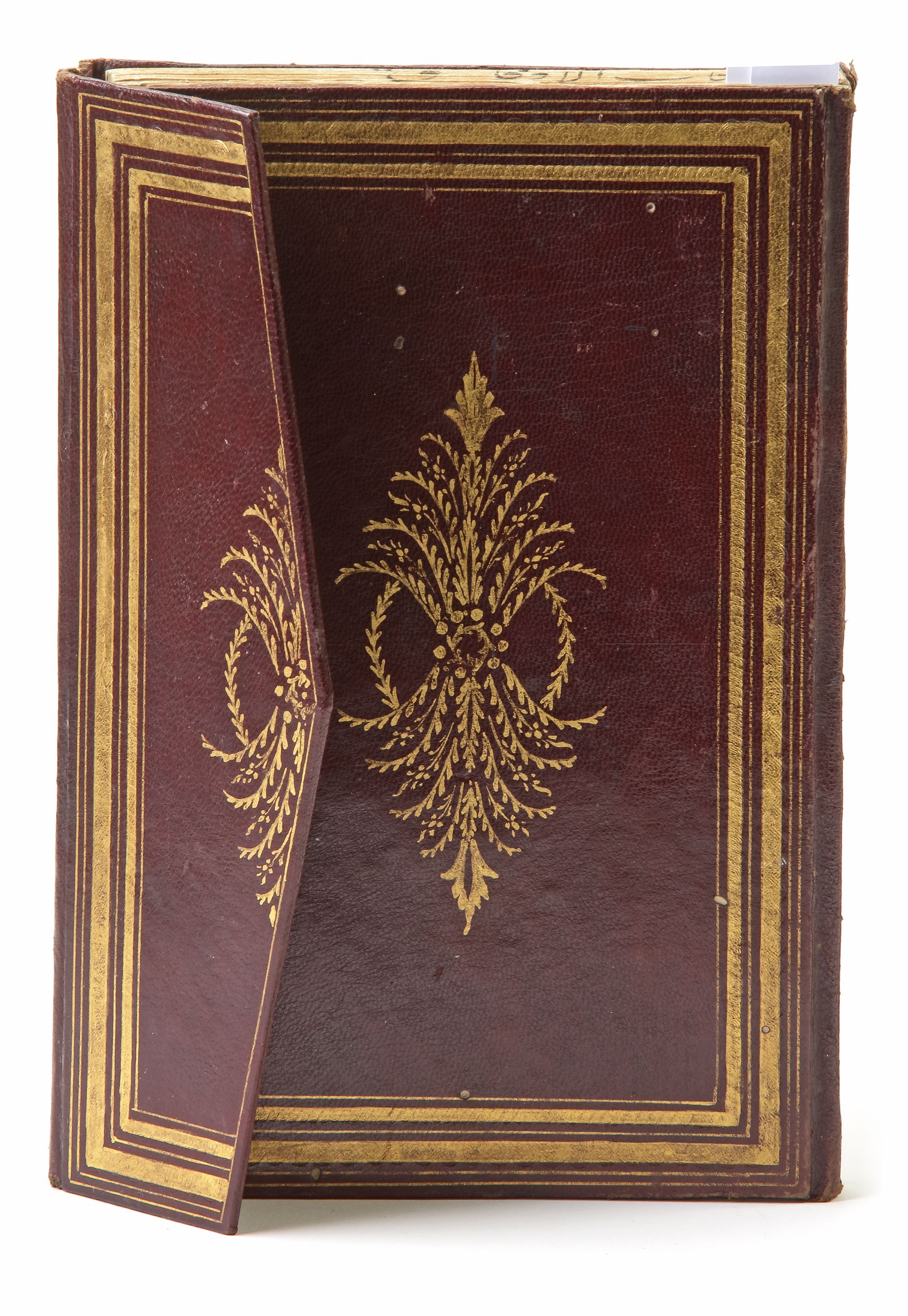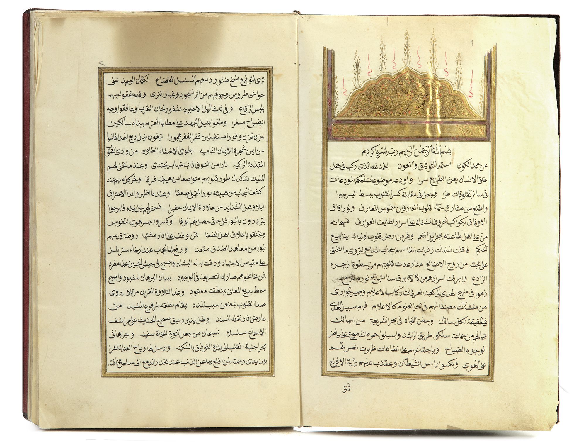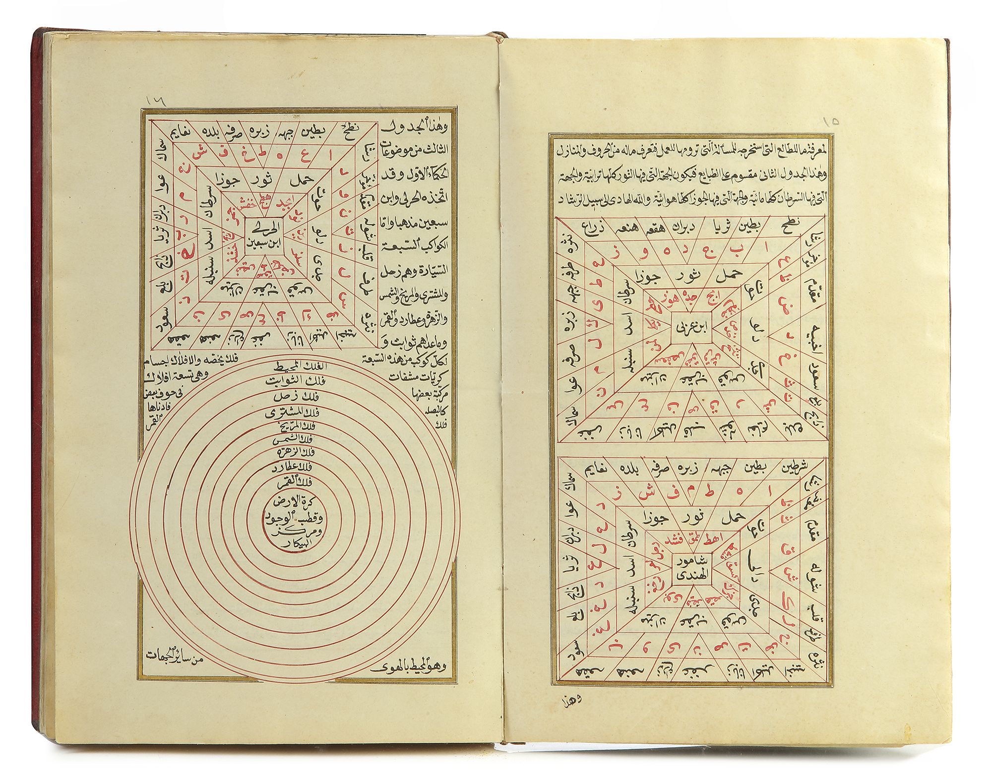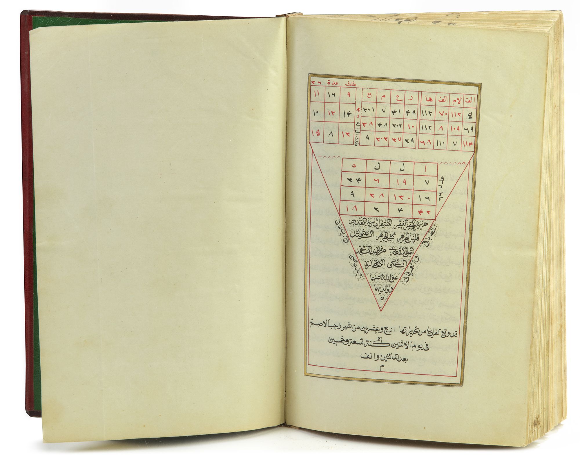 Arabic manuscript paper with 187 leaves and 4 fly leaves, 22 lines to each page, written in naskh script with black and red ink, tables of number and Arabic alphabet with different geometric designs, within a gilt border The first page with an illustrated heading, bound in gilt brown leather cover. Nasser al-Din Muhammad bin Muhammad bin Qurqmas 883 AH/1487AD. Copied by Othman Al-Hilmi Al-Aqhasari 1259 AH/1843/ AD. 21 by 14 cm.