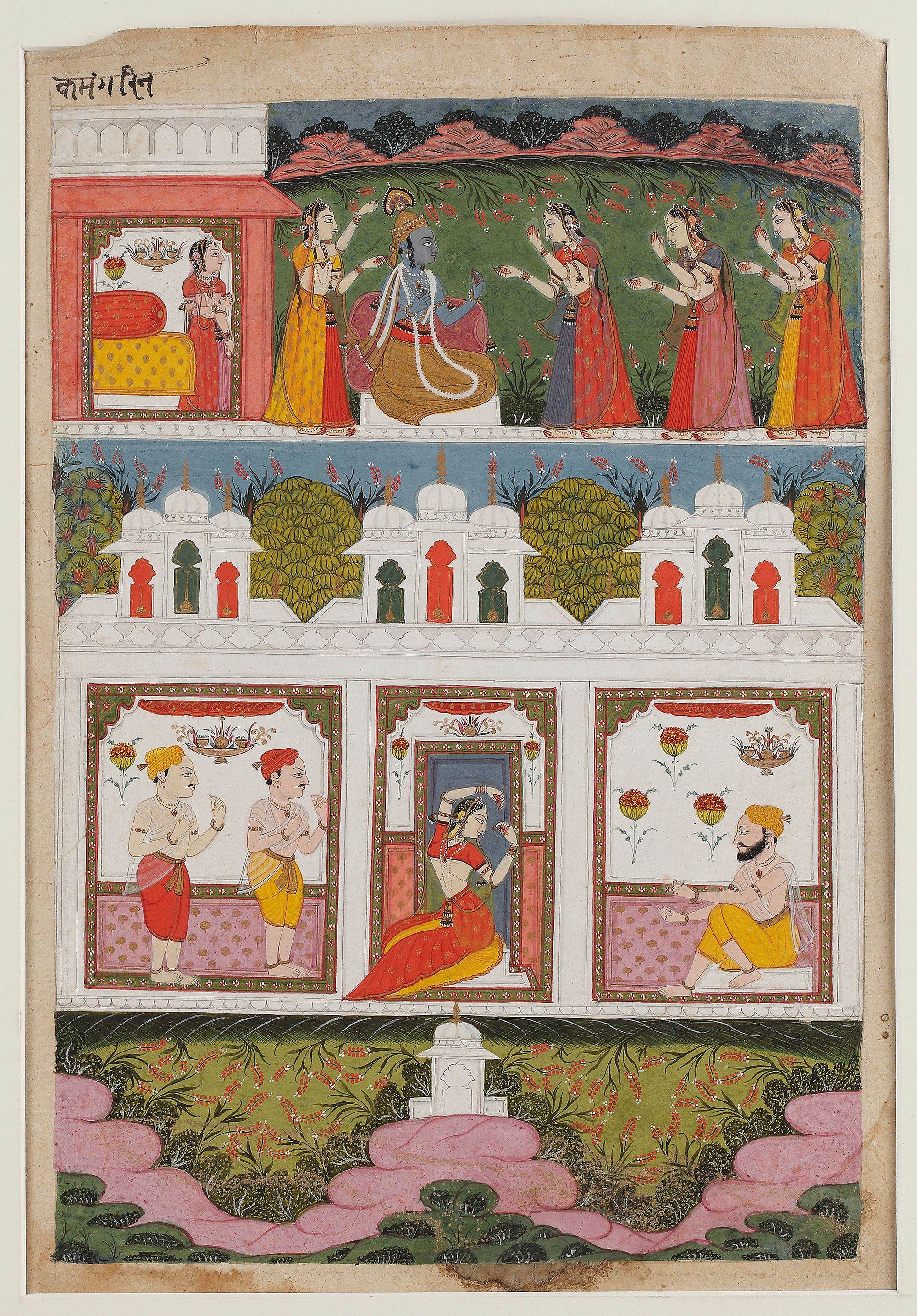 Opaque pigments heightened with gold on paper ,the scene divided in two registers, above are village milkmaids paying homage to Krishna, below a depiction of Radha and three Indian men with a rocky landscape below ,the reverse with three lines written in Sanskrit.