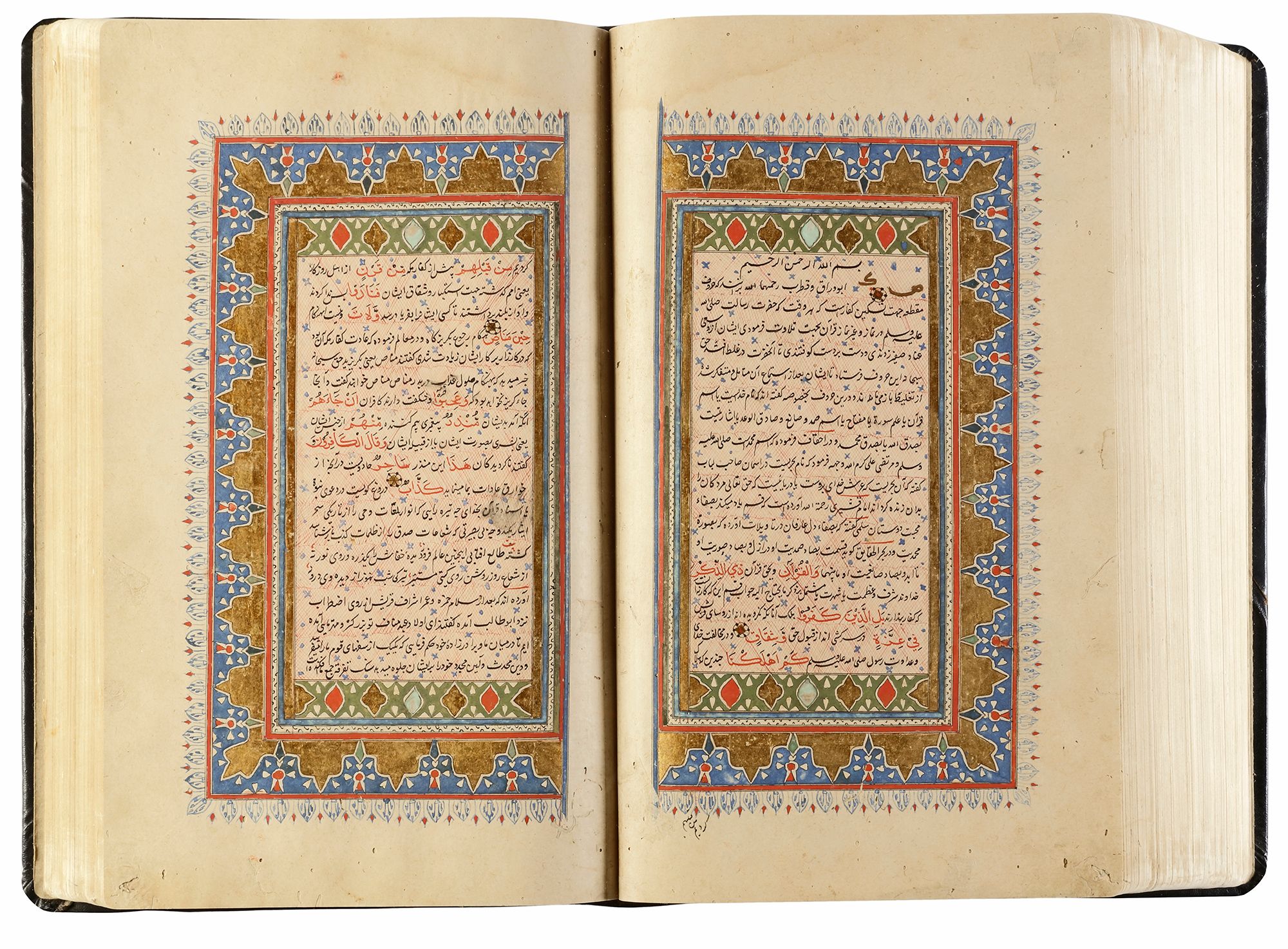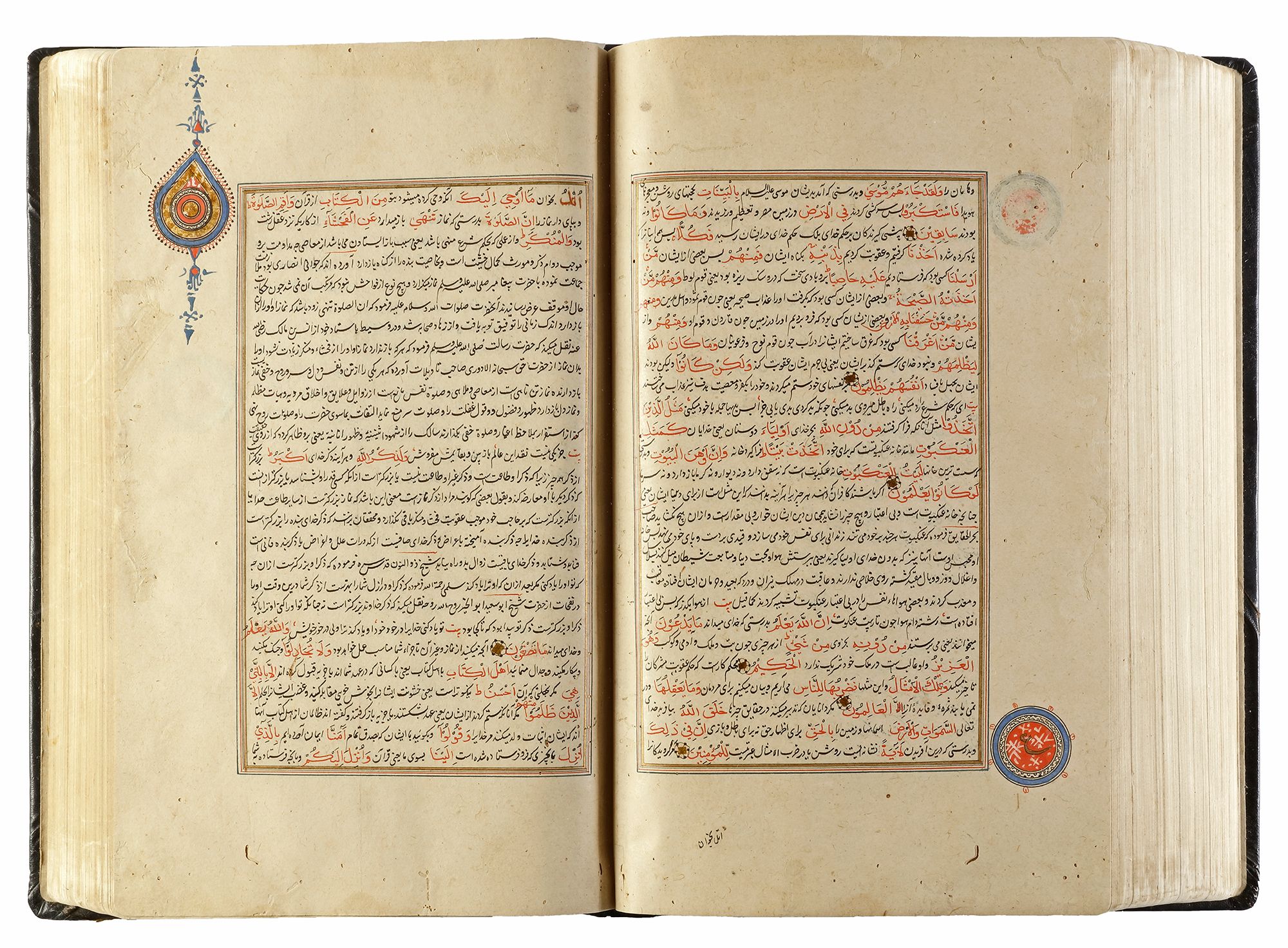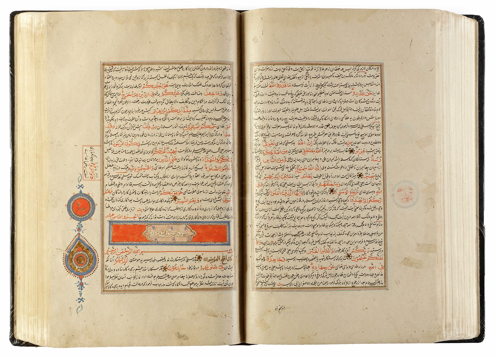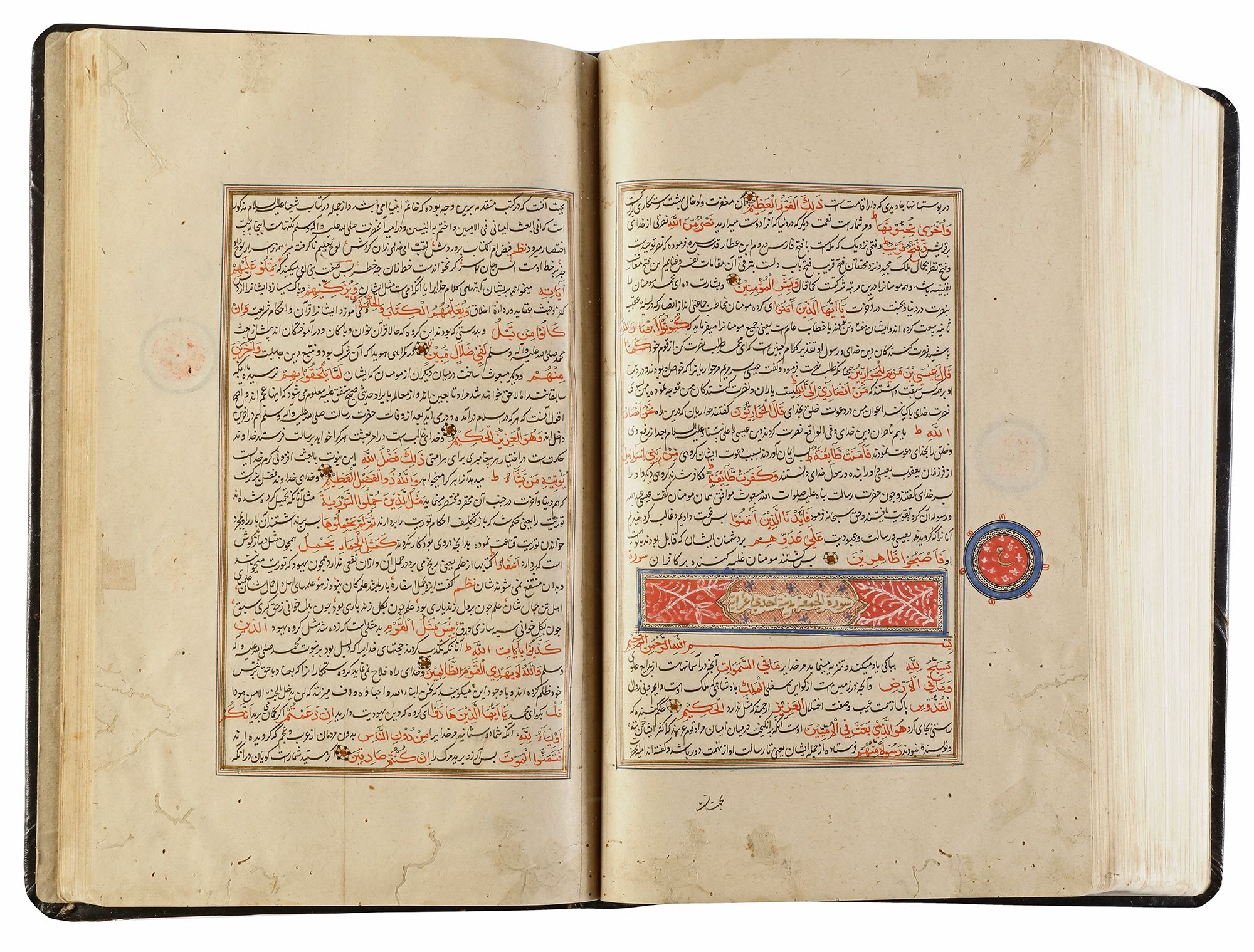 An illuminated Persian manuscript on paper, 27 lines per page written in fine black nasta`liq script on cream paper. Quran text written in red naskh script throughout. Tafsir text written in black ink, small illuminated florets between Quranic verses, margins ruled in colors and gold, headings in gold thuluth script on illuminated panels, occasional marginal notes with illuminated roundels indicating the 'juz' and hizb', opening double page of fine illumination in striking blue color and gold. 32 by 19 cm.