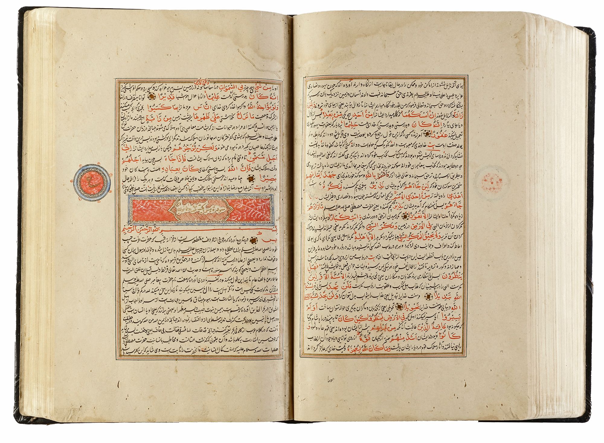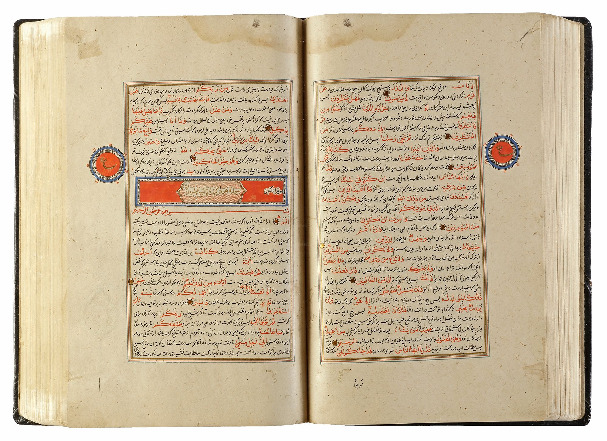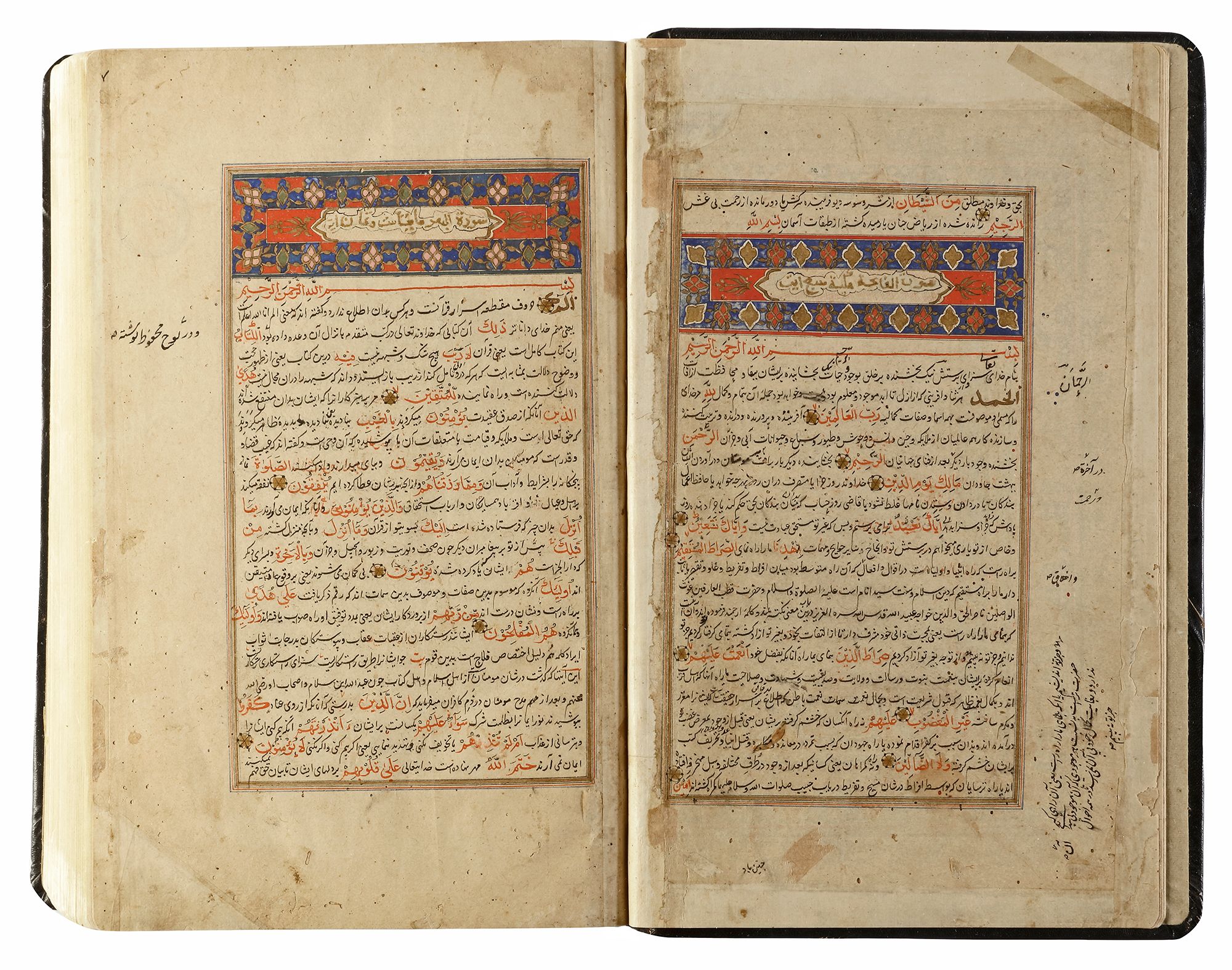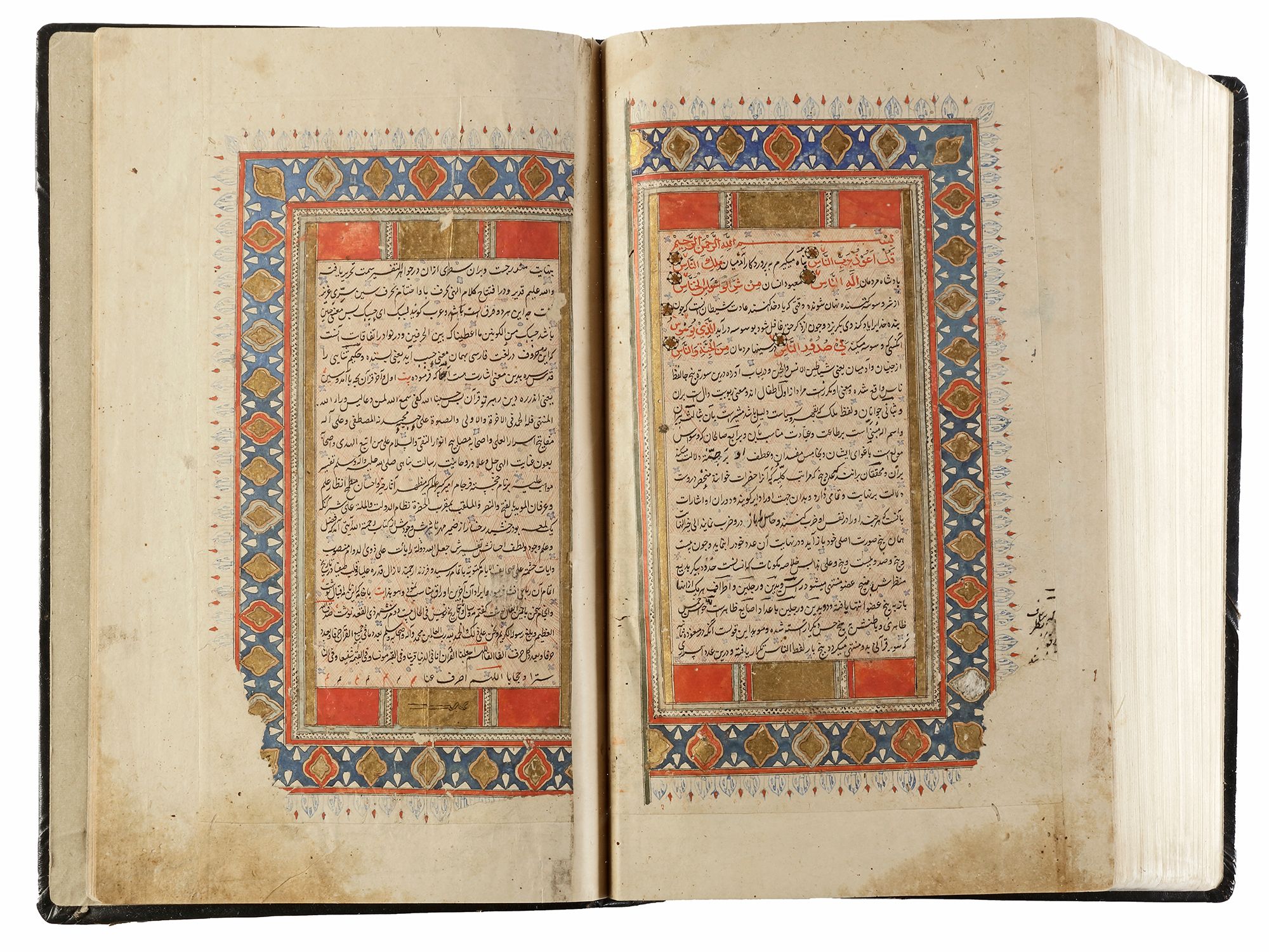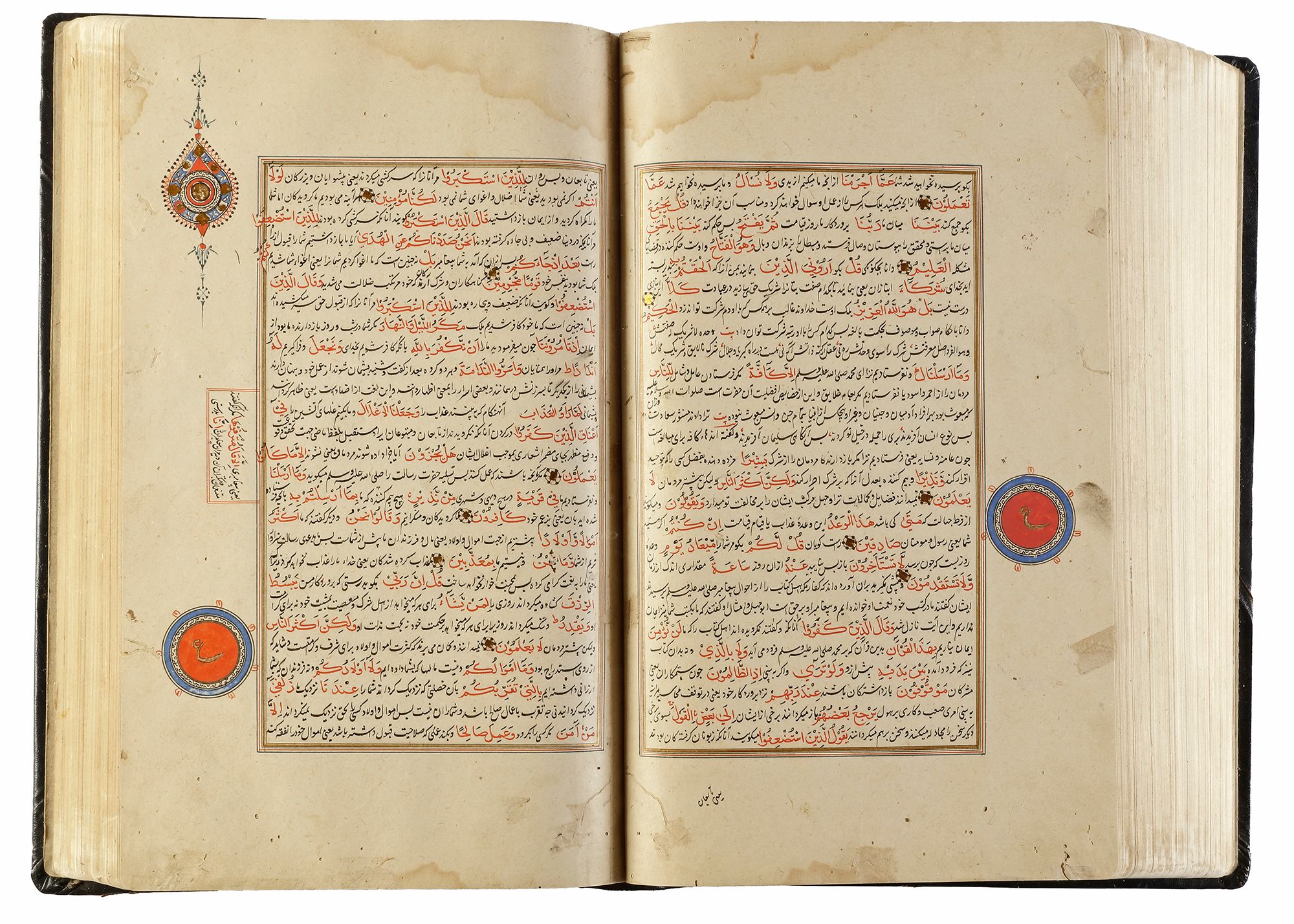 An illuminated Persian manuscript on paper, 27 lines per page written in fine black nasta`liq script on cream paper. Quran text written in red naskh script throughout. Tafsir text written in black ink, small illuminated florets between Quranic verses, margins ruled in colors and gold, headings in gold thuluth script on illuminated panels, occasional marginal notes with illuminated roundels indicating the 'juz' and hizb', opening double page of fine illumination in striking blue color and gold. 32 by 19 cm.
