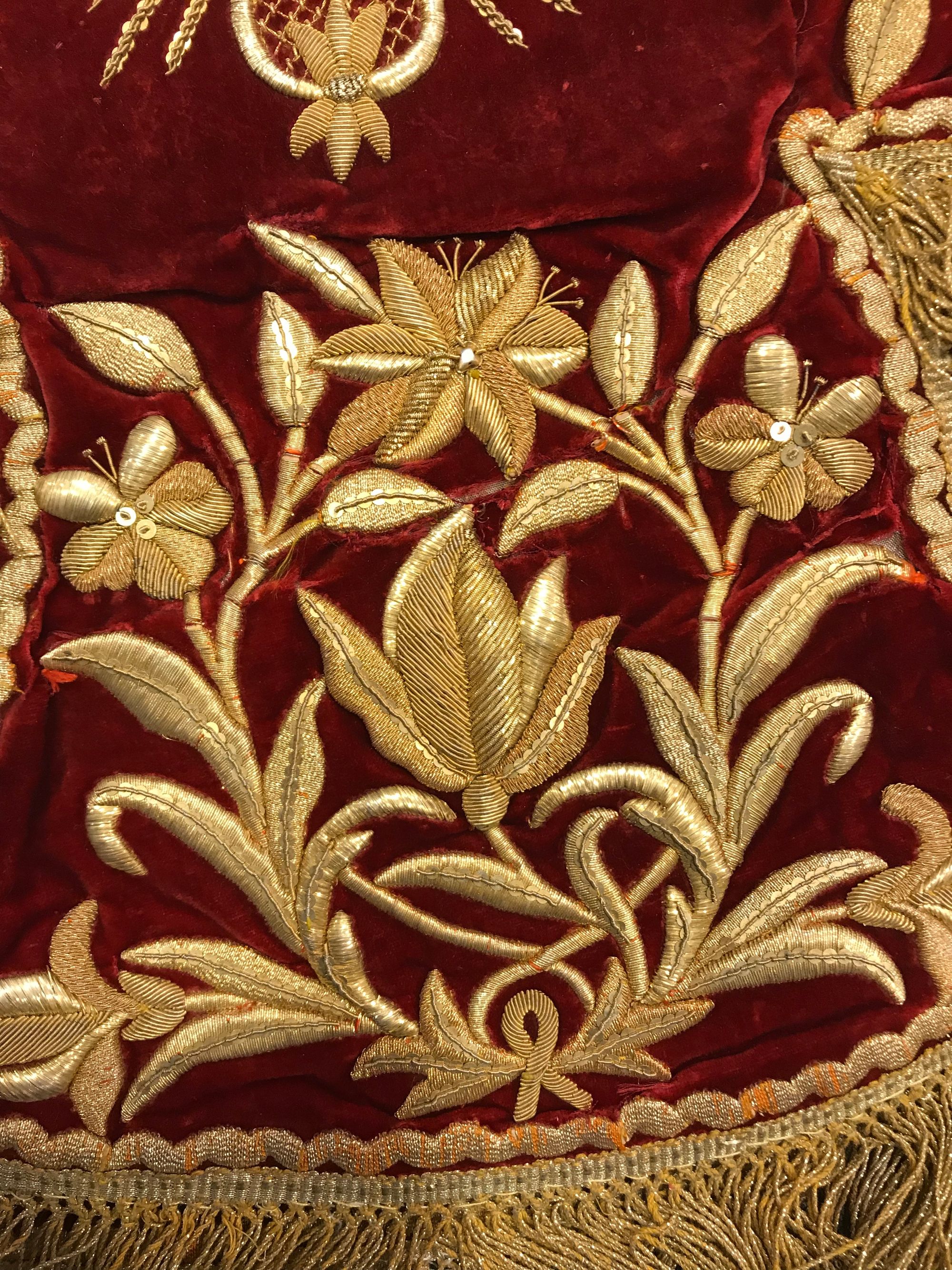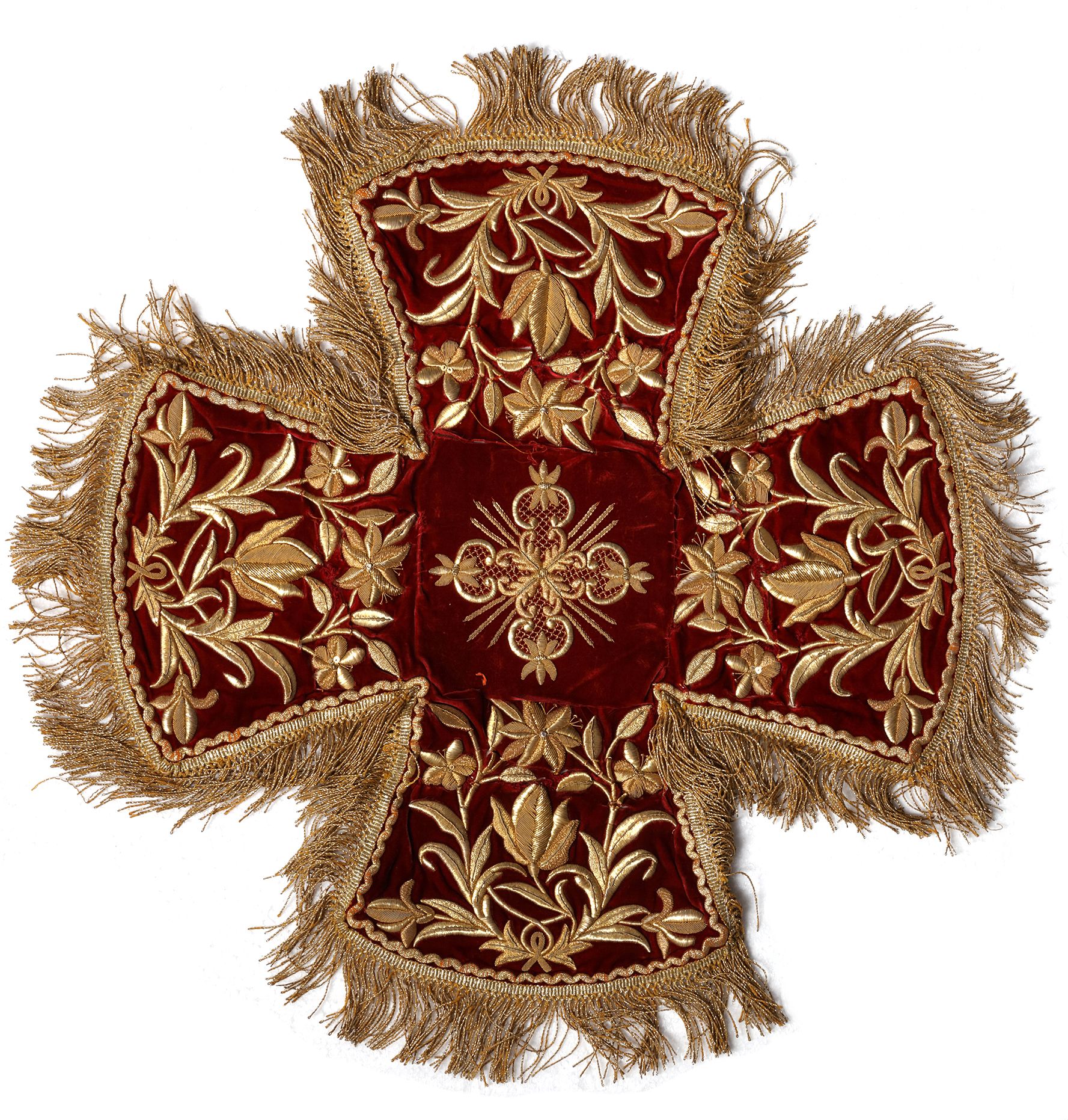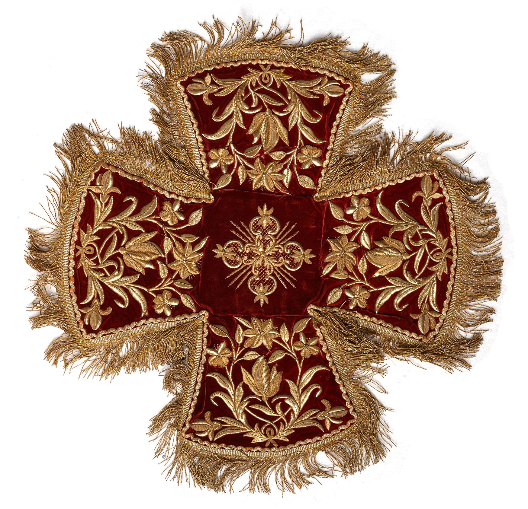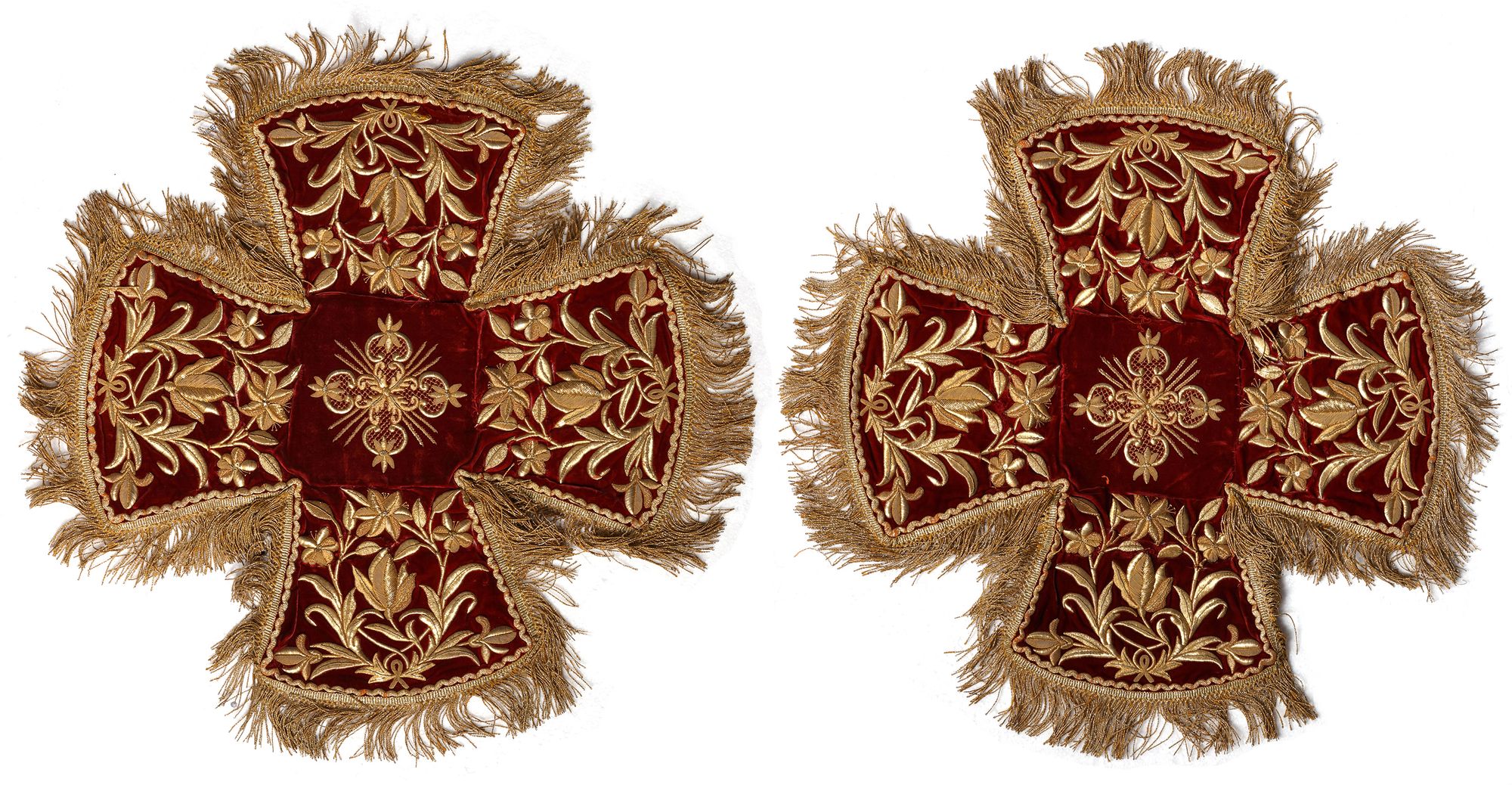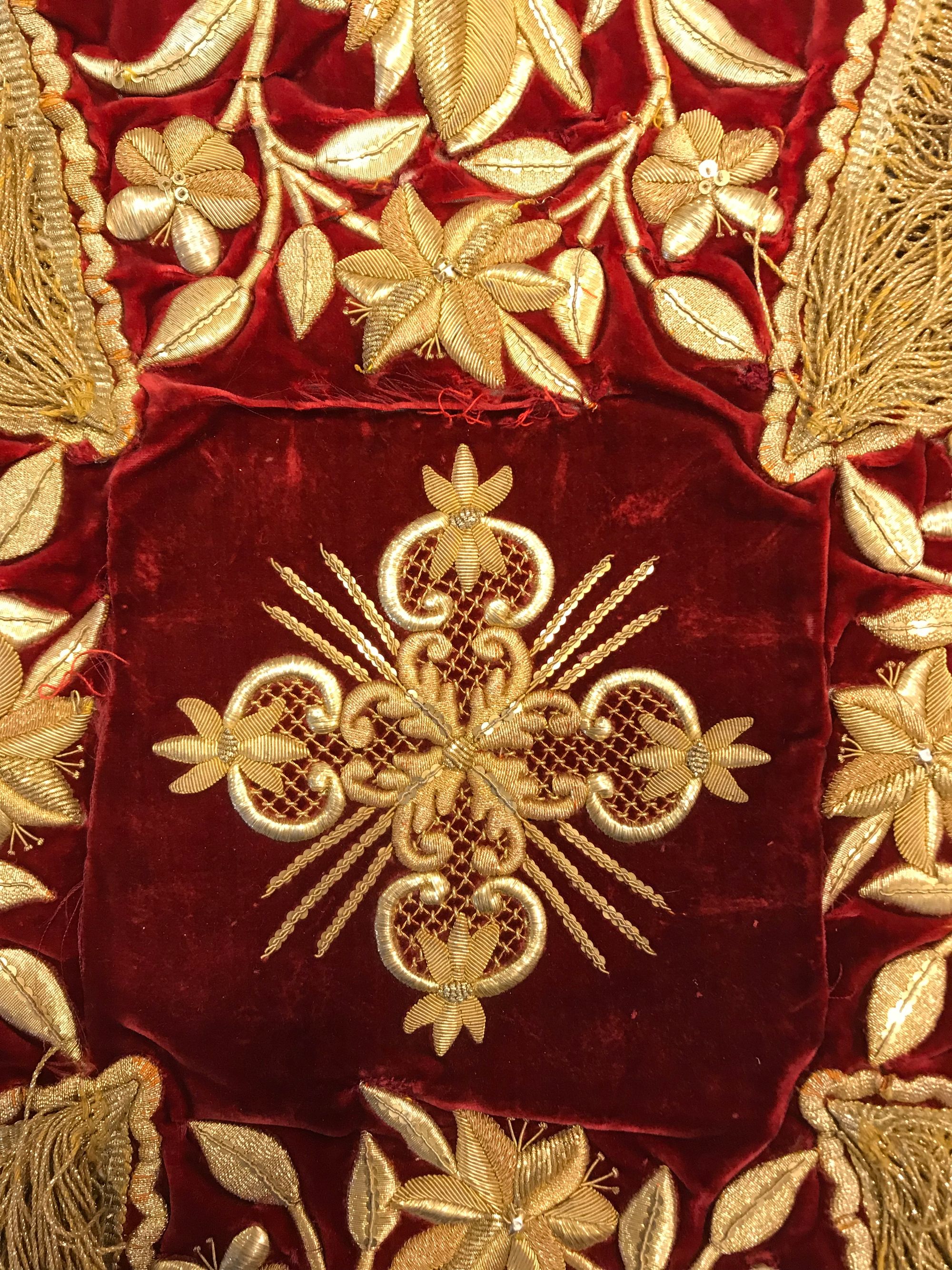 Two Ottoman velvet cross shaped panels, embroidered in gilt threads with a dense design of flowers and foliage on a deep red velvet ground.