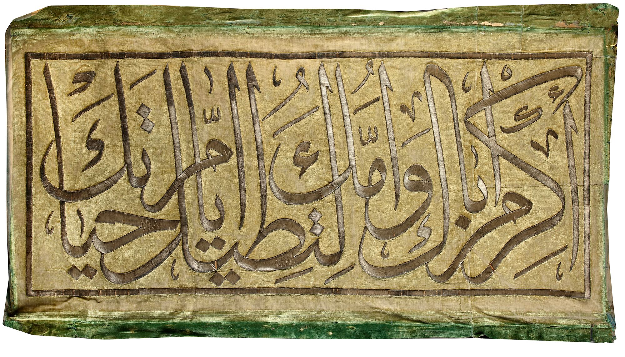 Of elongated rectangular form, embroidered in silver thread with a calligraphic cartouche containing large Arabic inscriptions in thuluth script within a border, against a brownish green silk ground.
