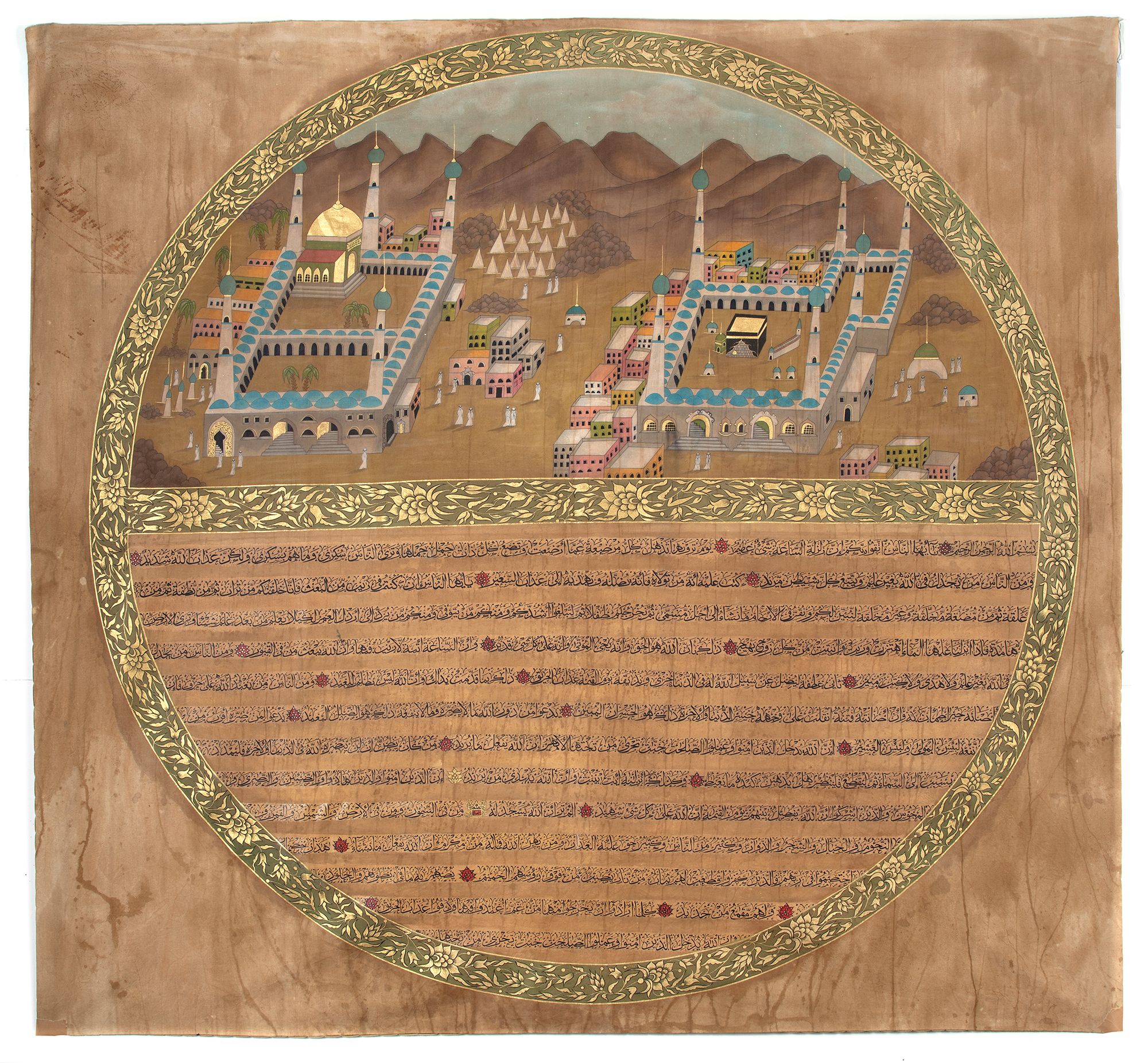 A painting on textile. The upper register of the roundel shows a topographic view of Mecca, Medina and the tents in Mina with the two large holy mosque in the center surrounded by city houses . In the middle of the large heavenly mosque, the Kaaba stands in the shape of the glorious black cube, the sacred sanctuary in Islam, surrounded by houses with a mountains in the background. The lower register contains the sura of Al-Ḥajj (Arabic: الحج, 'The Pilgrimage, The Hajj') which is the 22nd chapter (surah) of the Quran with 78 verses (āyāt). All surrounded by a gilt band of flower and classic foliage scrolls. 160 by 170 cm.