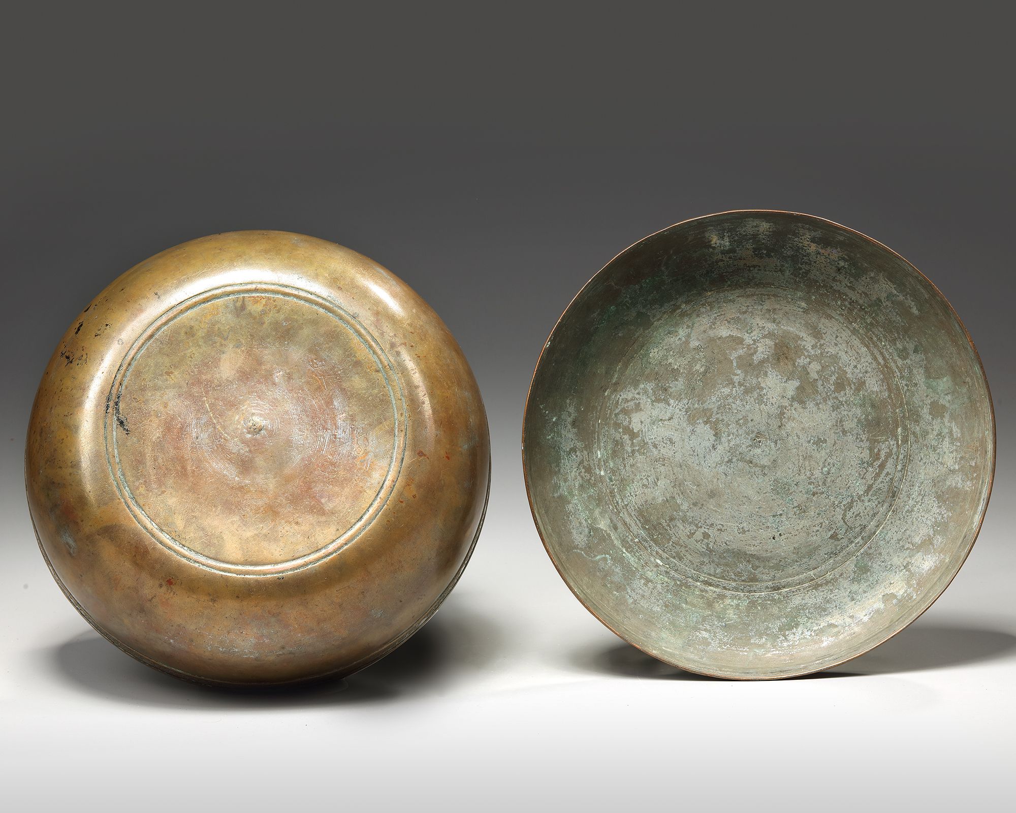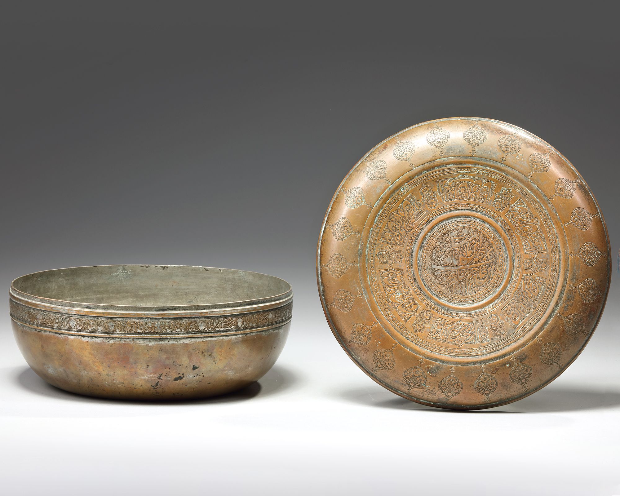 Of circular shape, resting on a flat plain base, the body plain, except for a continuous calligraphic band below the rim, the lid to match, densely engraved with calligraphic cartouches against a vegetal ring-punched ground and with poly lobed floral medallions. 12.5 cm. height, 28 cm. diam.