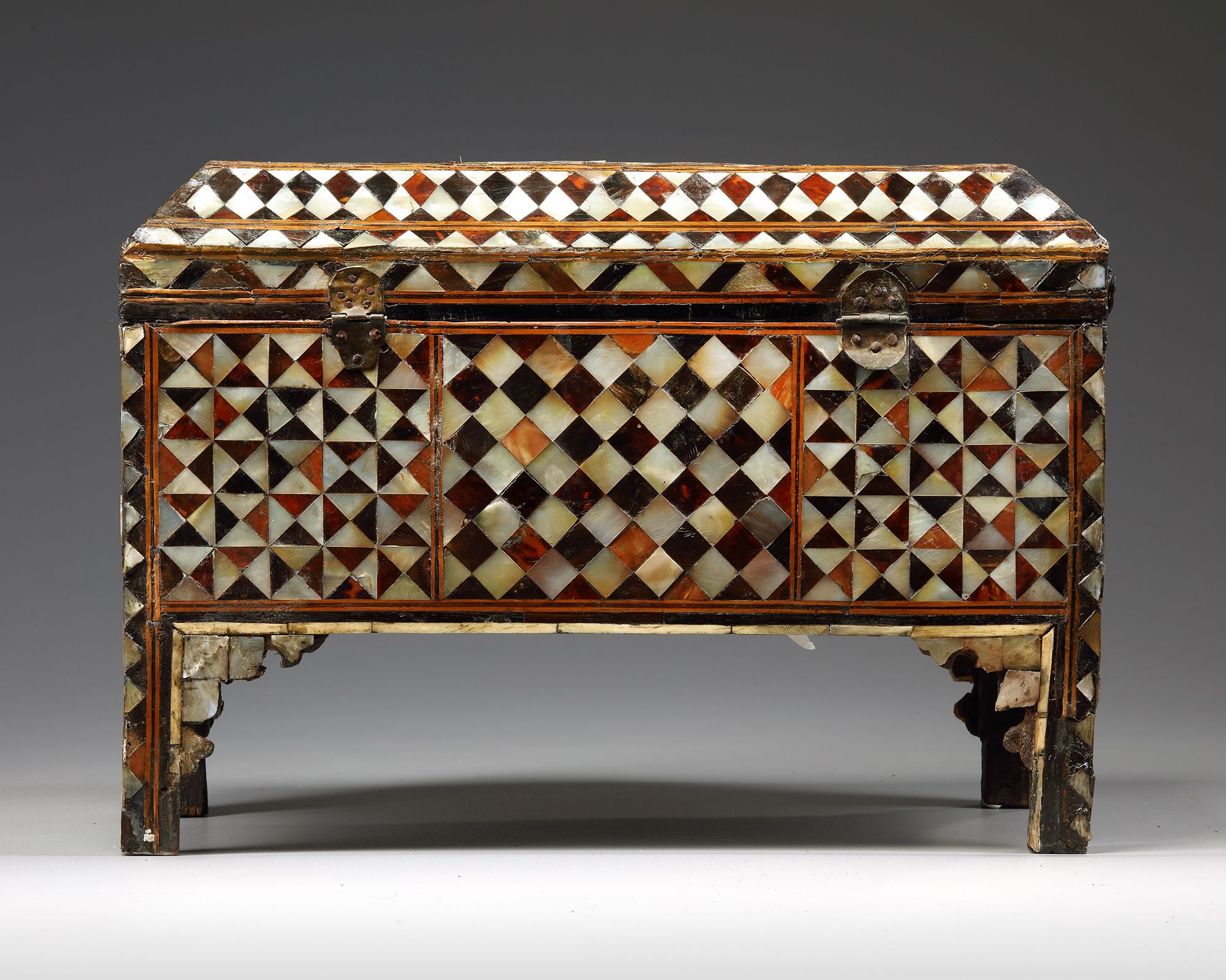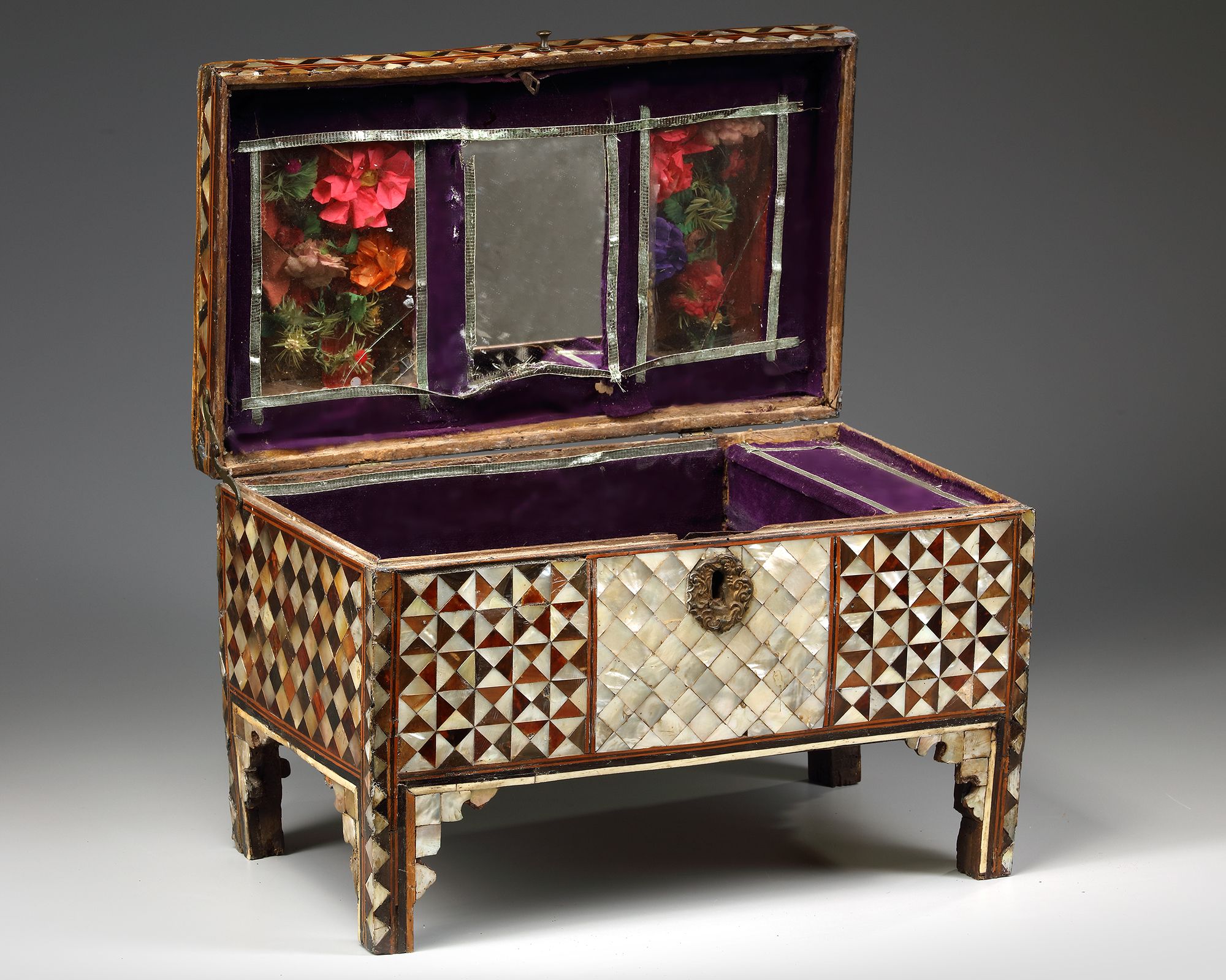 Of rectangular casket-like shape, on four straight legs, the body clad in mother-of-pearl, tortoise shell , the tesserae of typical triangular, squared and rhomboidal shape, the interior clad in dark purple velvet, changed at a later stage into a travel case with floral compositions to the side and a mirror to the centre.
