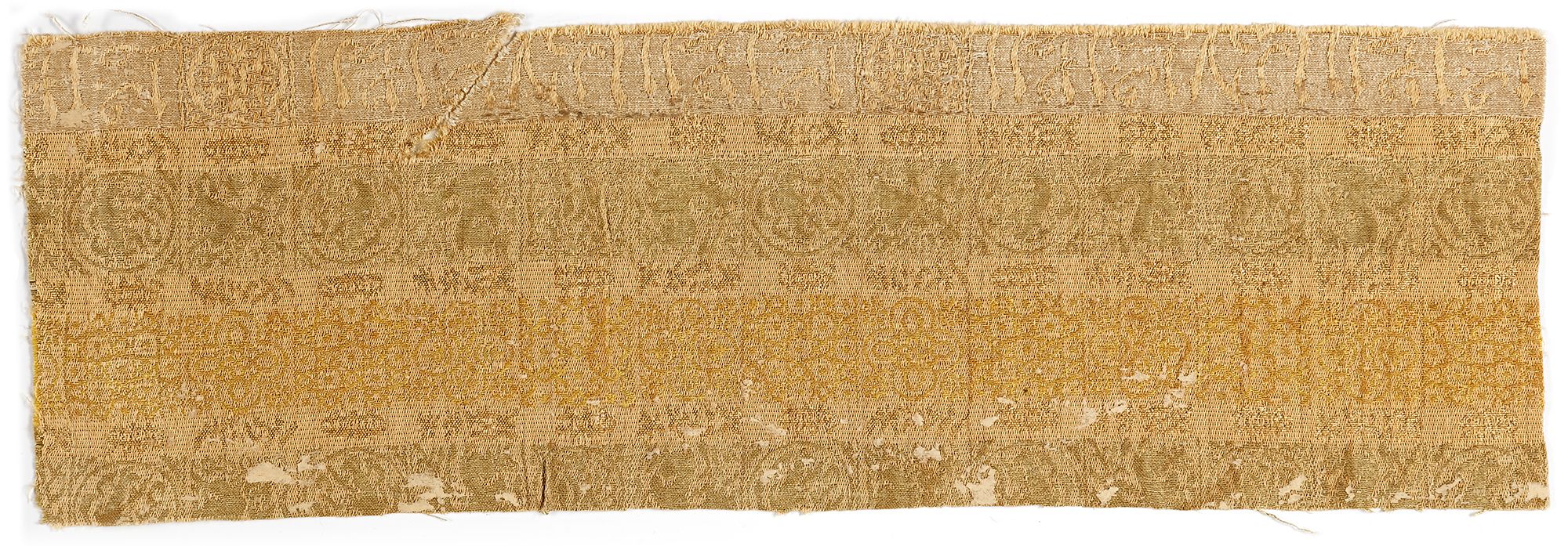 For a very similar layout on a textile from the same period in the Victoria and Albert Museum, see Arthur U. Pope, A Survey of Persian Art, Vol. XI, London and New York 1939, plate A, p. 1001 and for other similar lampas weaves used in The Hapsburg Archduke's burial outfit, see Patricia Baker, Islamic Textiles, 1995, p. 81.