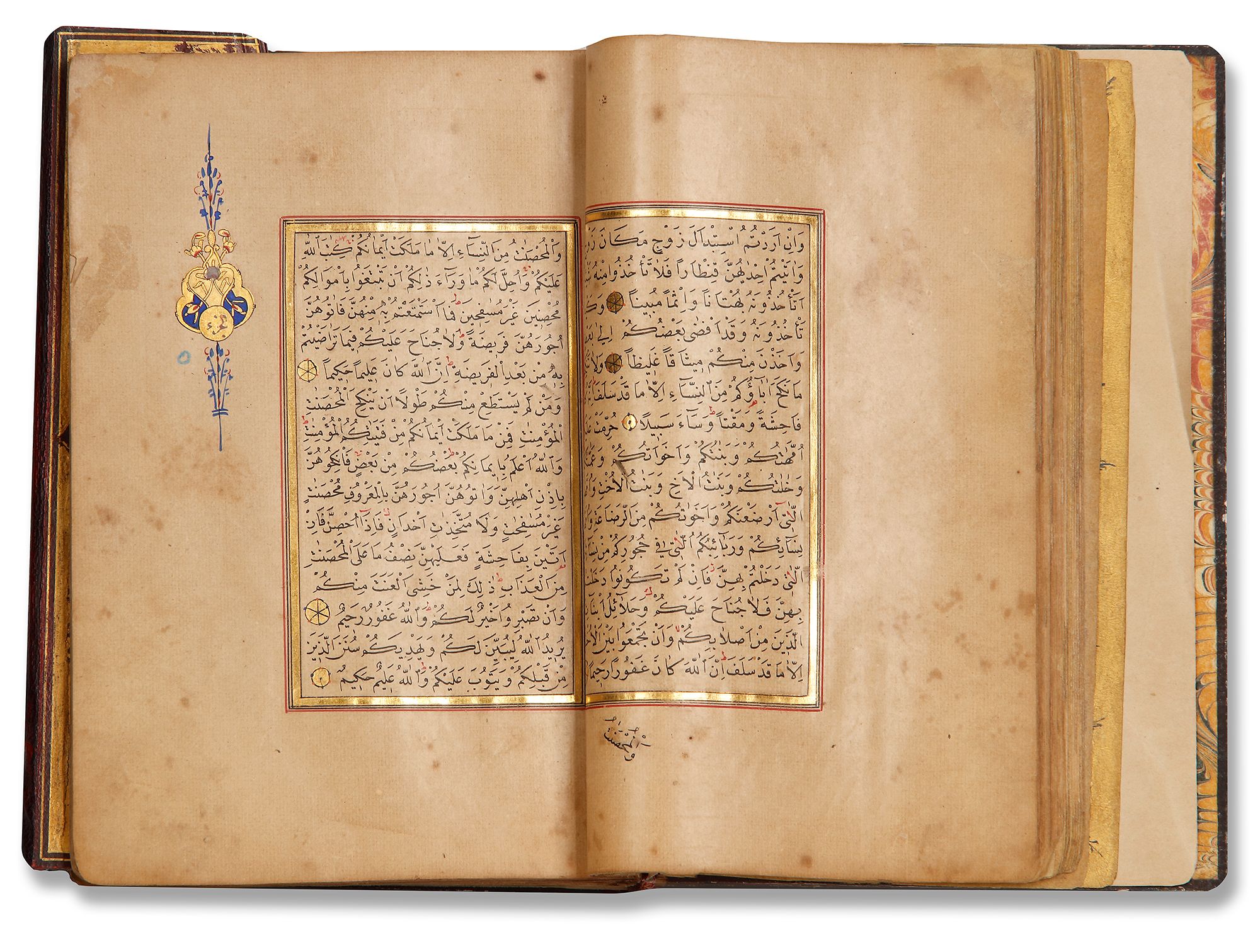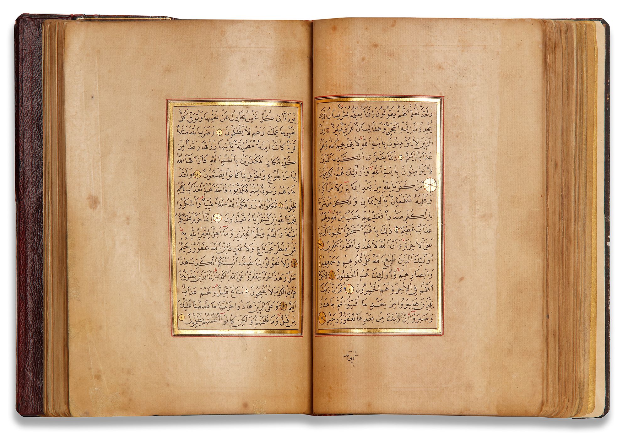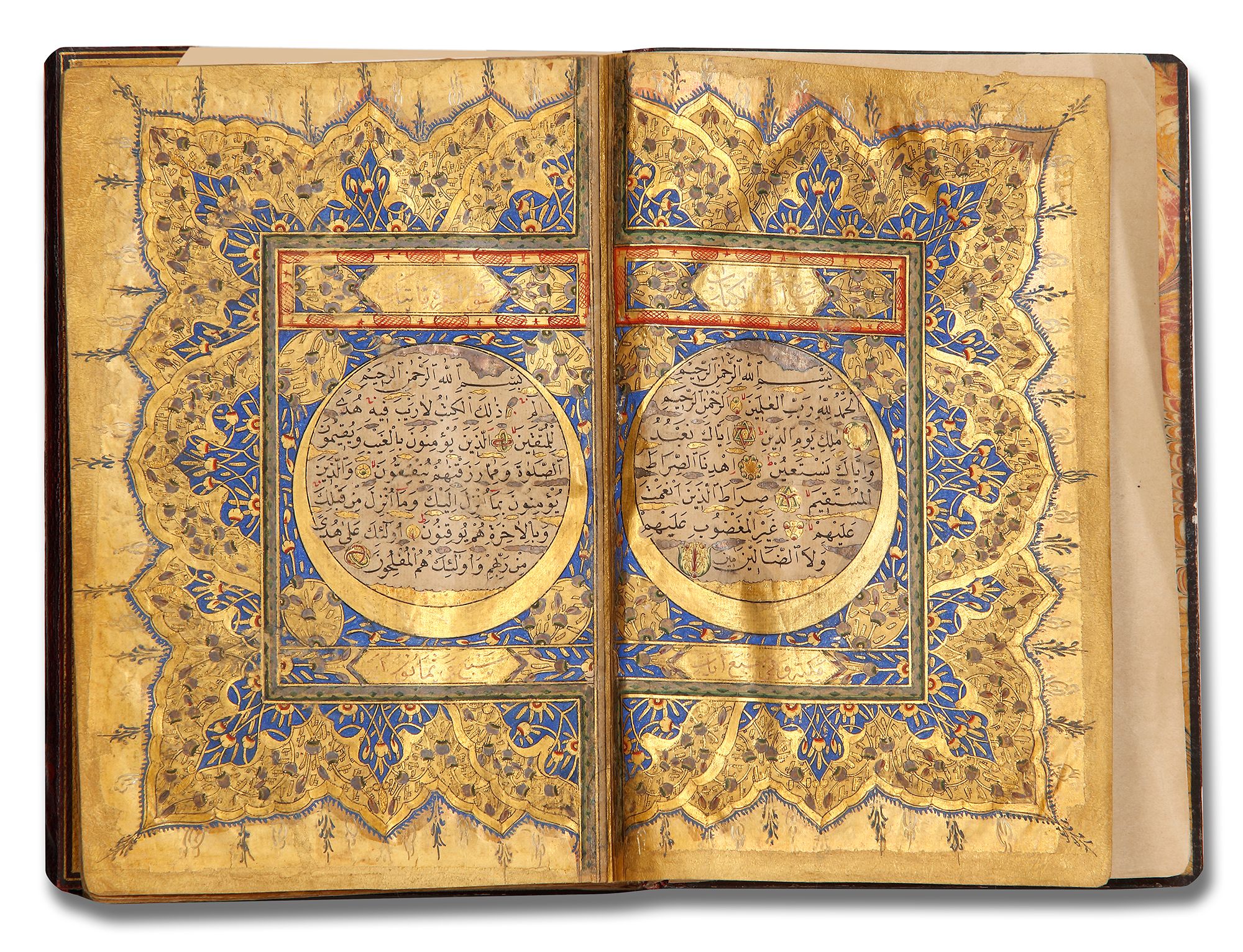 Arabic manuscript on paper, 298 leaves, 15 lines to the page written in neat naskh script in black ink with diacritics and vowel points in red and black ink, gold roundels between verses, inner margins ruled in two shades of gold and red, catchwords, surah headings written in thuluth in white within illuminated rectangular panels, one illuminated double-page frontispiece in colors and gold, occasional illuminated devices in wide outer margins, in morocco binding with gilt-stamped medallions and cornerpieces decorated.