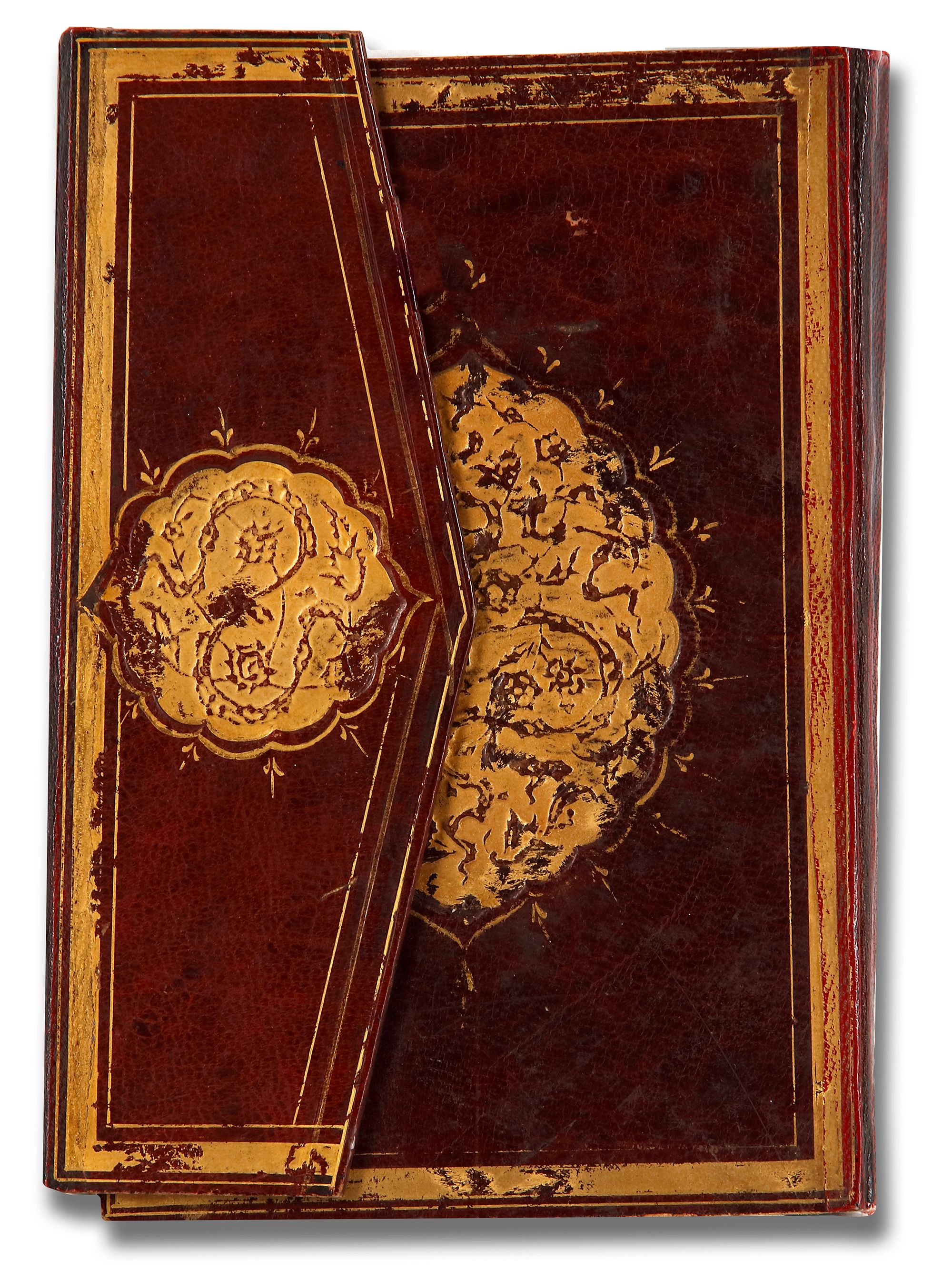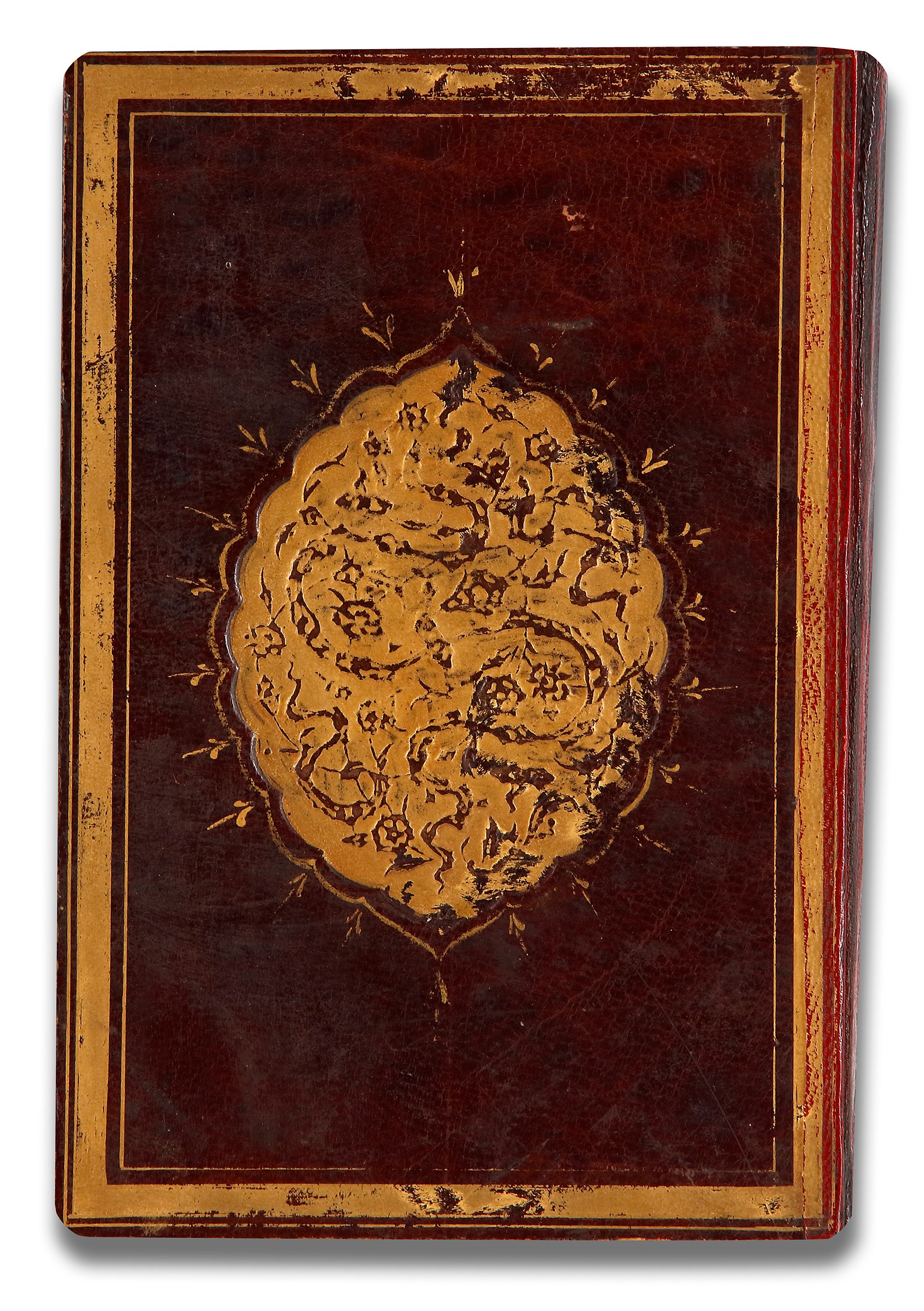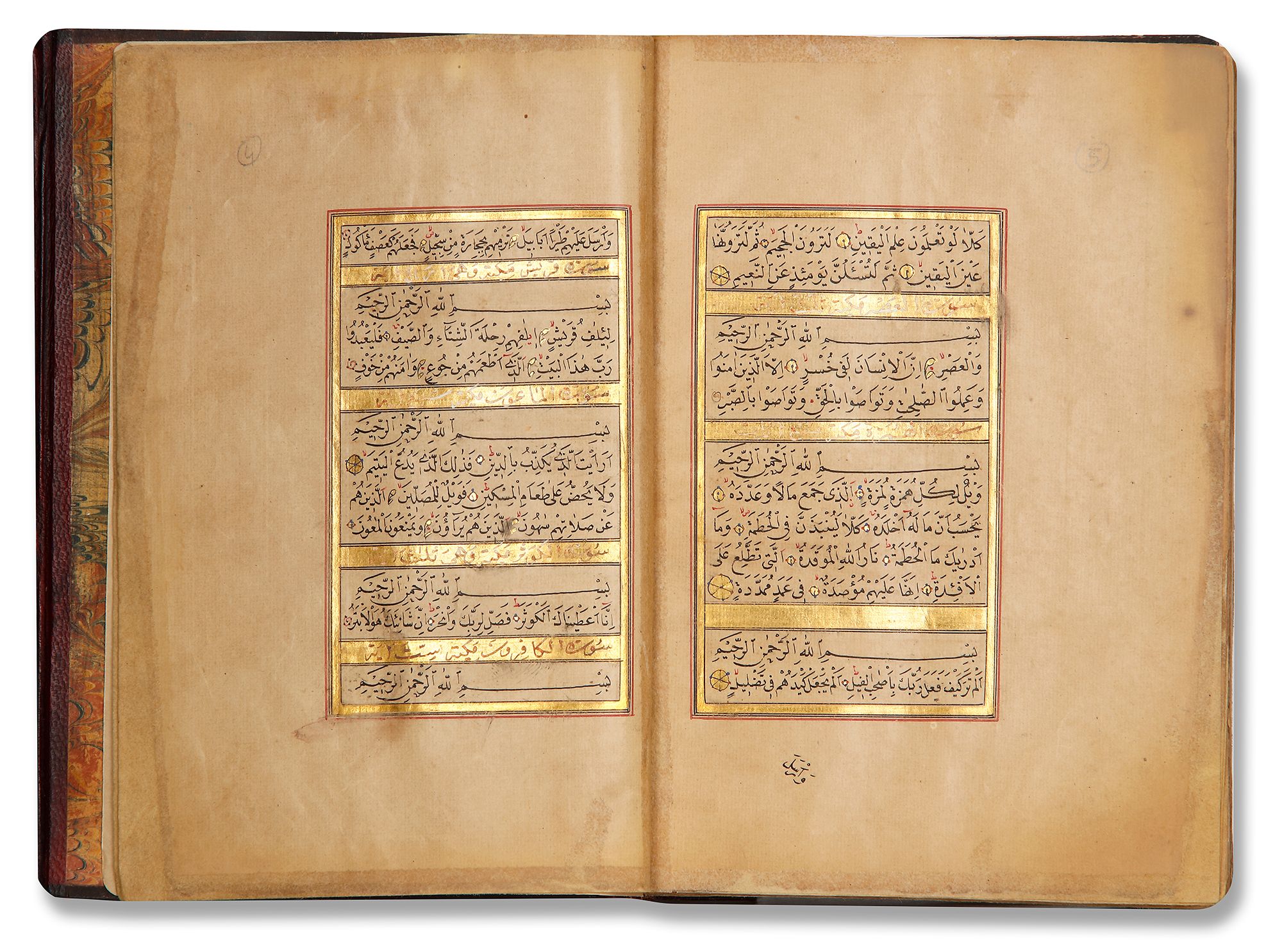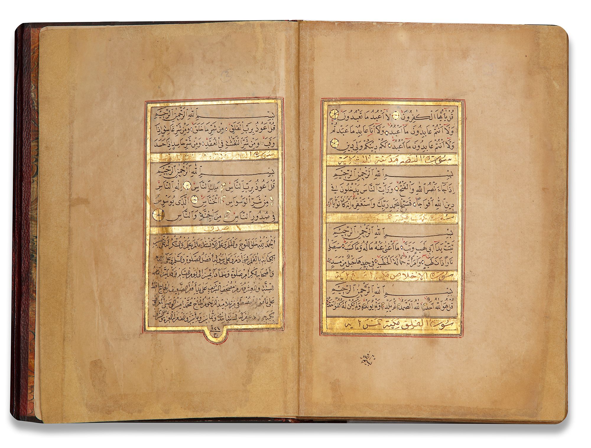 Arabic manuscript on paper, 298 leaves, 15 lines to the page written in neat naskh script in black ink with diacritics and vowel points in red and black ink, gold roundels between verses, inner margins ruled in two shades of gold and red, catchwords, surah headings written in thuluth in white within illuminated rectangular panels, one illuminated double-page frontispiece in colors and gold, occasional illuminated devices in wide outer margins, in morocco binding with gilt-stamped medallions and cornerpieces decorated.
