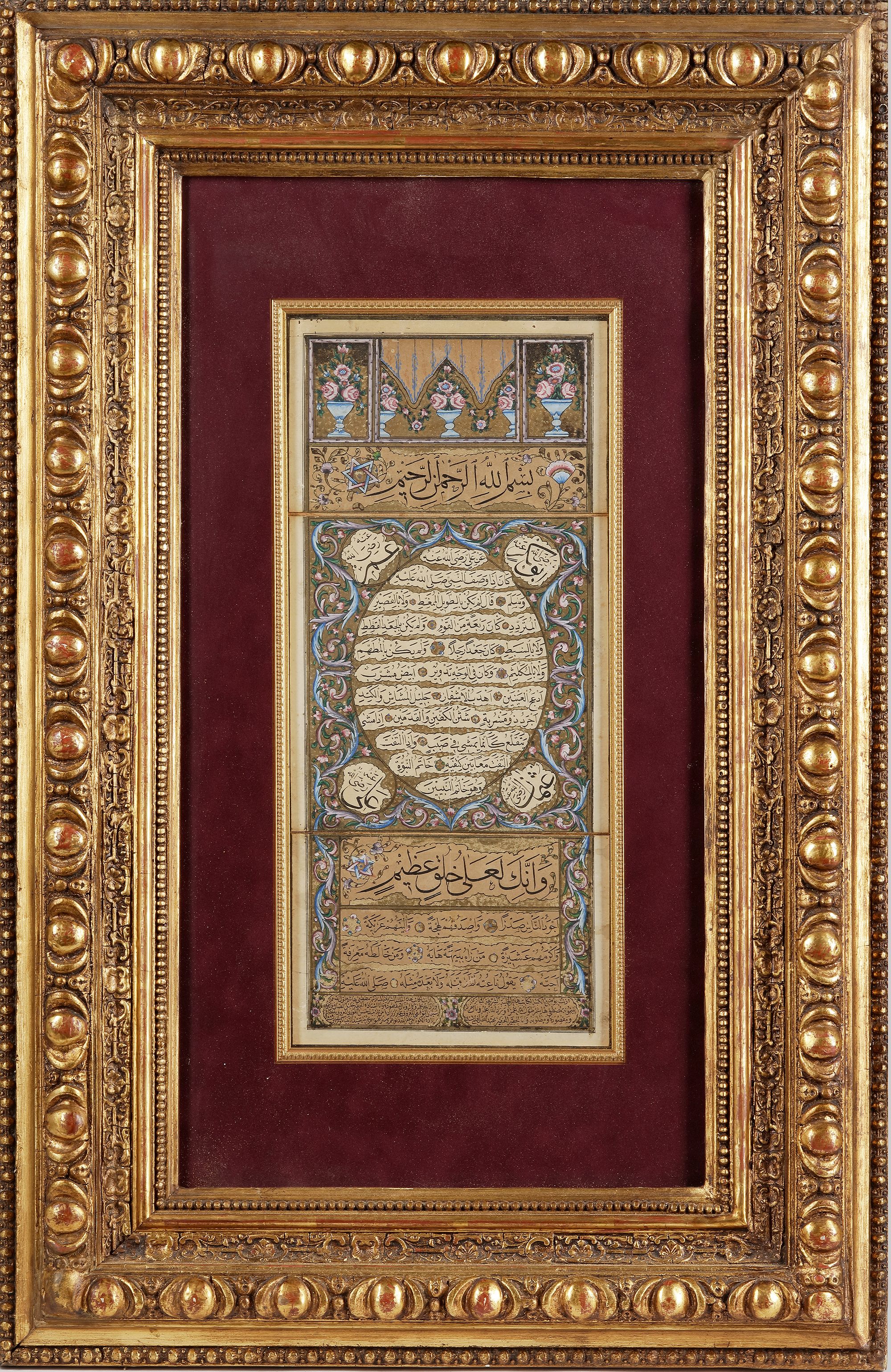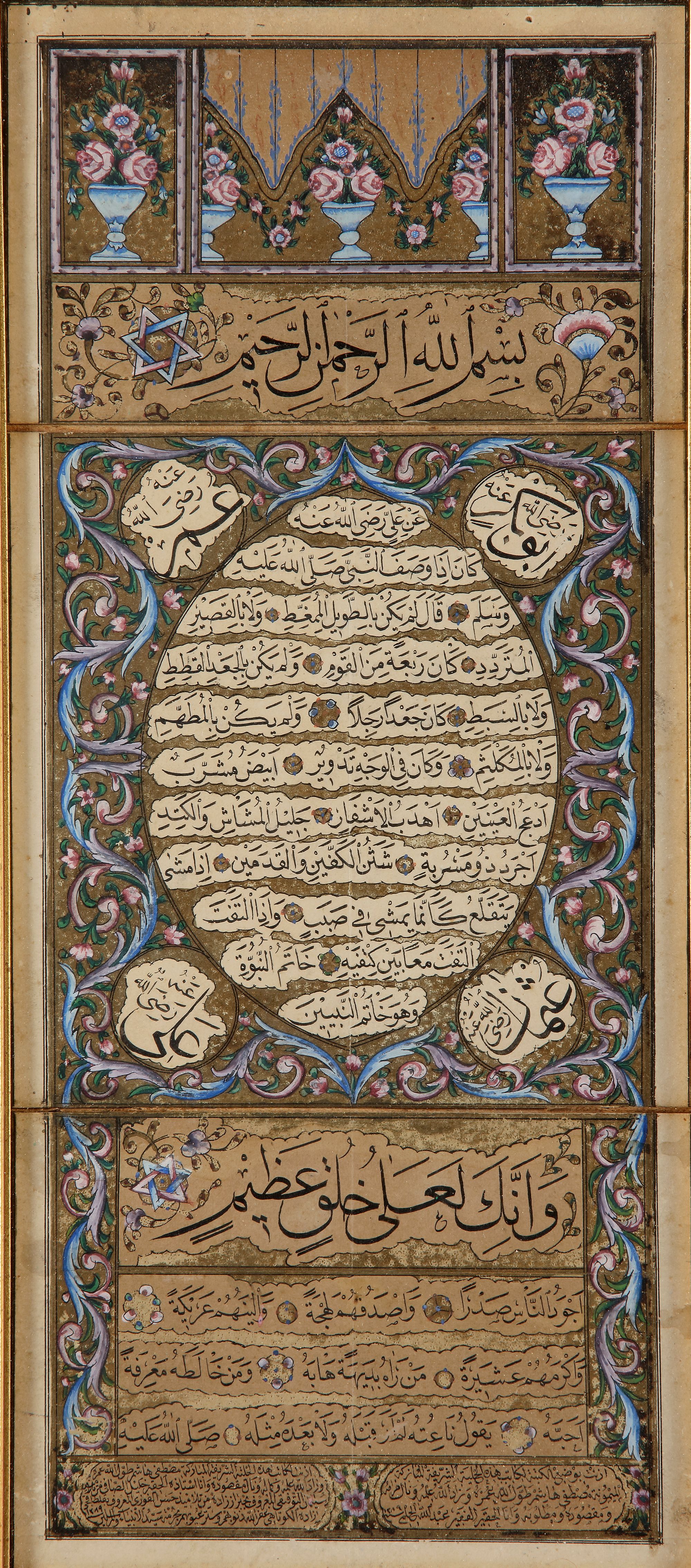Single leaf, text panel at the top with the basmallah in a single line of black muhaqqaq script, then a circular text-block with 11 lines black naskh script reserved in clouds on a cream colored ground with gold markers pointed by blue dots, 4 circular devices extending outwards from this with the names of the Four Rashidun Caliphs, then another single line of muhaqqaq in another text block above the colophon at the bottom of the page, containing another 3 lines black naskh, richly decorated with floral motifs and serrated leaves in colors and gold.