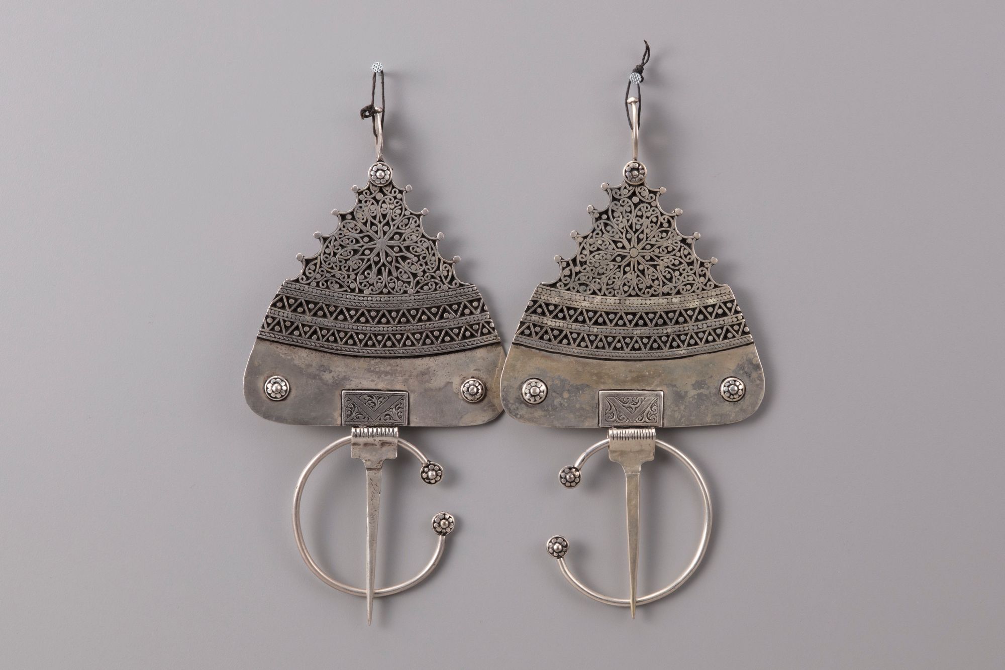 Fibulae were commonly worn by women as an everyday adornment whilst going about daily work as well as on special occasions. It is essentially a cloak fastener, comprising an ornate metal triangular, round or oval shape with detailed etchings in filigree or enamel, and a pin which serves to fasten two layers of material together. They were usually worn as a pair. These type of Fibulae are worn by Berbers, the indigenous ethnic group of North Africa.