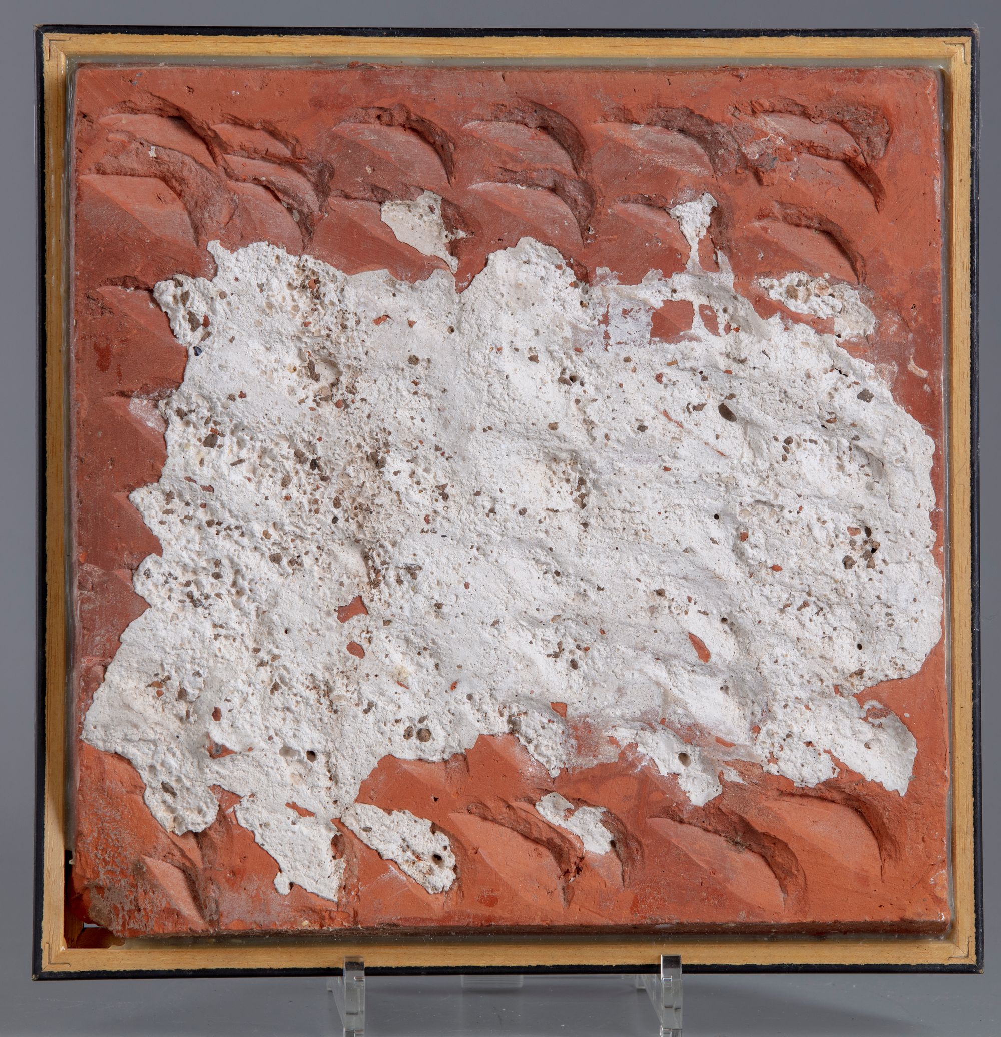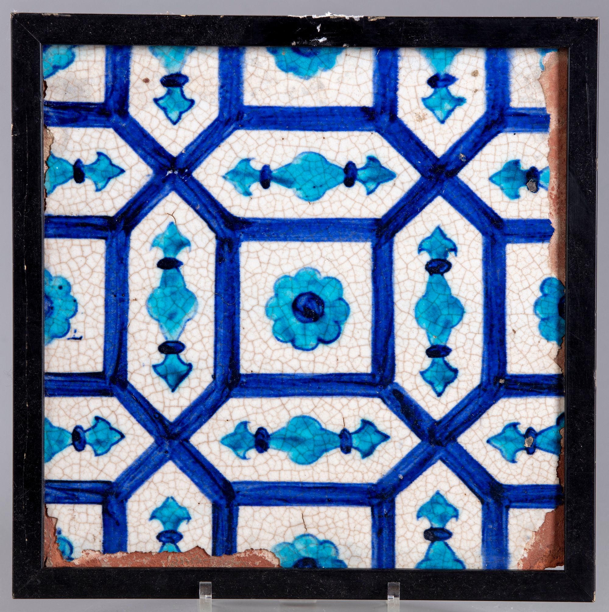 An islamic square shaped ceramic tile, deocrated in turqouise and blue with flowers within geometric designs on a cream white crackled ground.