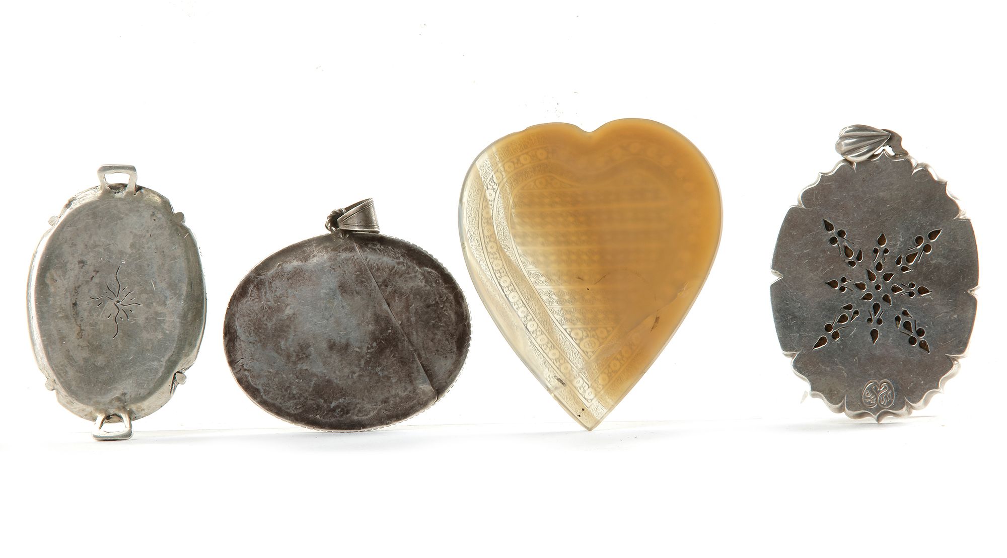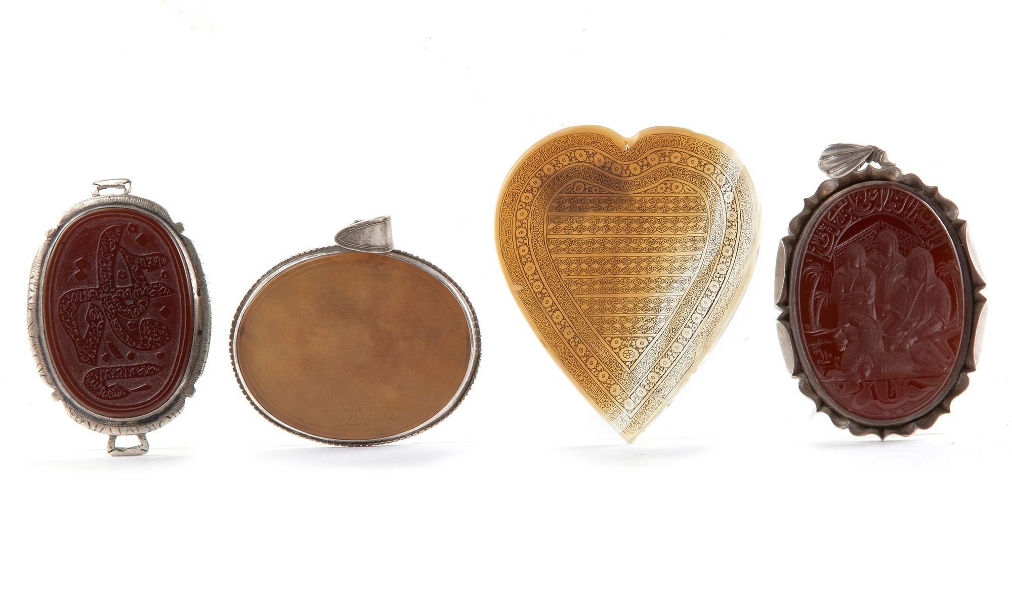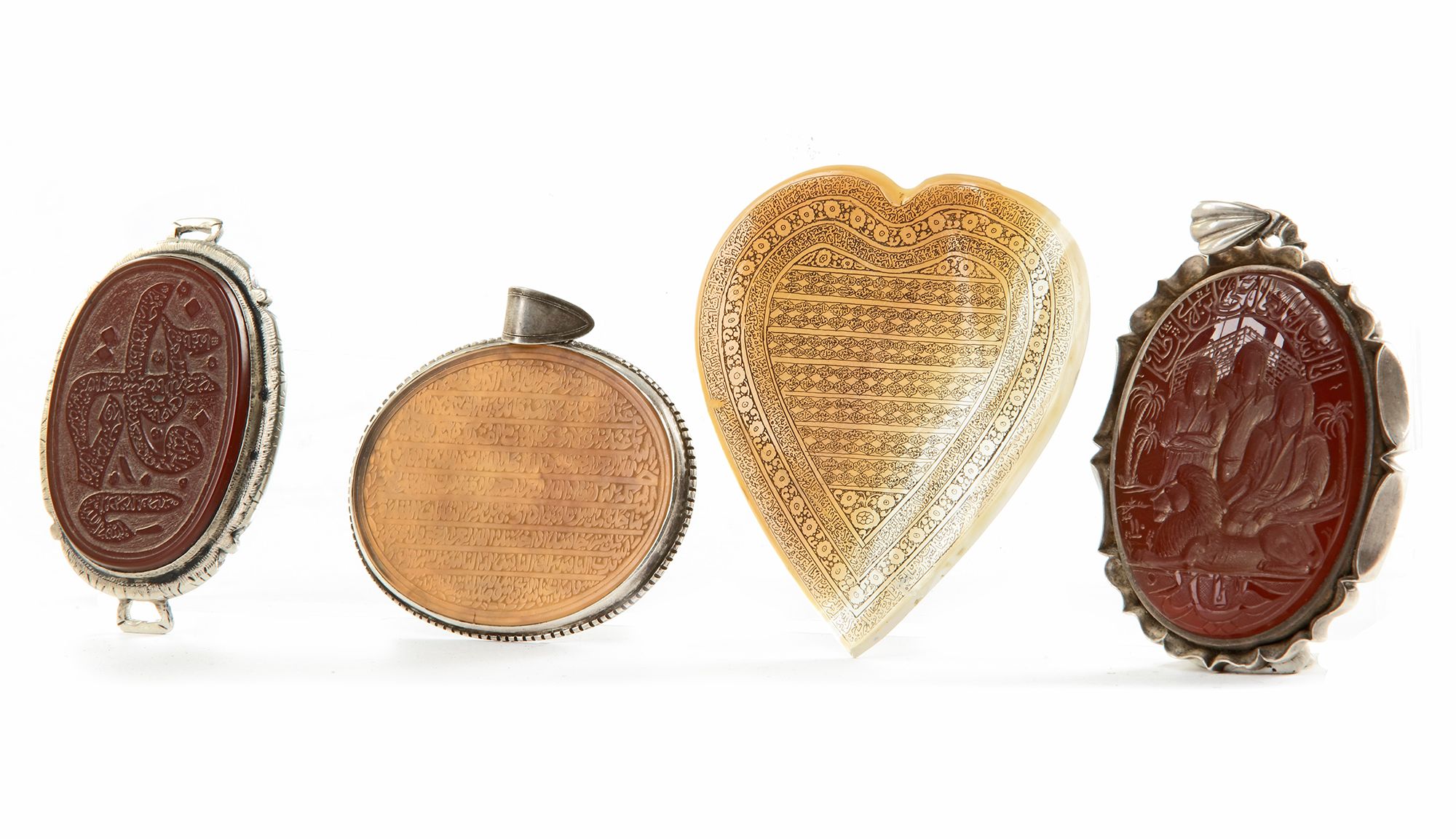 An oval heavy cornelian medallion with silver mounting carved with Imam Ali and his two sons Hasan and Hussein with a lion and an Arabic inscription ‘I am the lion of Allah, I am Ali ibn Abi Talib’. An oval cornelian medallion carved with a large word ‘O, Hafez, safety keeper’ in thuluth script enclosing Quran verse with silver mounting. A heart-shaped agate plaque, inscribed to the centre with the names of Allah in roundels surrounded by tow band of Quran 78 surah Al-Naba 40 verses. An oval cornelian medallion with silver mounting inscribed with Quranic verses, surah Al-Ikhlas, surah Al-Nas and surah Al-Falaq. From left to right: 4.5 by 6 cm., 5 by 6 cm., 6.5 by 8 cm., 5 by 6.5 cm.