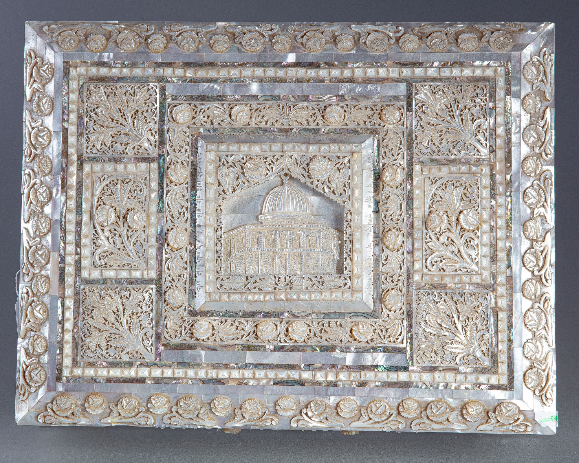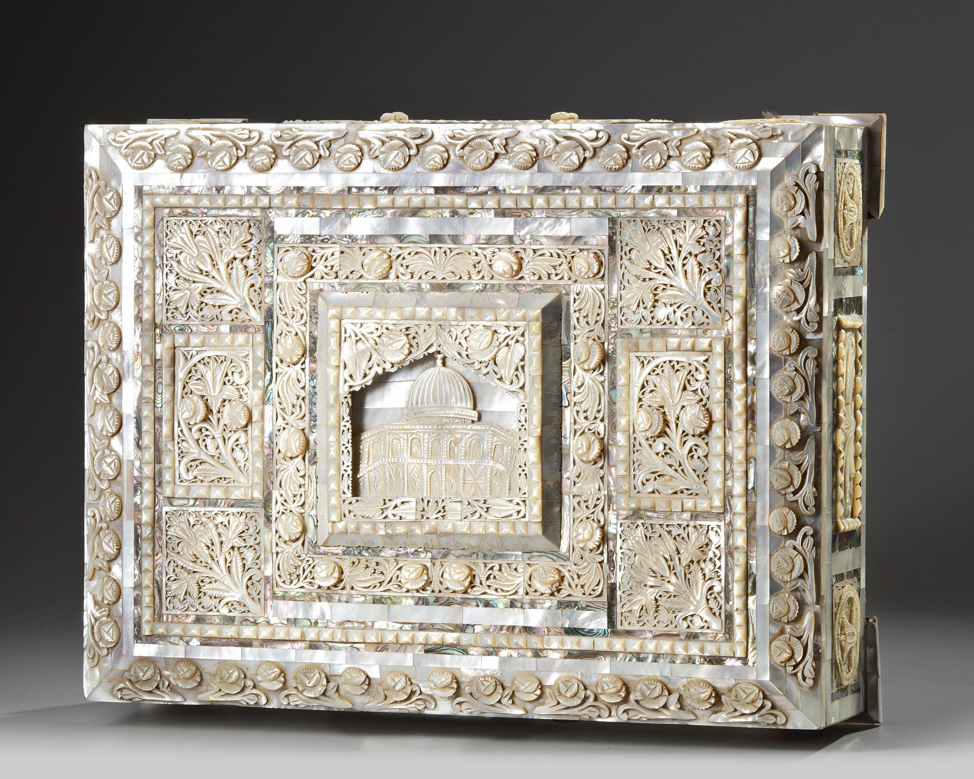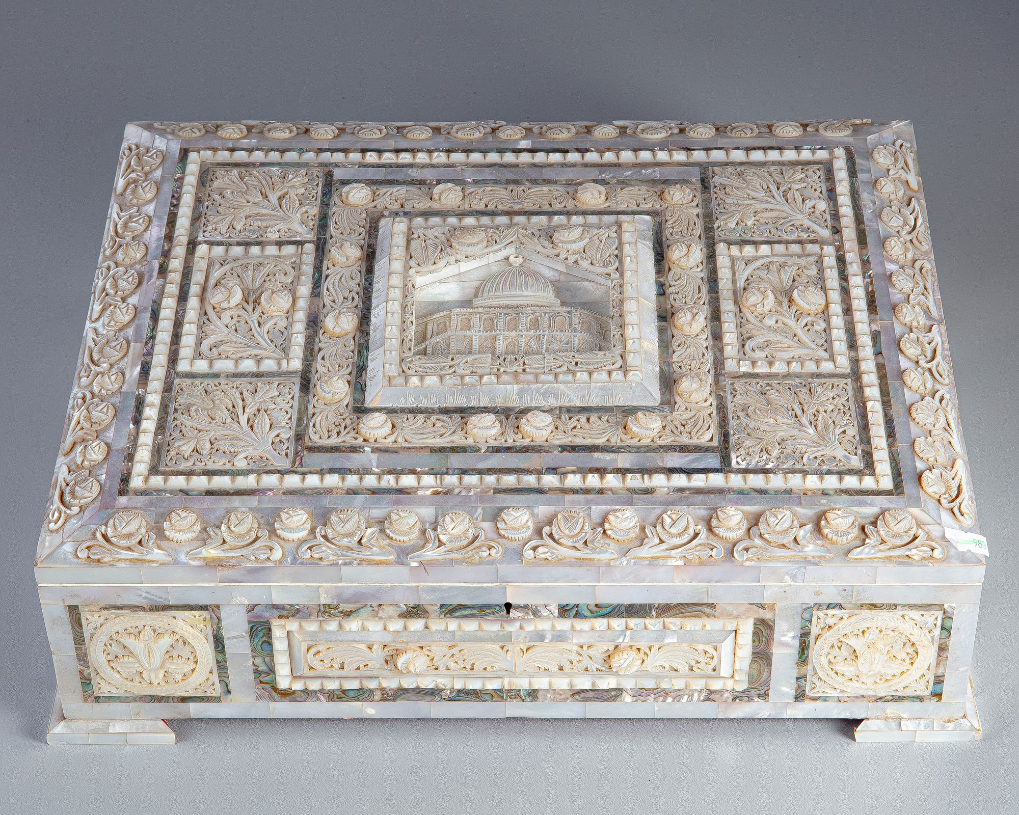Of rectangular form, on four feet, with coffered top. The cover is densely set with mother-of- pearl fragments and bone, decorated to the centre with a over-raised panel of Dome of the Rock, surrounded by pierced foliage work. To the sides with panels of flowers and foliage. 13 by 33 by 43 cm.