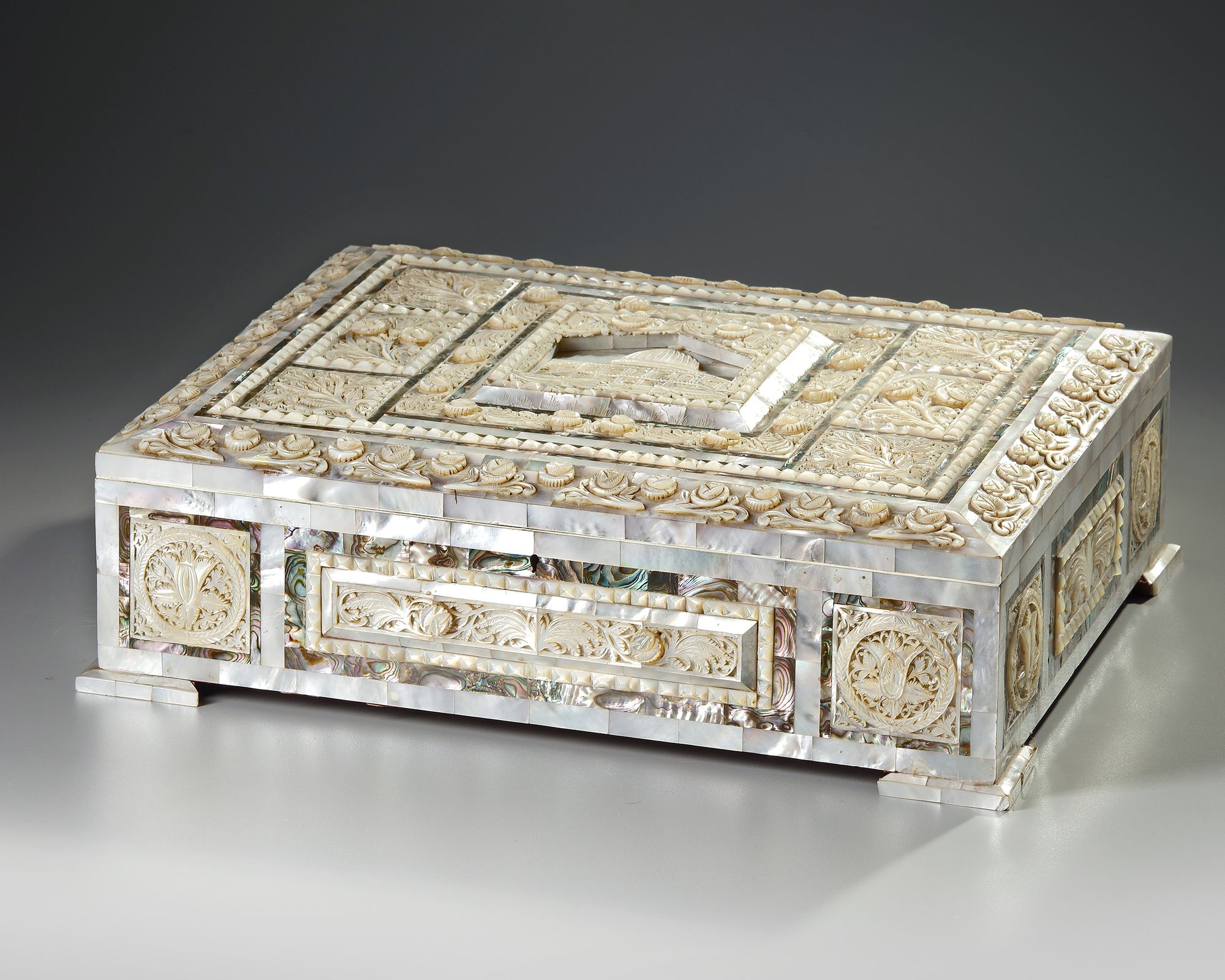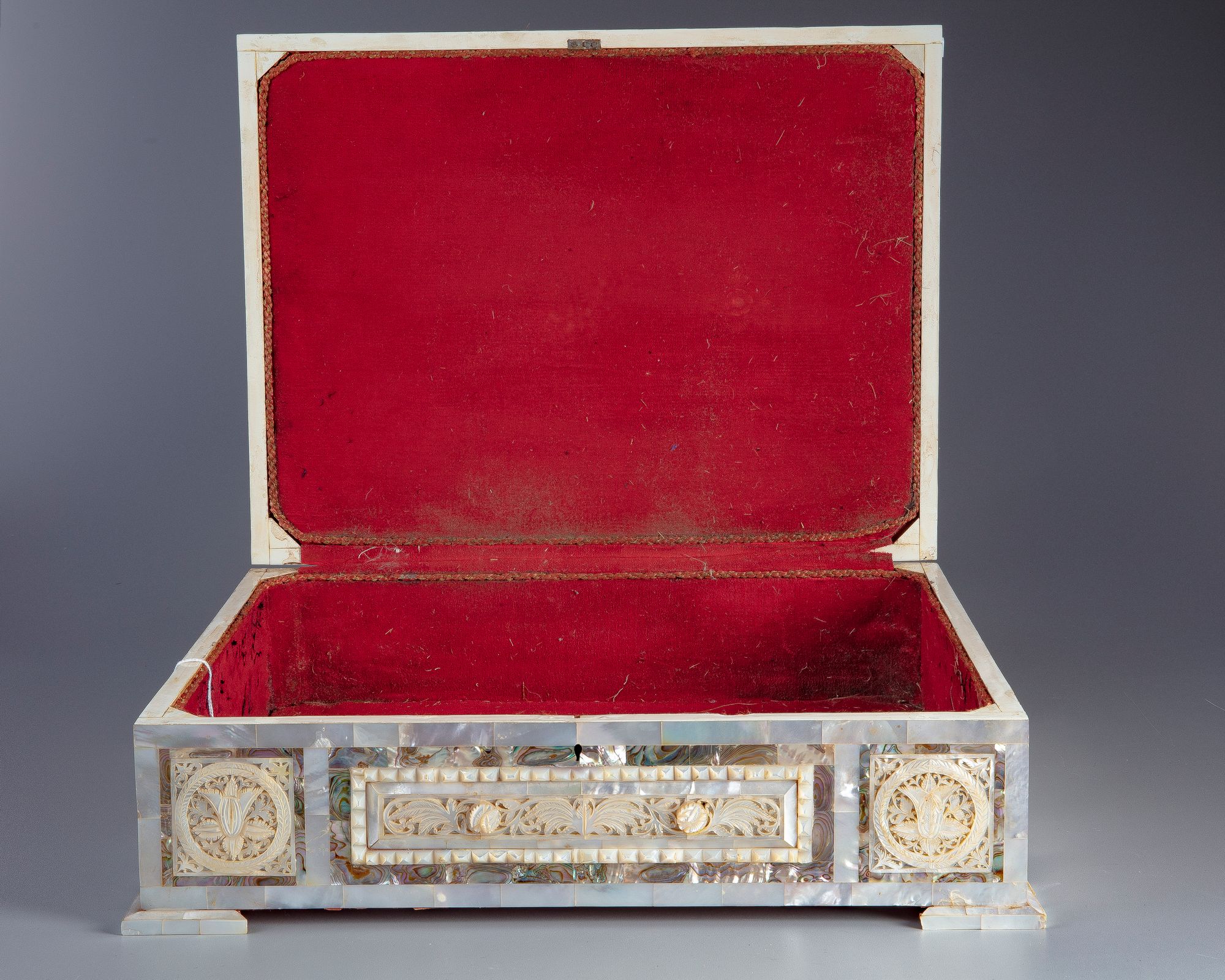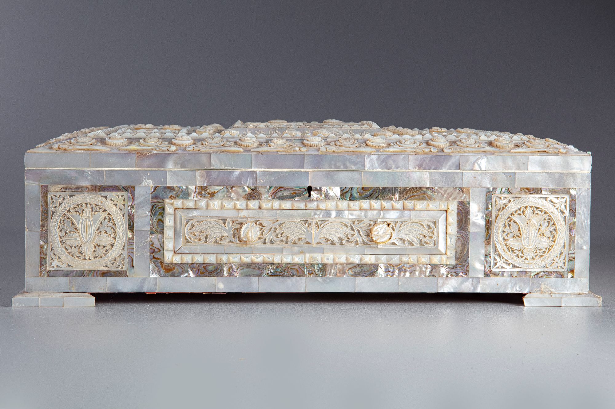 Of rectangular form, on four feet, with coffered top. The cover is densely set with mother-of- pearl fragments and bone, decorated to the centre with a over-raised panel of Dome of the Rock, surrounded by pierced foliage work. To the sides with panels of flowers and foliage. 13 by 33 by 43 cm.