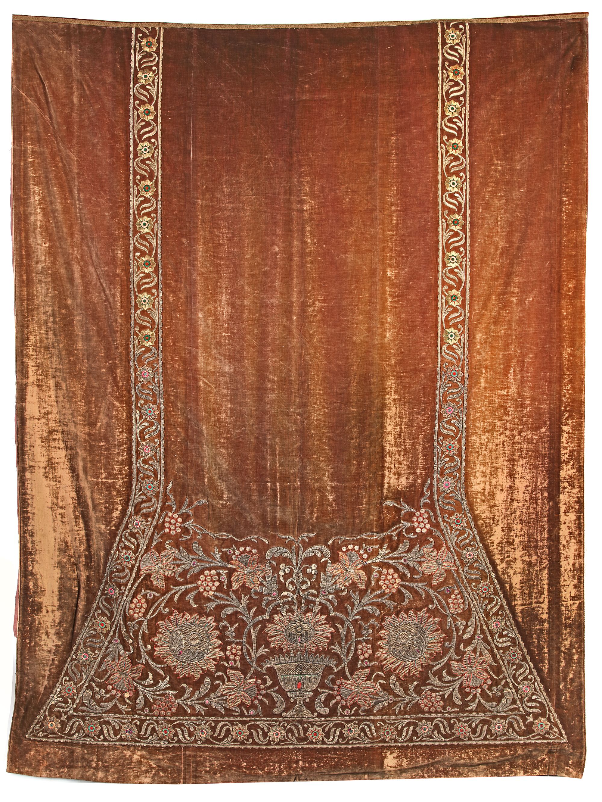 A LARGE BROWN VELVET WITH GILT AND SILVER WIRE EMBROIDERY