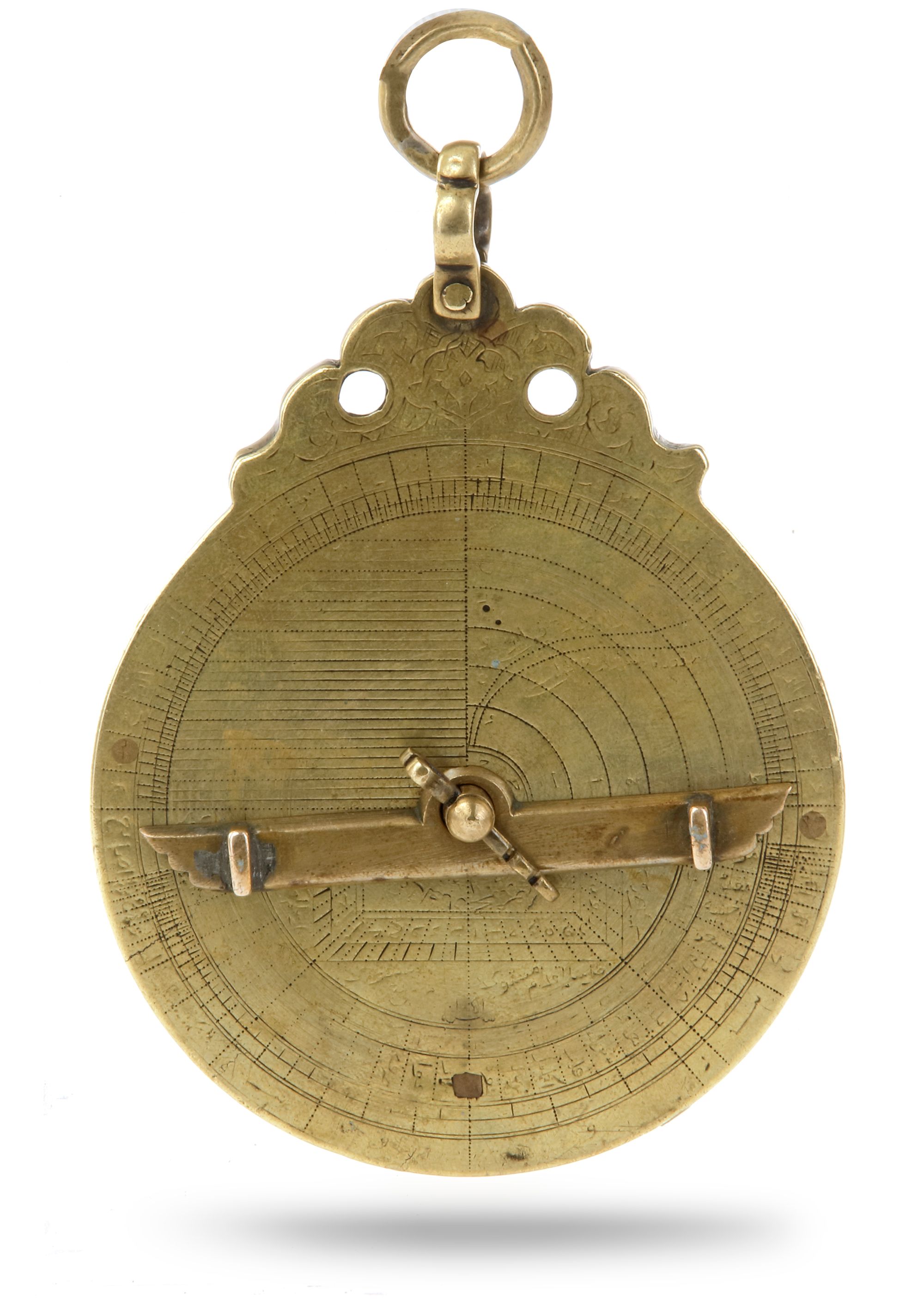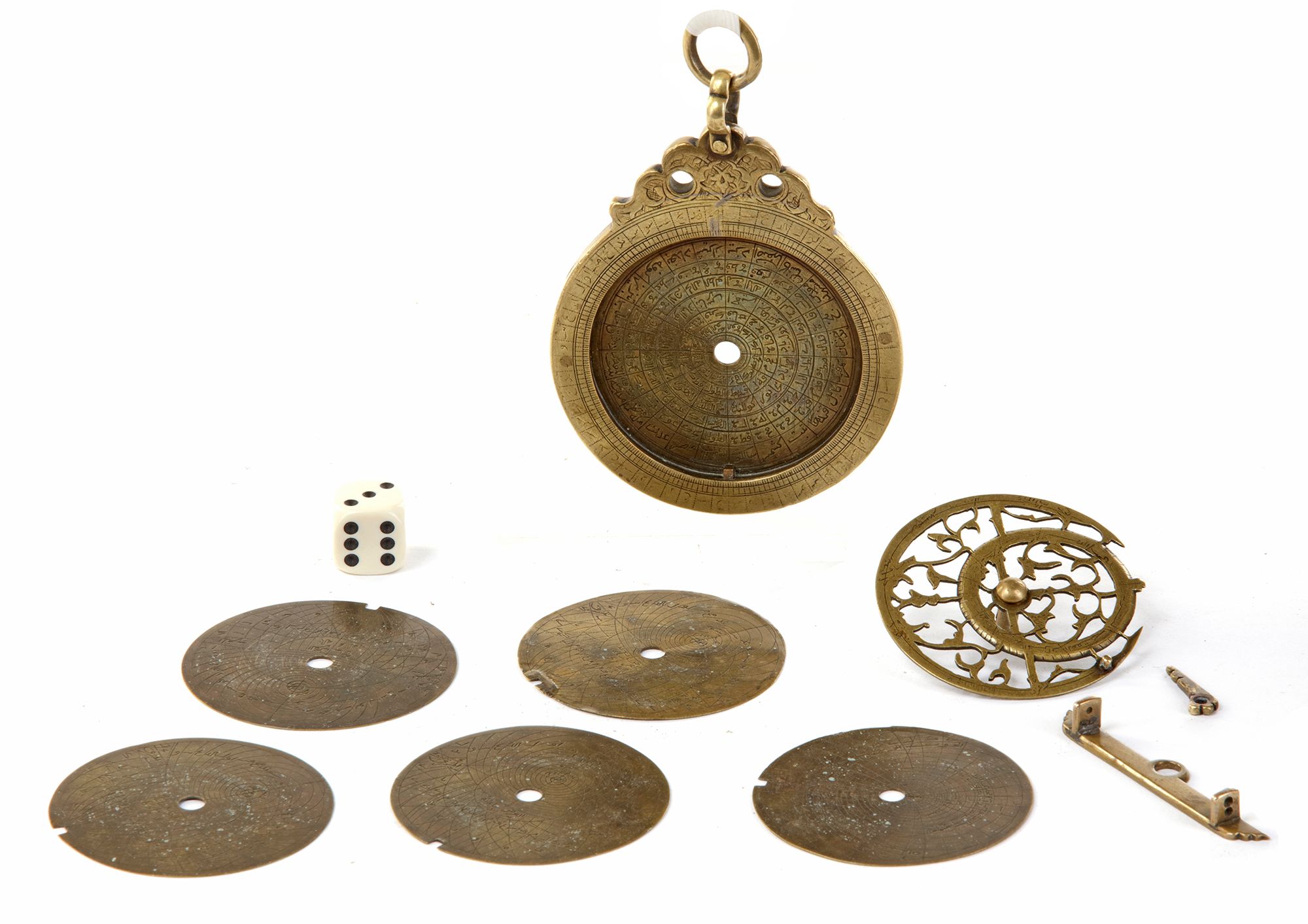Cast brass, mater engraved with the name of maker, containing five plates, openwork rete, alidade to reverse, with pin and horse, suspension loop. 7.7 cm diam.