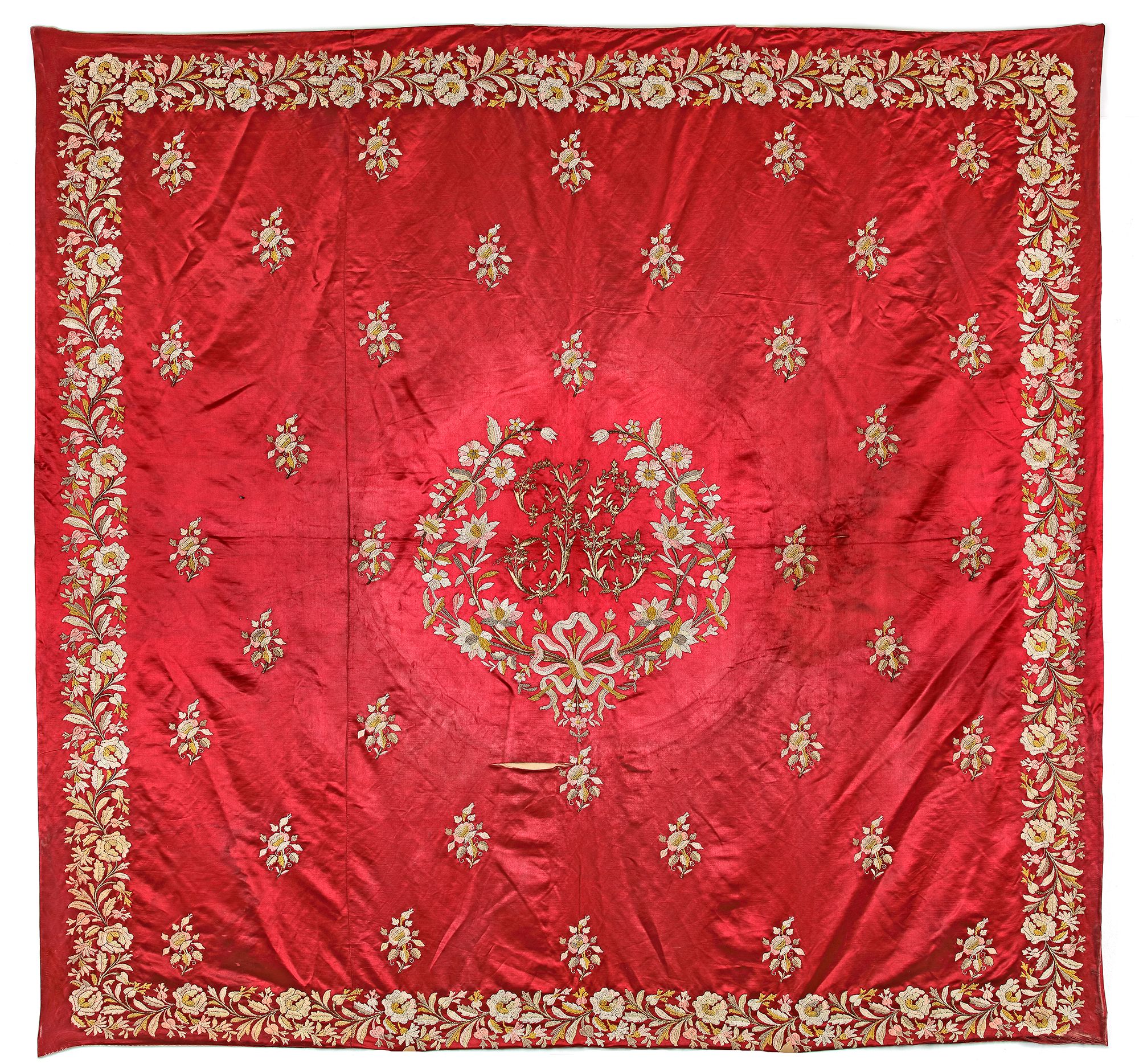An Ottoman silk table cloth embroidered with large ribbon knotted flower sprays, enclosing in gilt threads embroidered foliage.