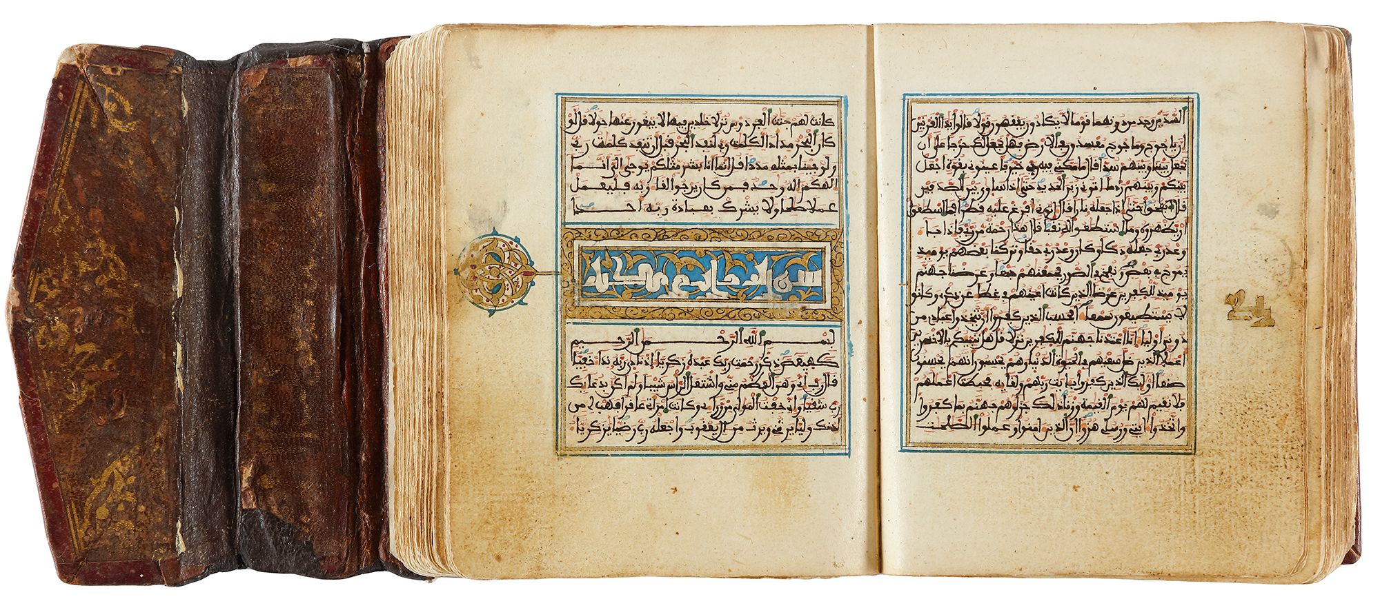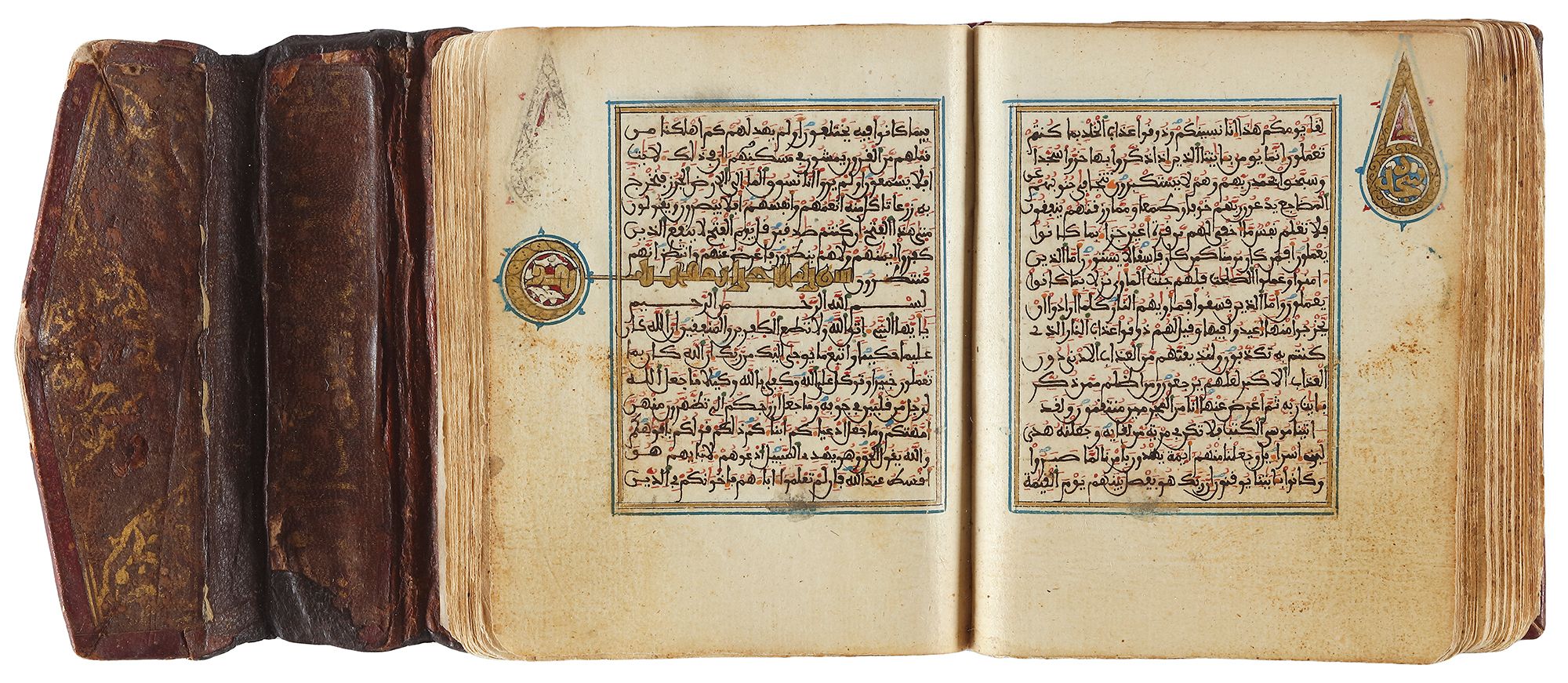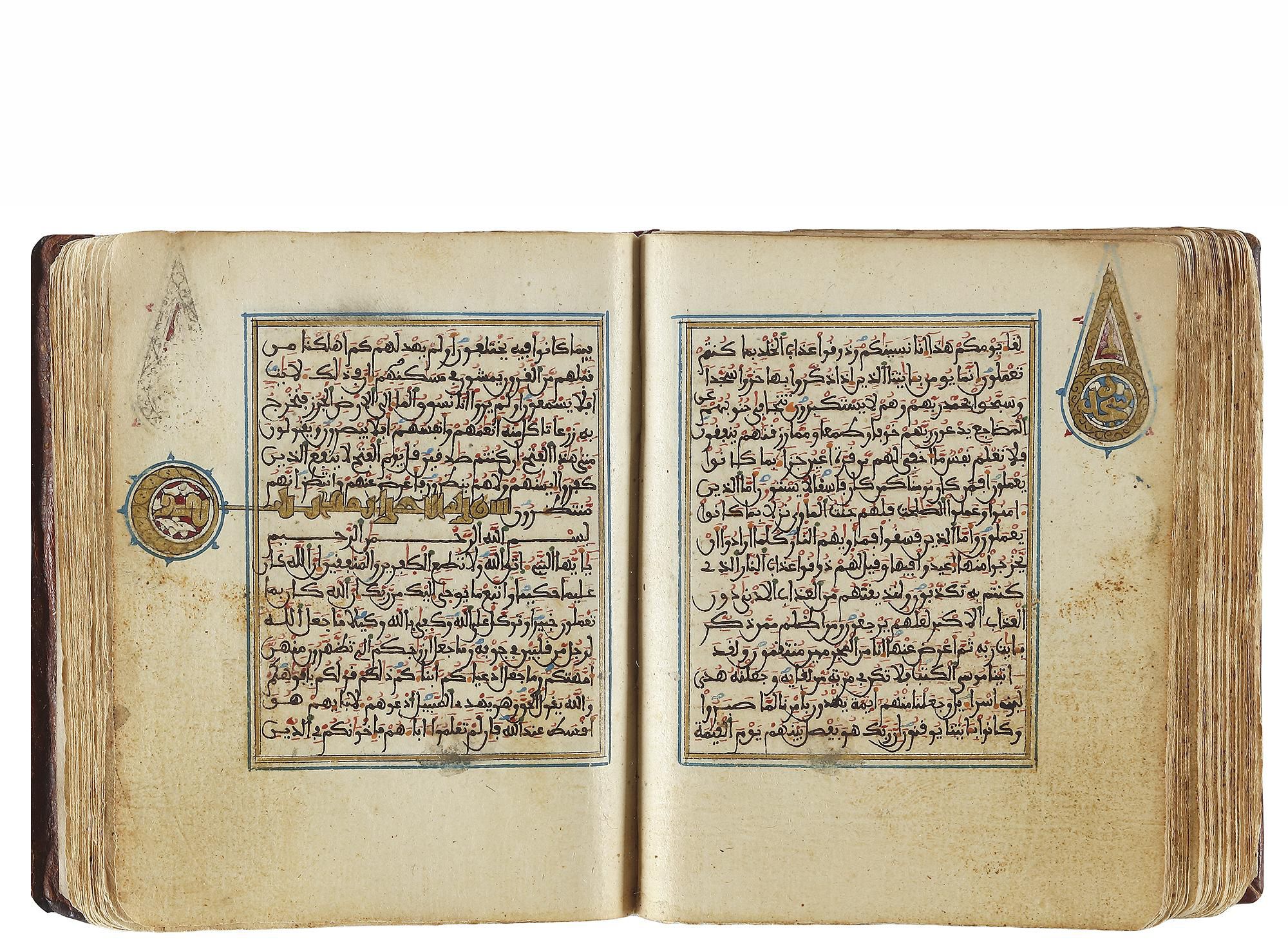 Arabic manuscript on paper, 248 leaves,15 lines to the page written in minute Maghribi script in black ink with diacritics and vowel points in blue and red, red dots between verses inner margins ruled in gold and blue, catchwords, illuminated devices in wide outer margins, surah headings written in eastern Kufic script in gold, covers richly decorated with geometric motifs in gold, with flap. 10 by 8 cm.