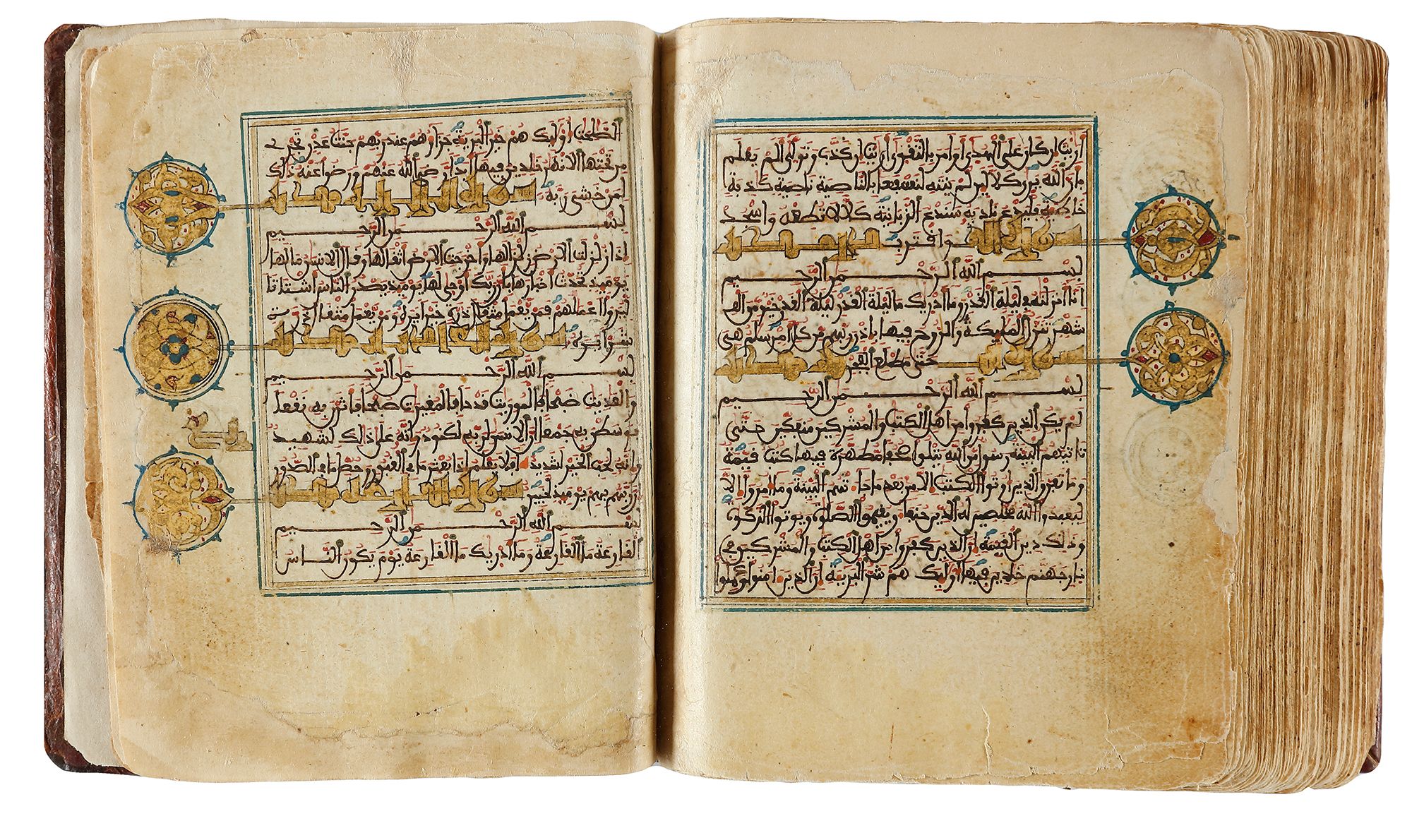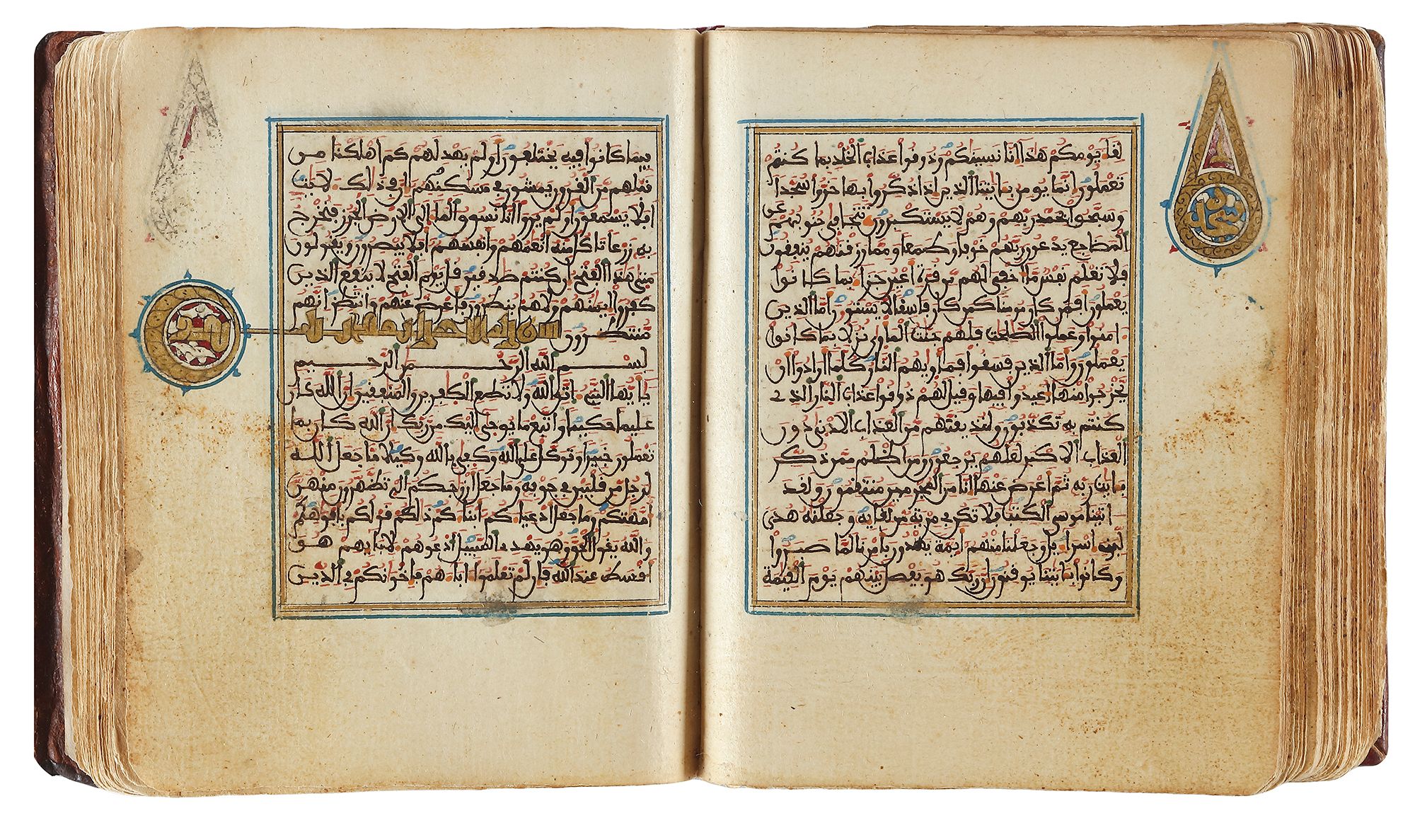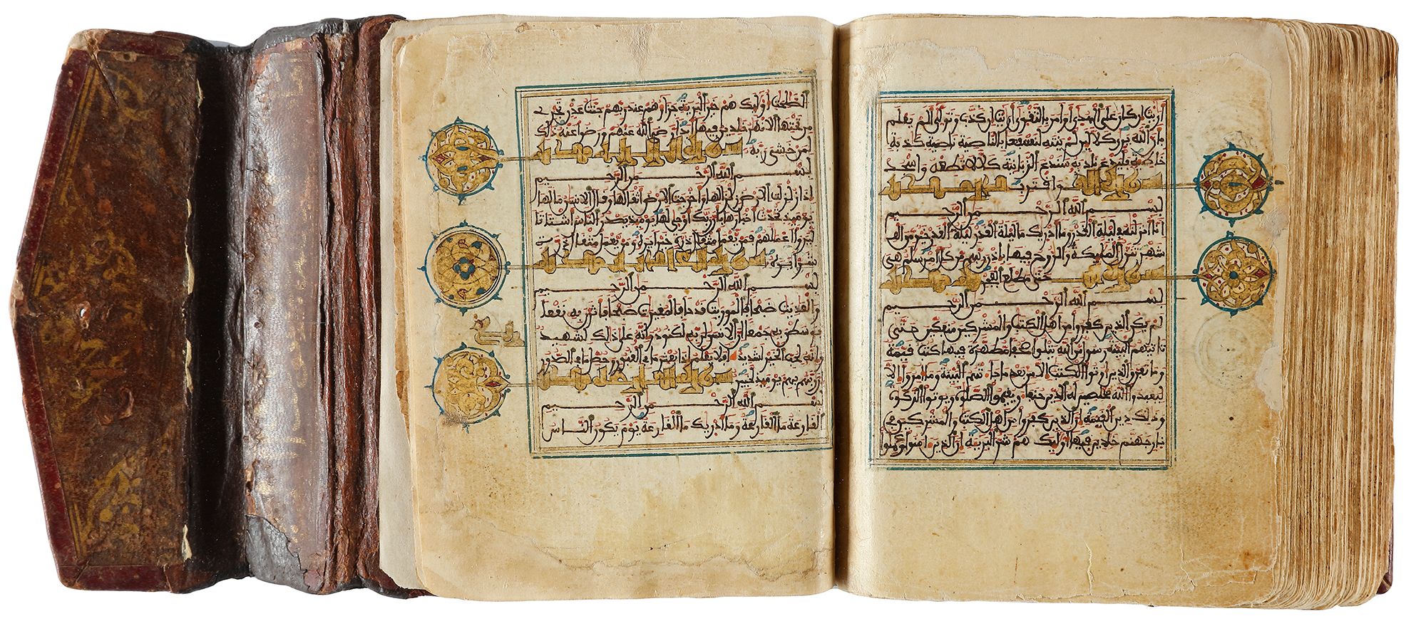 Arabic manuscript on paper, 248 leaves,15 lines to the page written in minute Maghribi script in black ink with diacritics and vowel points in blue and red, red dots between verses inner margins ruled in gold and blue, catchwords, illuminated devices in wide outer margins, surah headings written in eastern Kufic script in gold, covers richly decorated with geometric motifs in gold, with flap. 10 by 8 cm.
