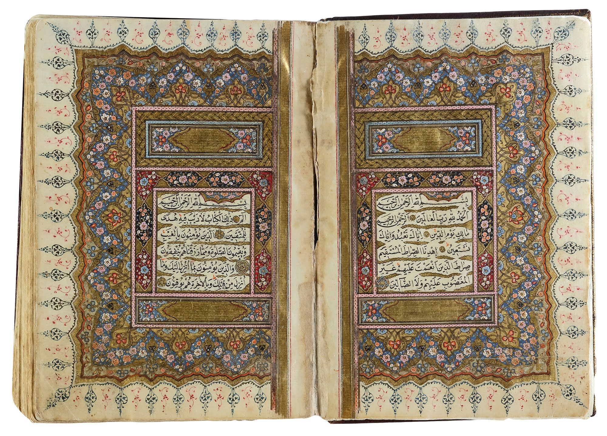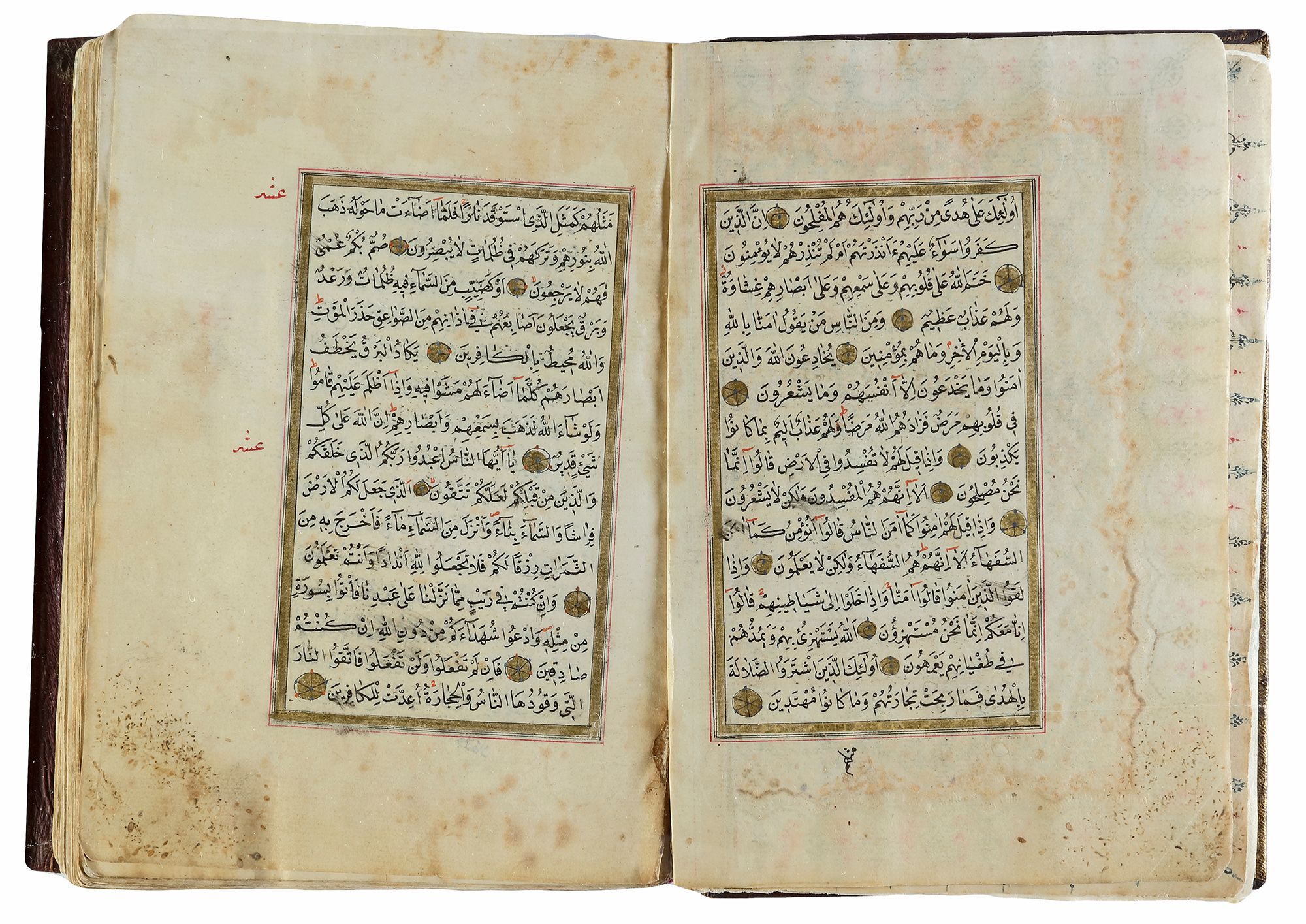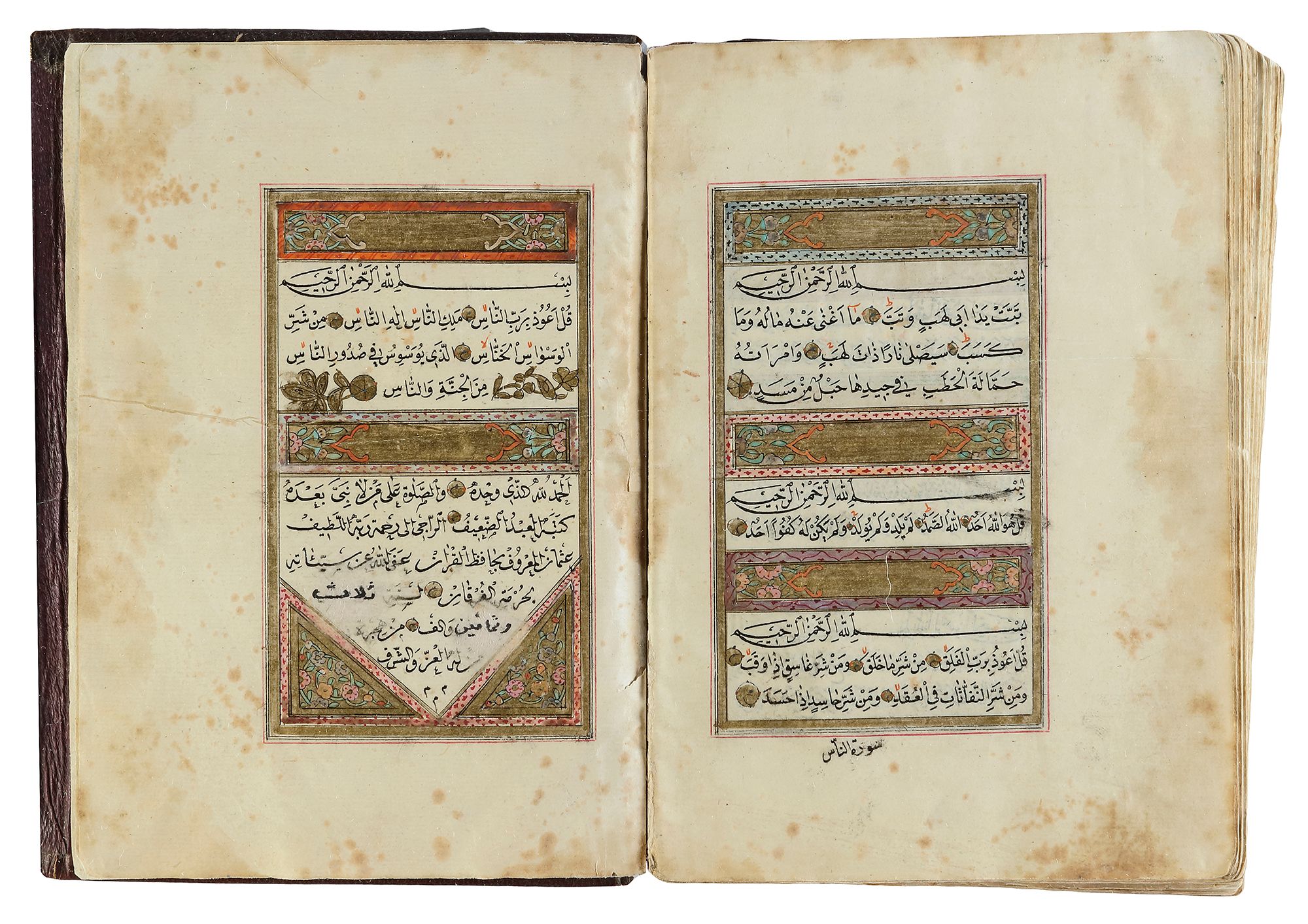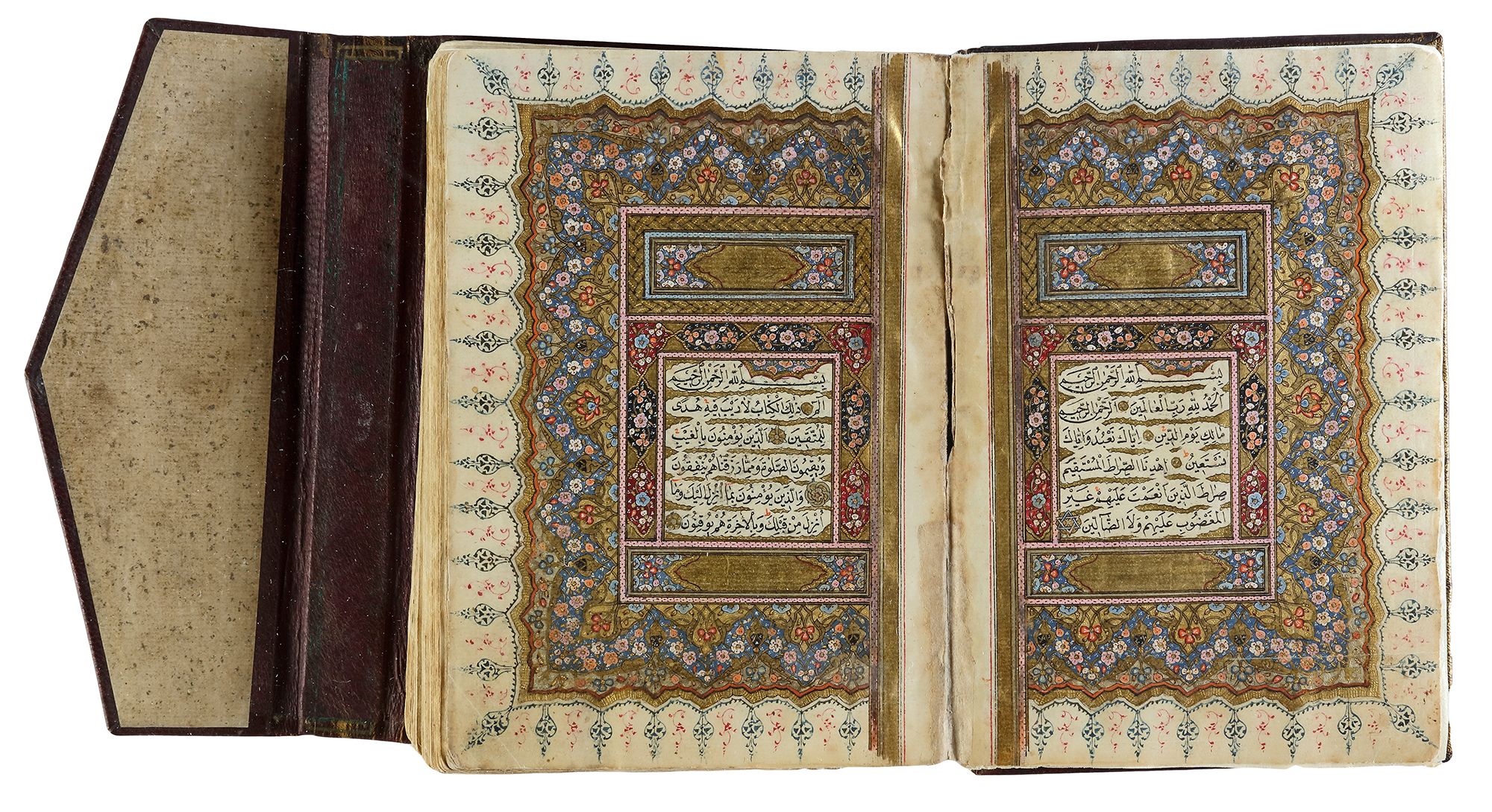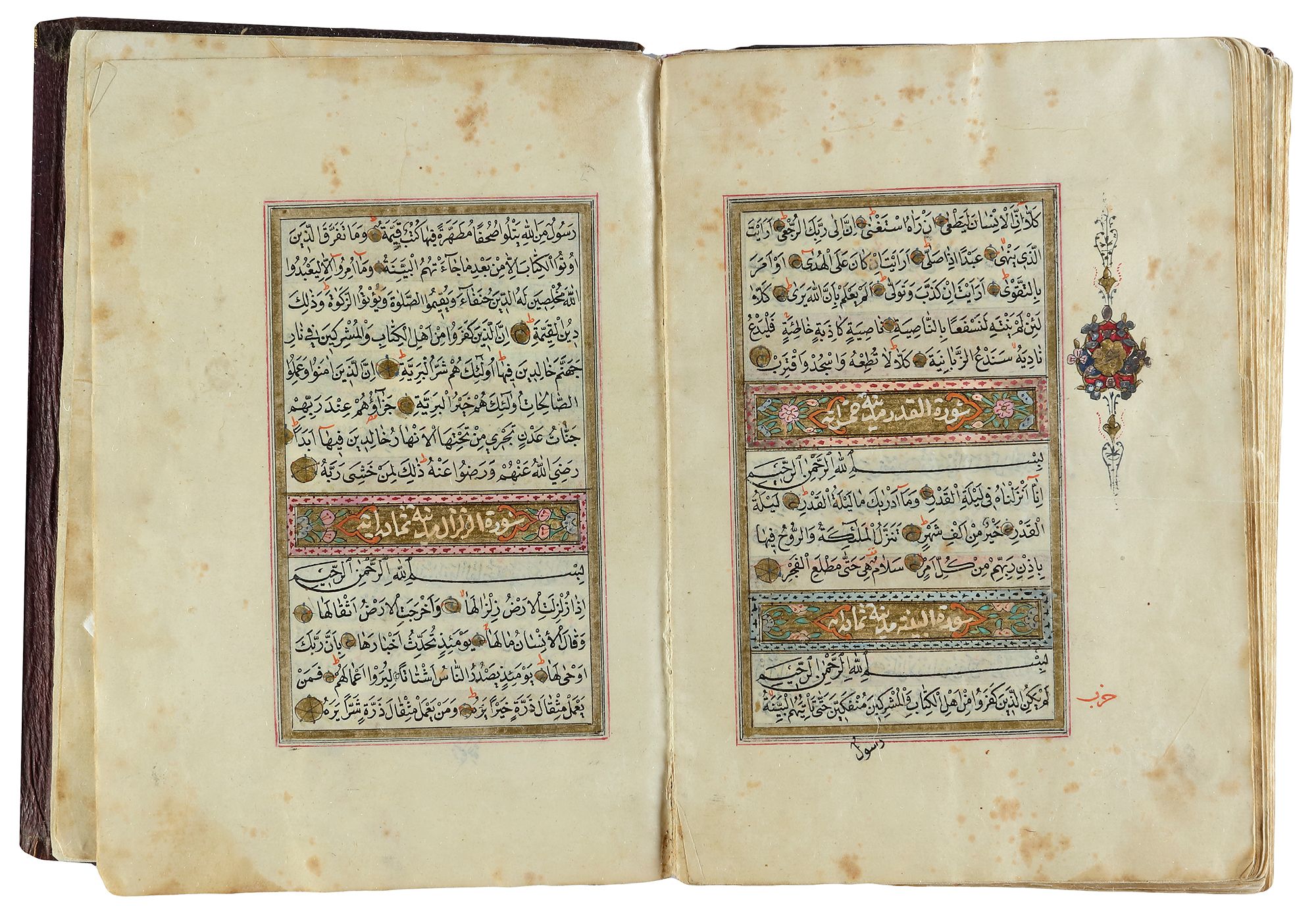 An Arabic manuscript on paper,15 lines to each page in bold black naskh script within a gilt and polychrome borders. A complete Quran, surah headings in white thuluth within gilt and polychrome cartouches, two opening biofolia with striking blue and gilt decorated borders. Gold verse markers pointed in blue and red dots, gilt occasional marginal " Hizb and Juz " markers. Binding with brown morocco decorated with golden palmettes. 11 by 16 cm