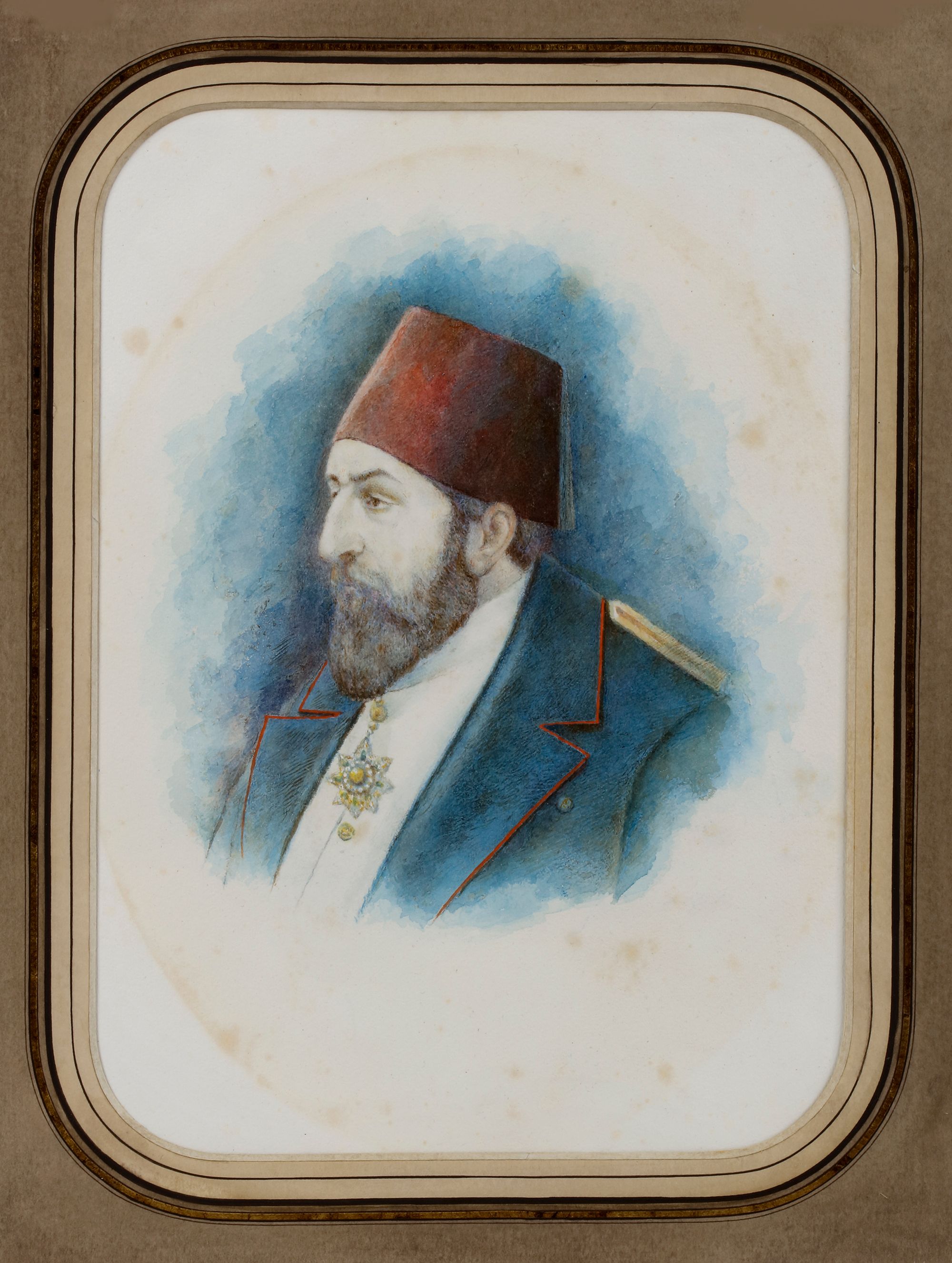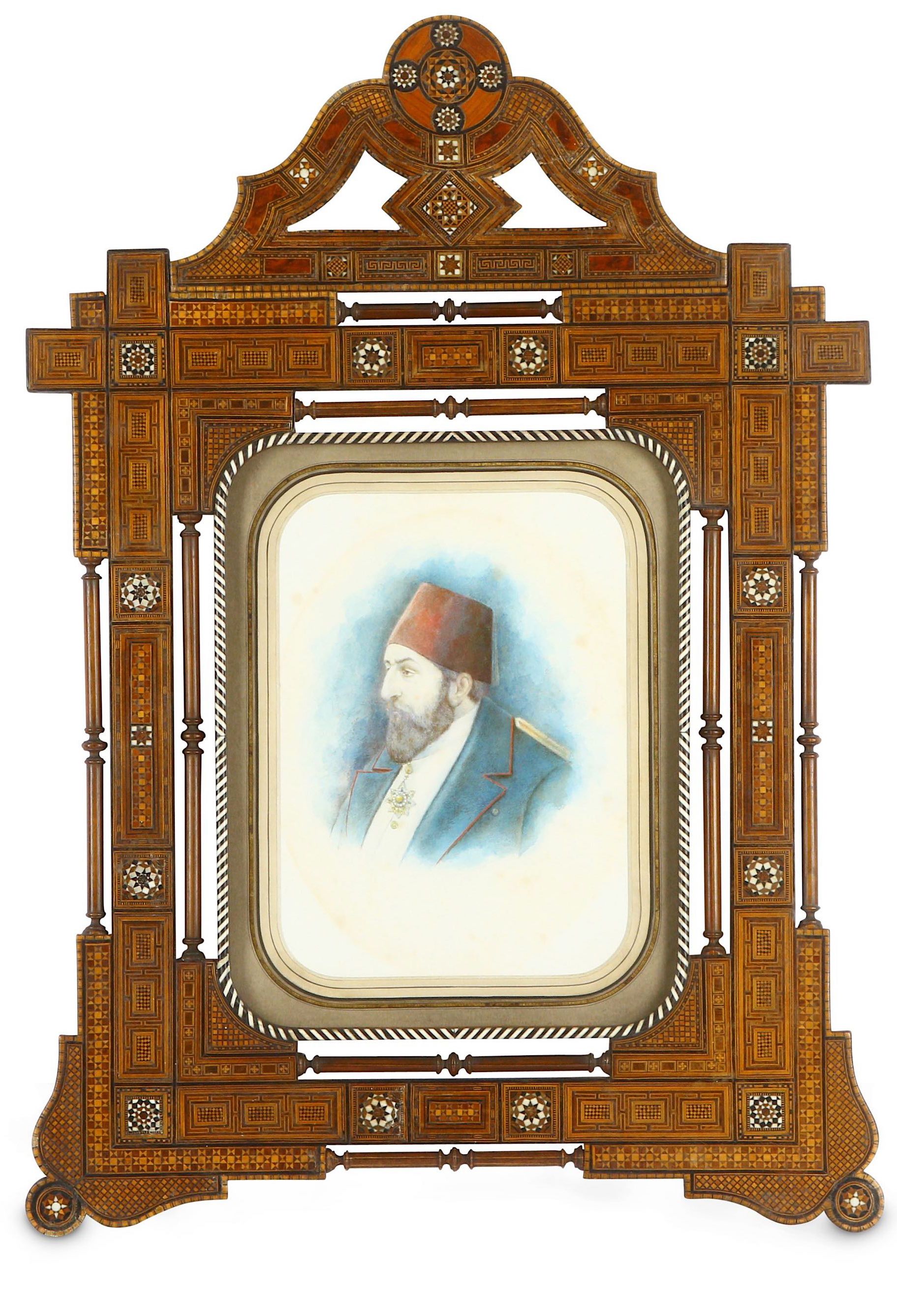 Opaque pigments on paper, depicting the three-quarter profile of sultan Abdul Hamid II, wearing his typical red fez hat. The blue military jacket and a white shirt with an European-inspired military star decoration. The painting style clearly influenced by western military portraits. Encased within an ivory and colored woods-inlaid frame, decorated with typical geometric star motifs, grid patterns and bands of fretwork. Fausto Zonaro (18 September 1854 – 19 July 1929) was an Italian painter, best known for his realist style paintings of life and history of the Ottoman Empire. 33 by 25 cm.