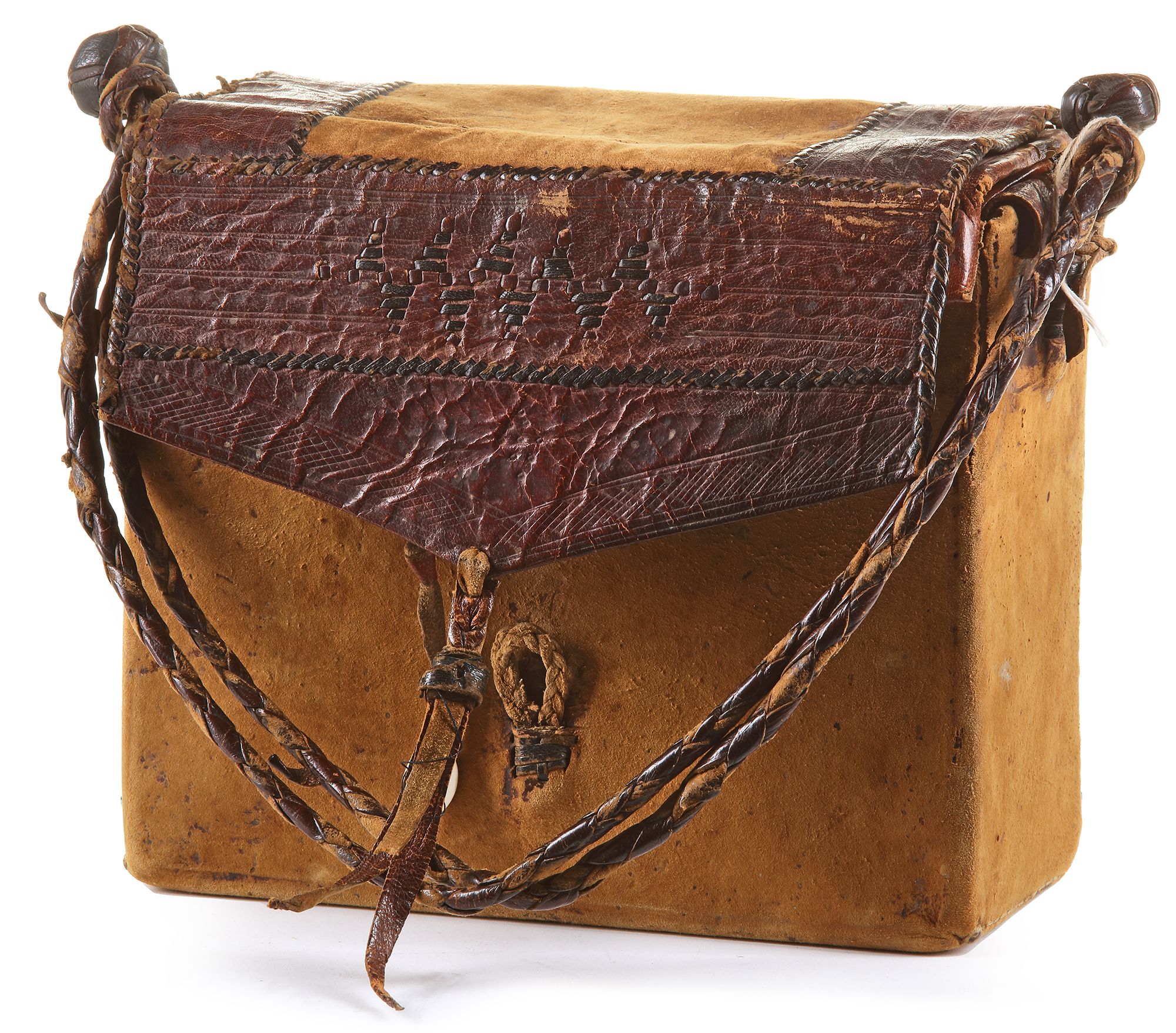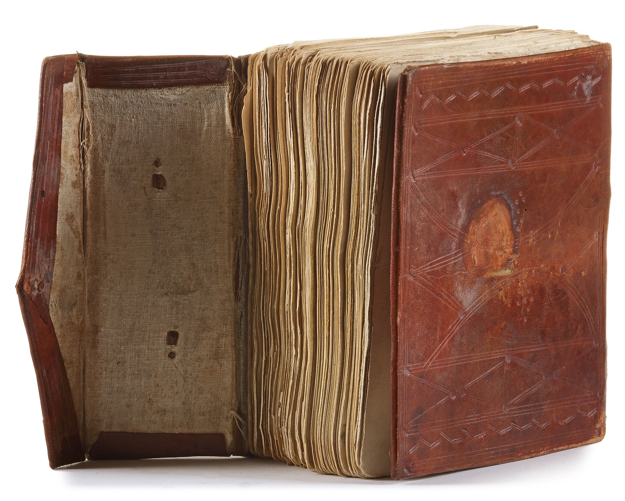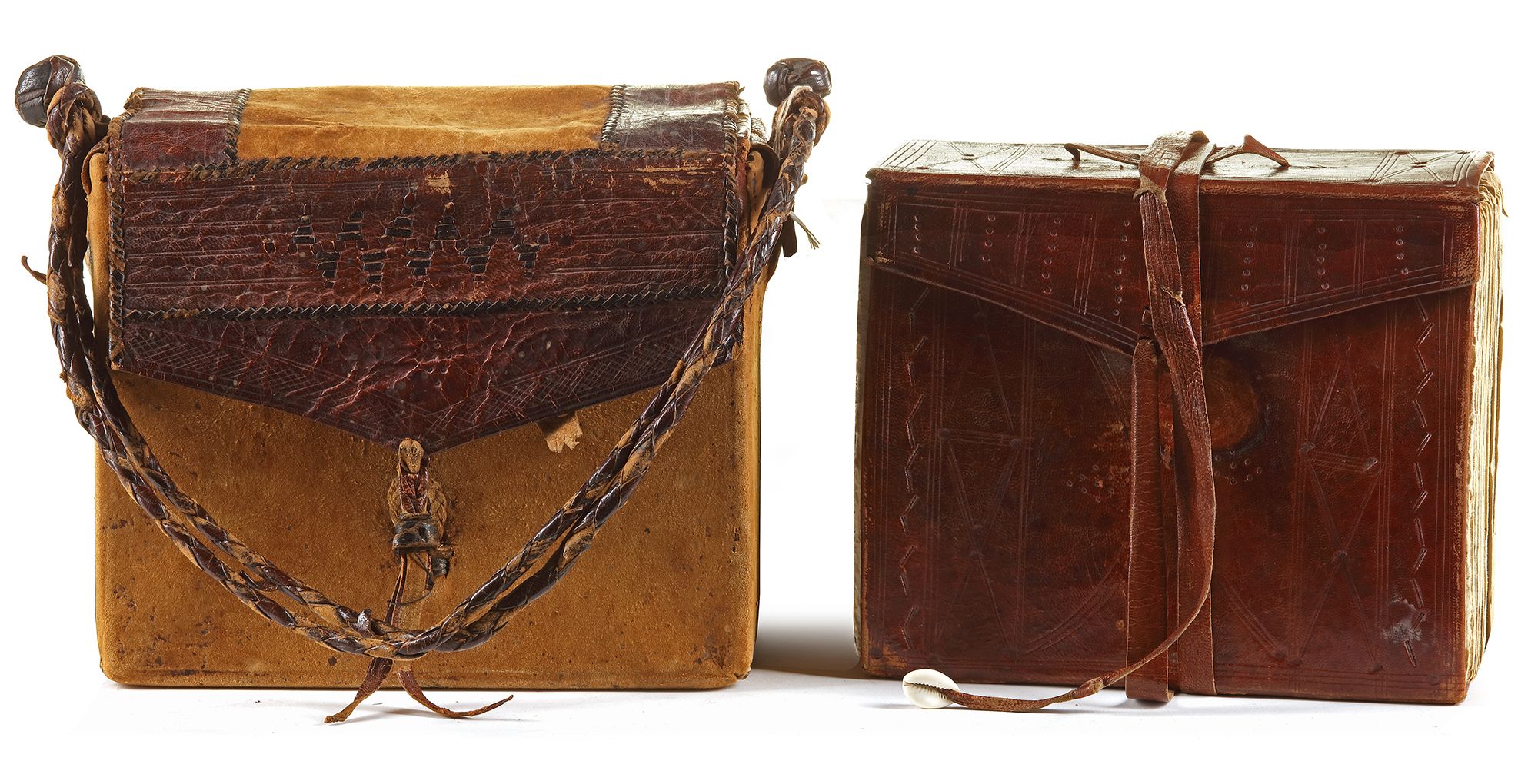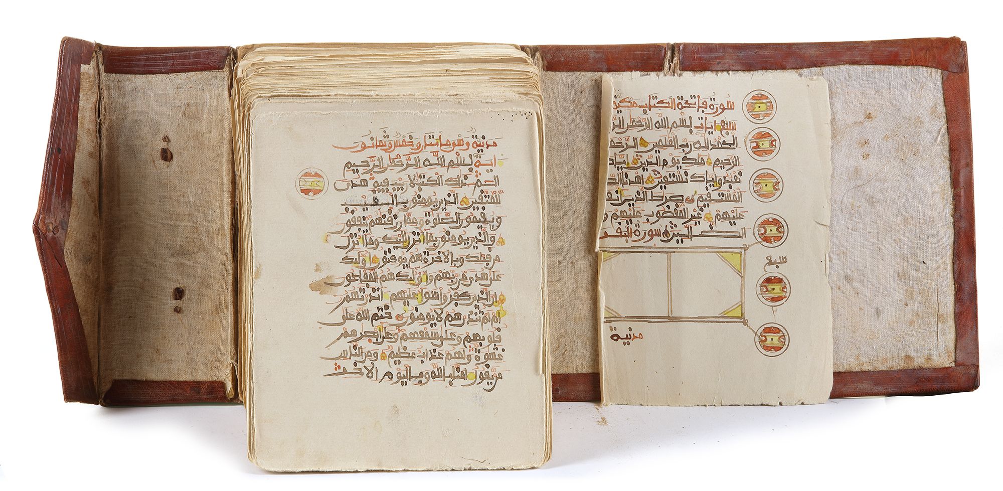 Arabic manuscript on paper, 593ff., each loose folio with 12ll. of sepia ink crude maghribi script, diacritic marks and vocalization in red and orange ink, the verse markers yellow dots turning into roundels with longer sequences, marginal notes and sporadic illuminations in the shape of roundels and star-shaped elements, grouped within a tooled brown calf leather case-shaped binding, held within a camel leather squared bag.