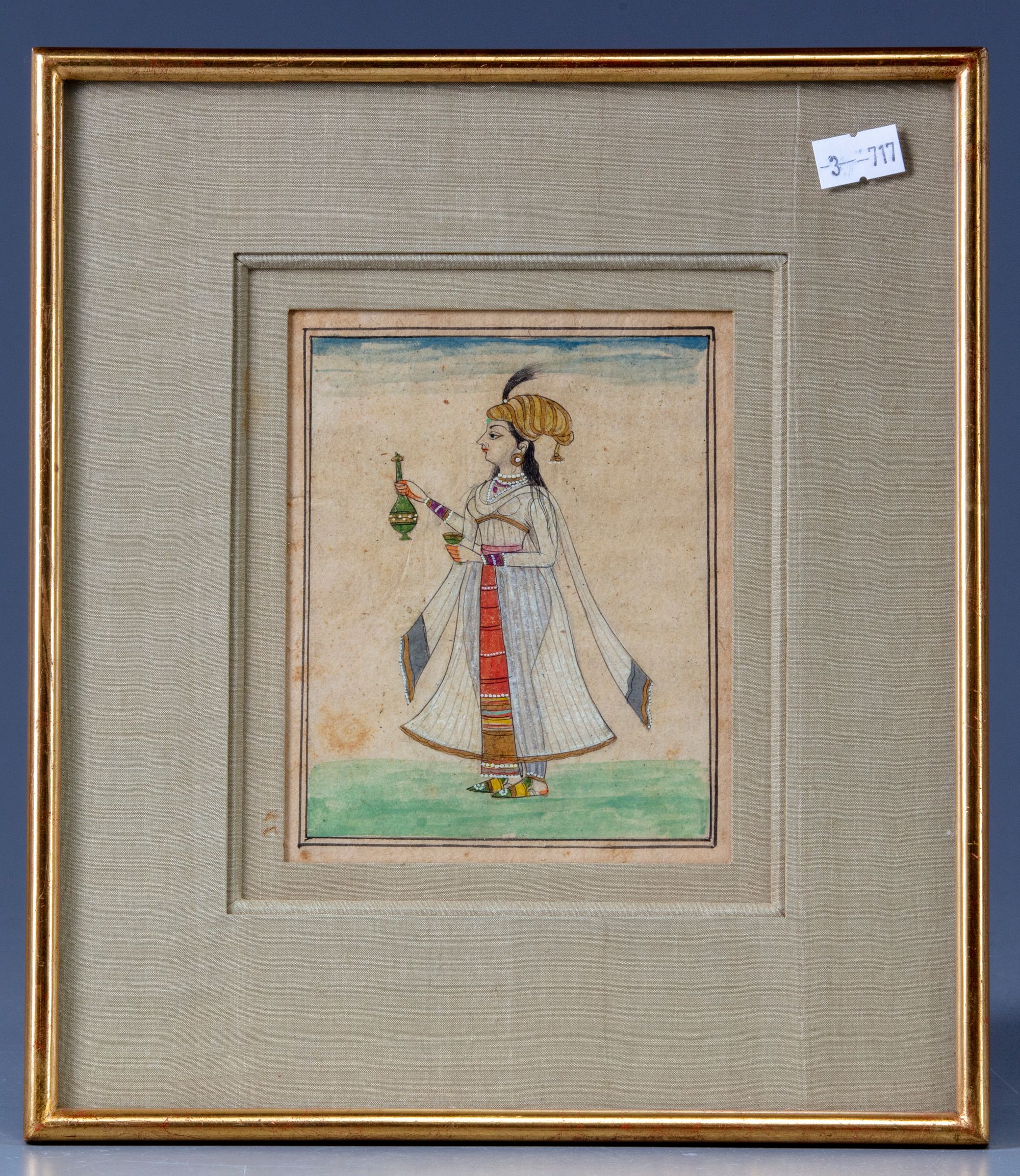 Gouache heightened with gold on paper, depicting a standing princess holding a vase and a cup in her hands.