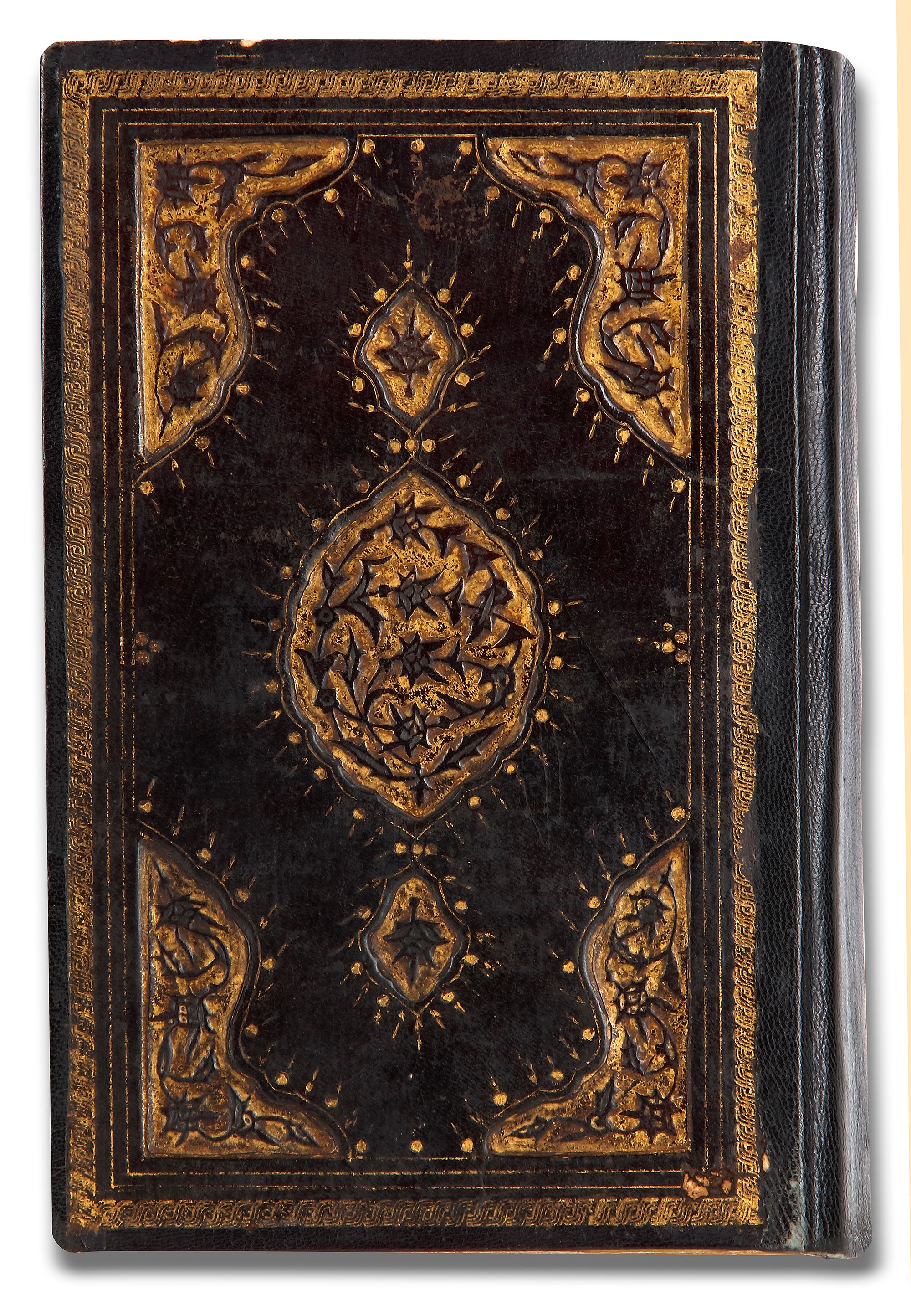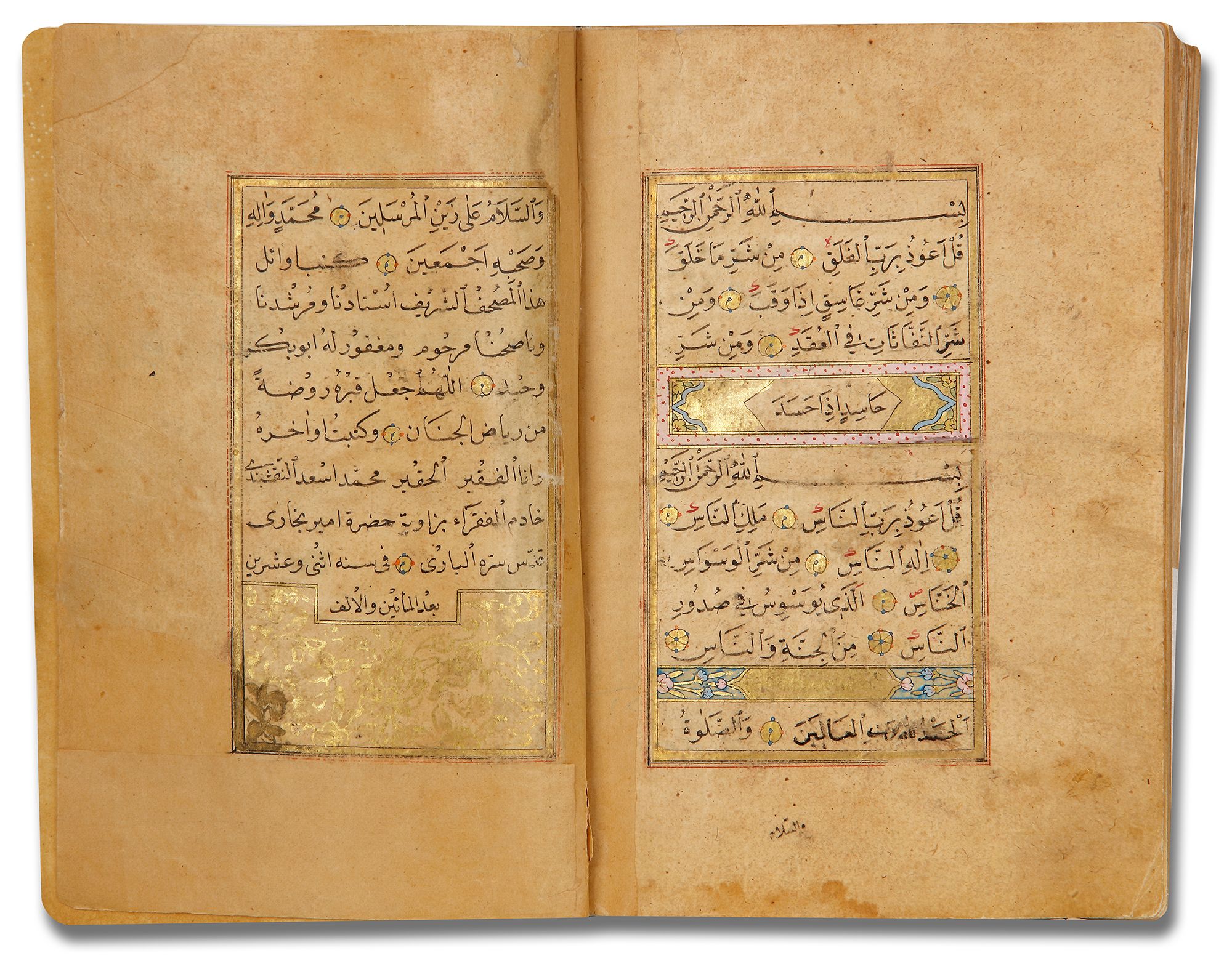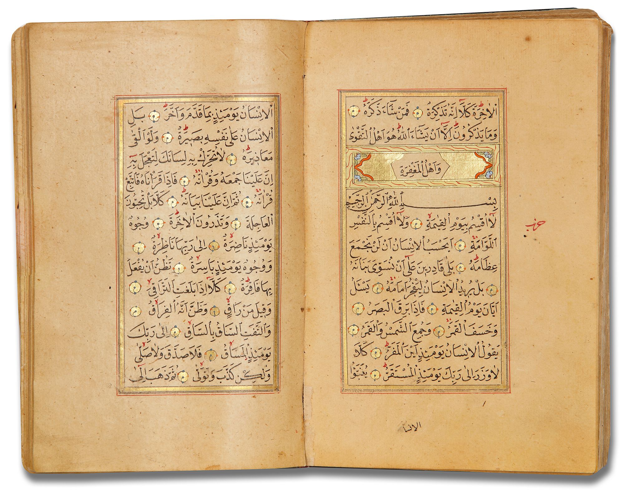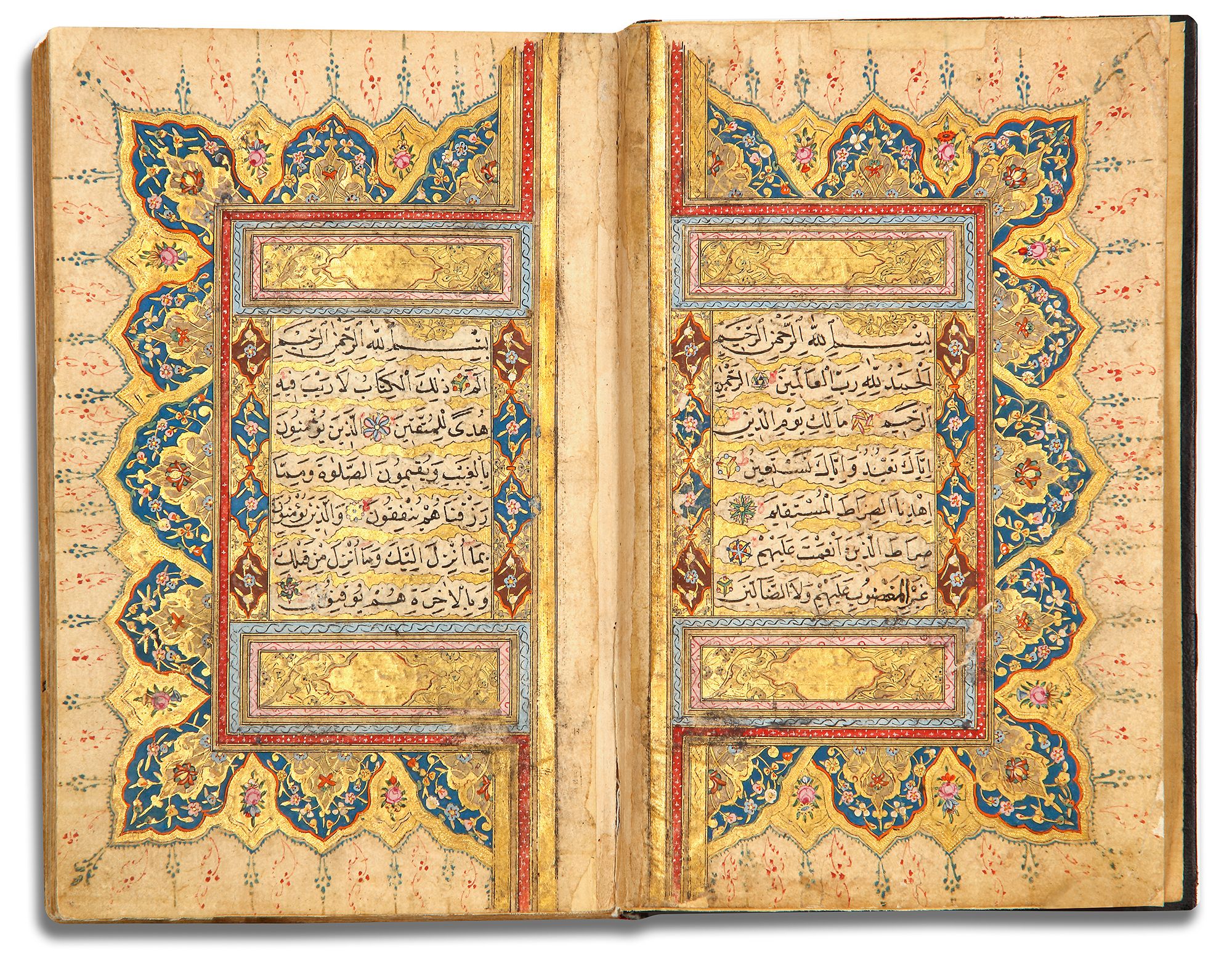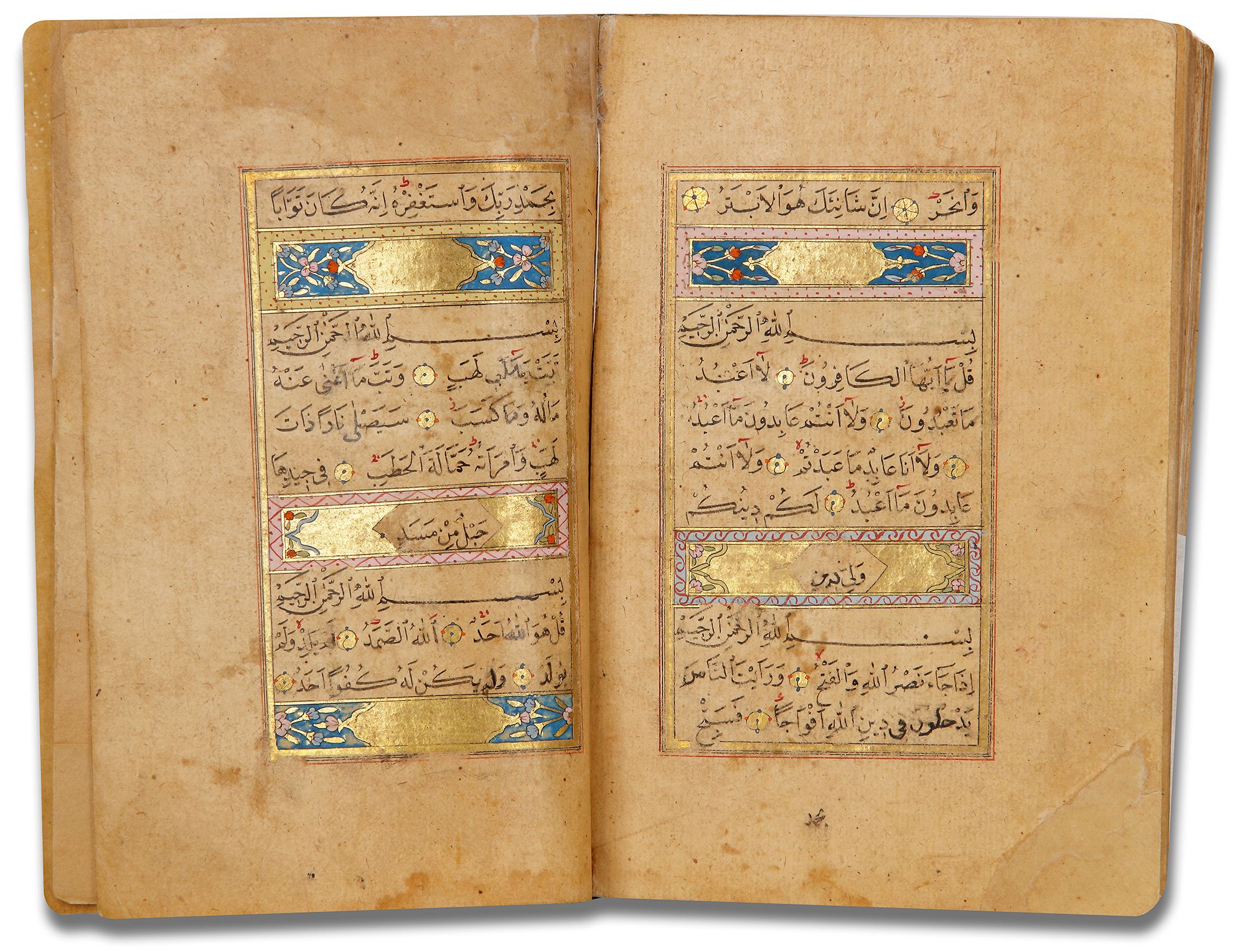 Arabic manuscript on paper, 419 leaves, 13 lines to the page written in neat naskh script in black ink with diacritics and vowel points in red and black ink, gold roundels between verses, inner margins ruled in two shades of gold and red, catchwords, surah headings written in thuluth in black within illuminated rectangular panels, one illuminated double-page frontispiece in colors and gold, occasional illuminated devices in wide outer margins, brown morocco with stamped gilt central medallion.
