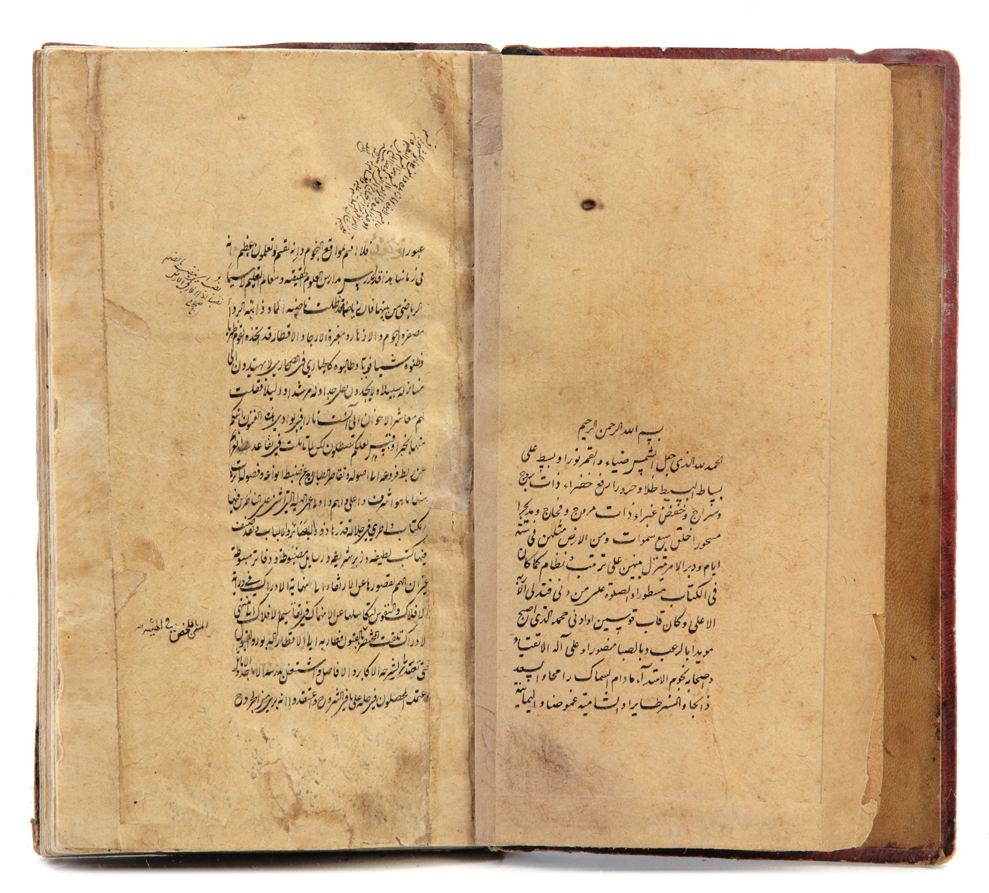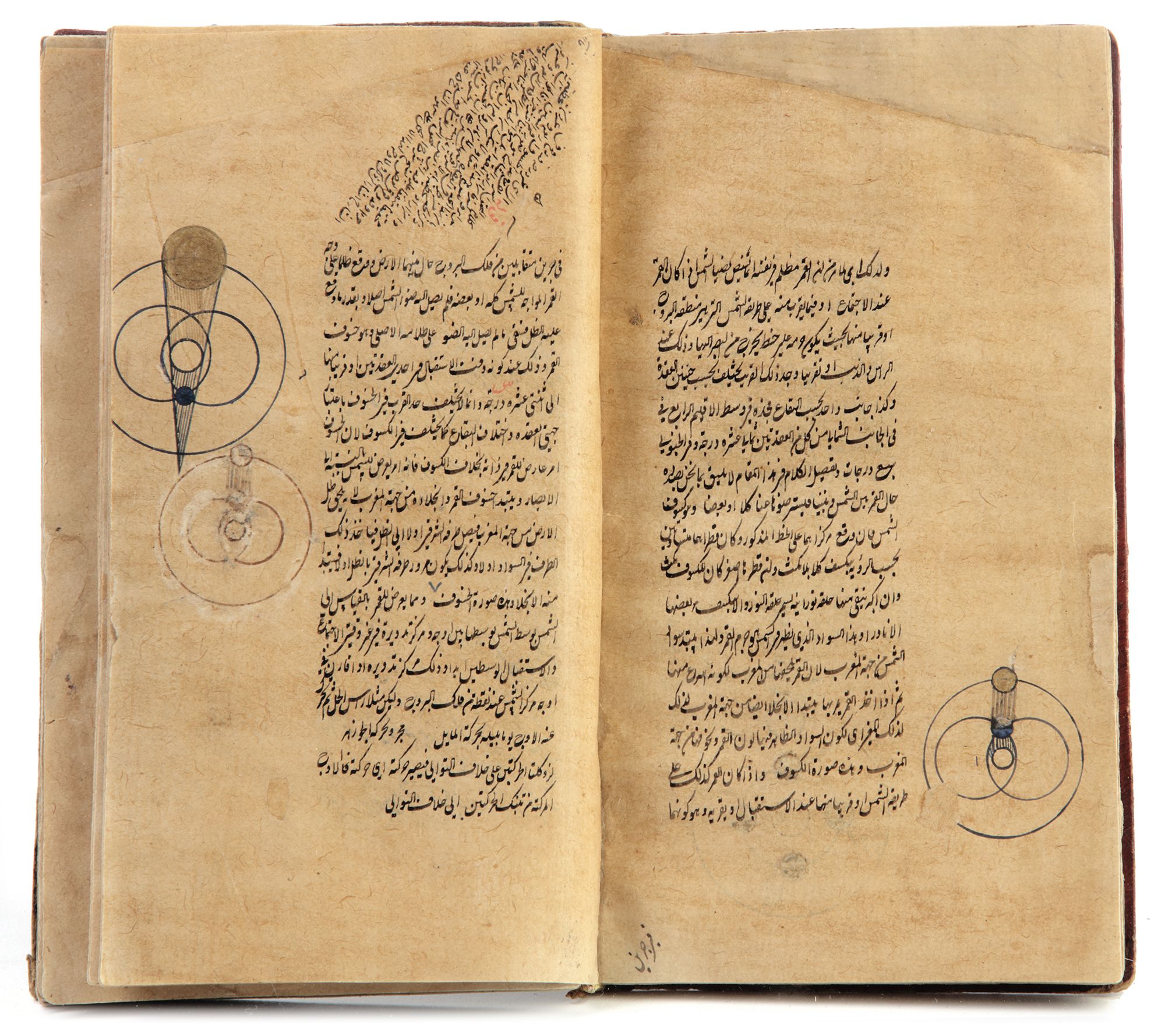 Elementary textbook of astronomy by Sharaf al-Dīn Mahmud ibn Muhammad ibn ‘Umar al-Jaghmini al-Khwarizmi 603 AH/1207 AD with a commentray about the book by Ibn Mahmud known as Qadi Zada al-Rumi Arabic manuscript in black and red ink, 88 leaves with 2 fly leaves with marginal notes.The text contains 57 illustrations of the following diagrams: the cosmos and the spheres of the Sun, the stars, Mercury and the Moon. 18.5 by 10.8 cm.