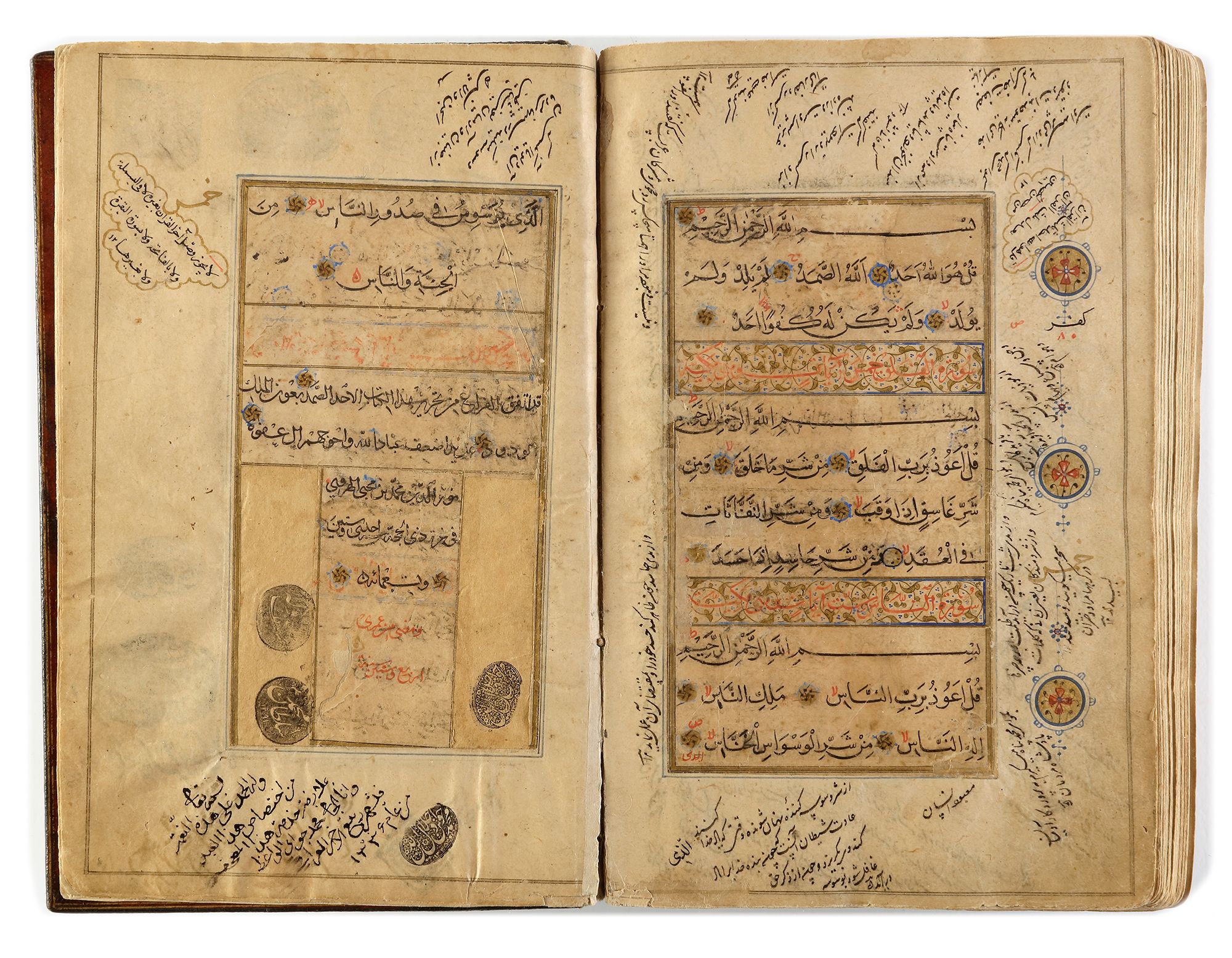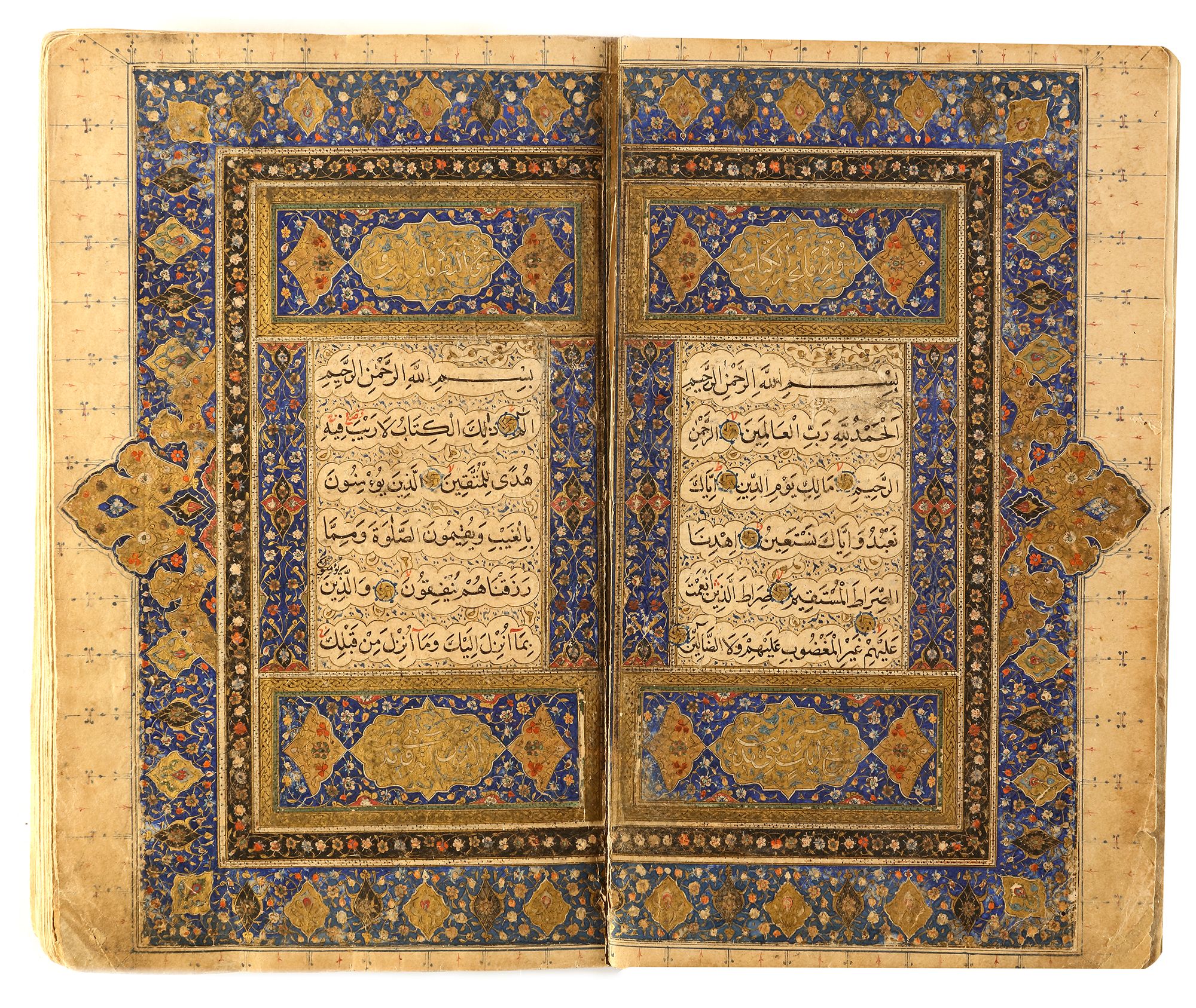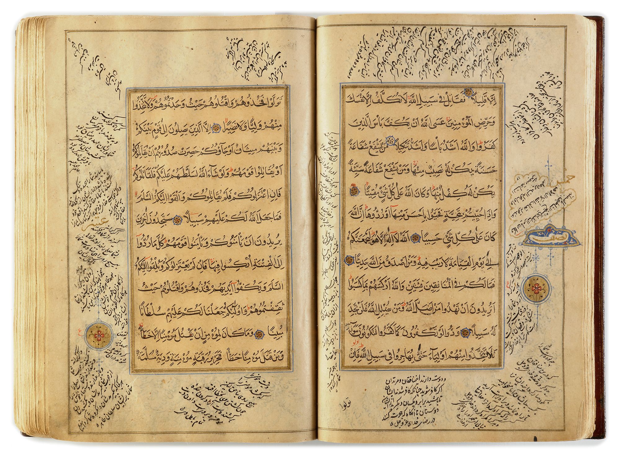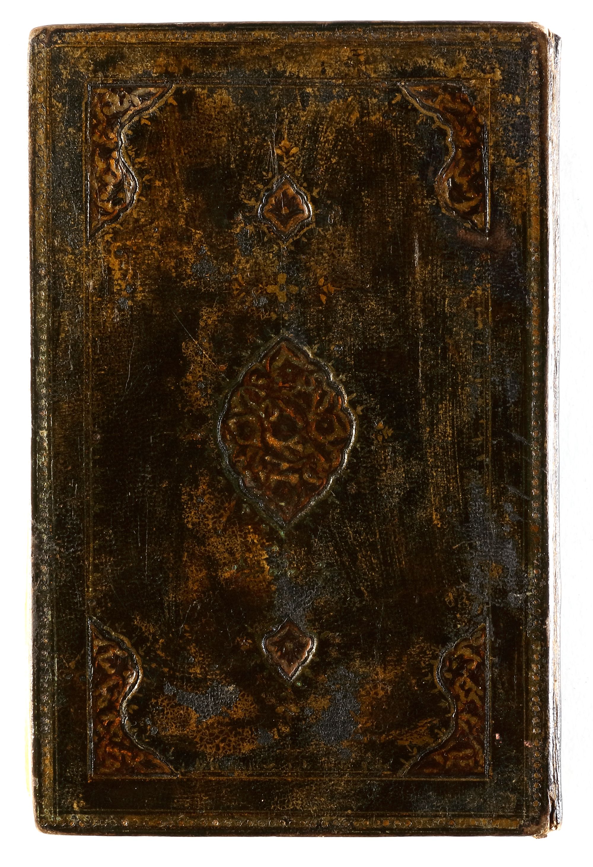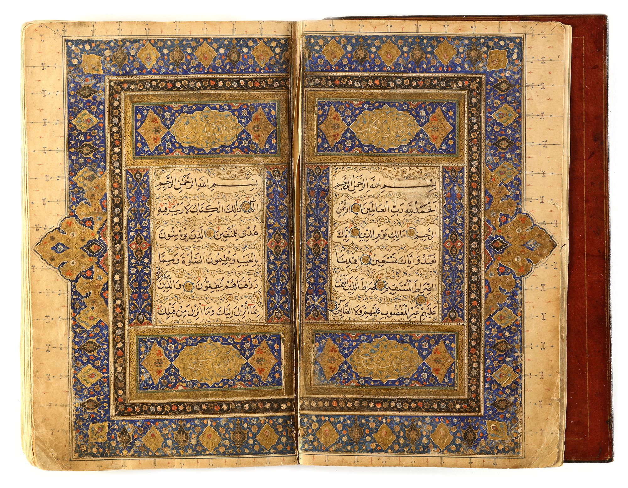 Arabic manuscript on paper, with 12 lines to each page, written in black naskh script, ruled in gold and blue borders. Gold rosette verse markers outlined and pointed in blue dots, two opening pages decorated in gold and striking blue with verses reserved in clouds on a cream-colored ground. Surah headings in white and red thuluth in cartridges decorated with gilt scrolling vines, illuminated marginal medallions marking ‘Juz’ and Hezb’. Marginal Persian tafsir notes in nastaliq script within a double gilt black border, several collections stamps. Brown leather binding adorned with polylobed medallions and spandrels with embossed floral decoration. Red leather case with golden patterns. Quran text panel: 8 by 13.5 cm. Page: 20.5 by 13 cm.